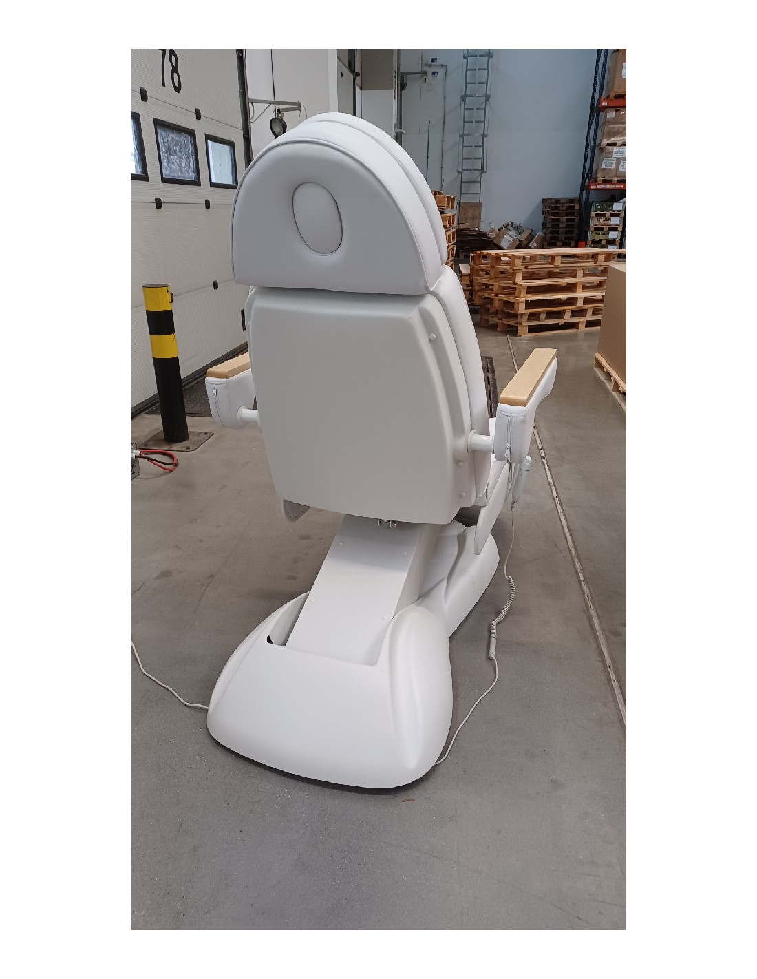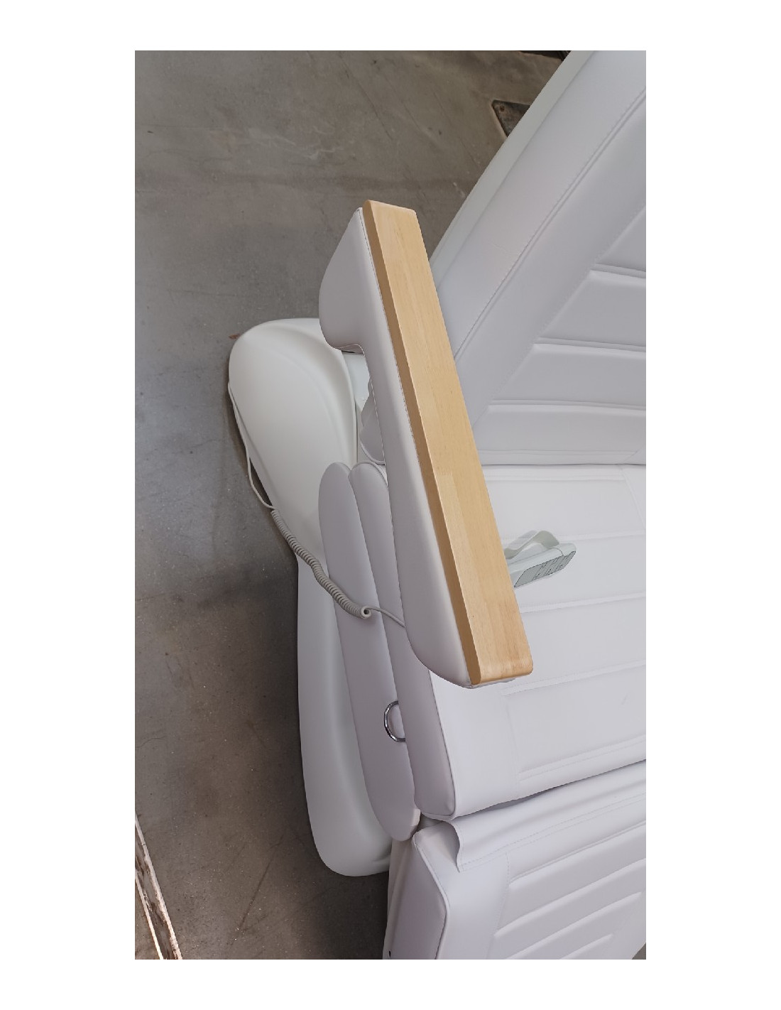 Pełne sterowanie pilotem doskonale ułatwia pracę. Poszycie fotela łatwo zmywalne, wykonane z eko-skóry spełniające rygorystyczne wymogi UE. Dodatkowo podłokietniki wykończone są drewnem, łatwo demontolwalne w razie potrzeby, a otwór w zagłówku pozwala na wykonywanie masażu.