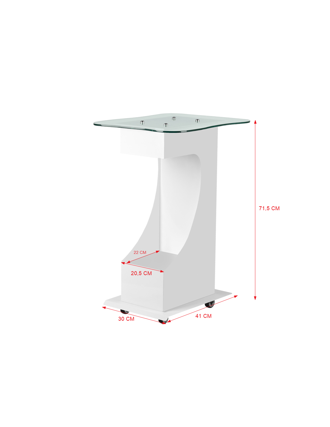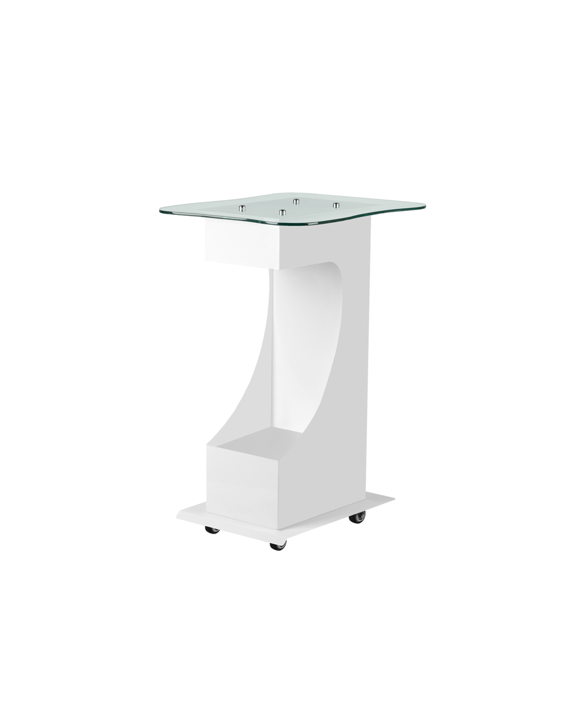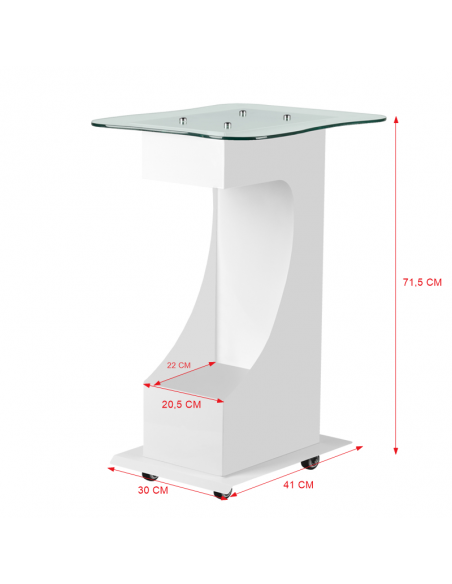 Funkcjonalny, metalowo-szklany stolik z gumowymi kółkami z funkcją blokady. Iidealnie sprawdza się jako stolik pod urządzenie kosmetyczne. Posiada stabilną półkę na urządzenie a dzięki kółką stolik jest mobilny i łatwy do przesuwania. Mebel zapewnia wygodę i komfort podczas pracy