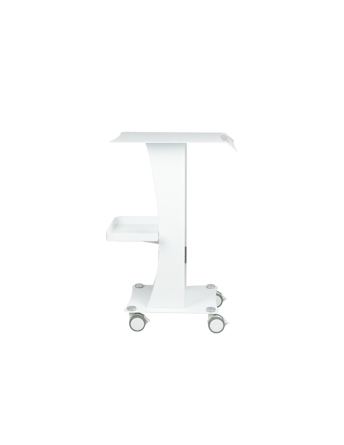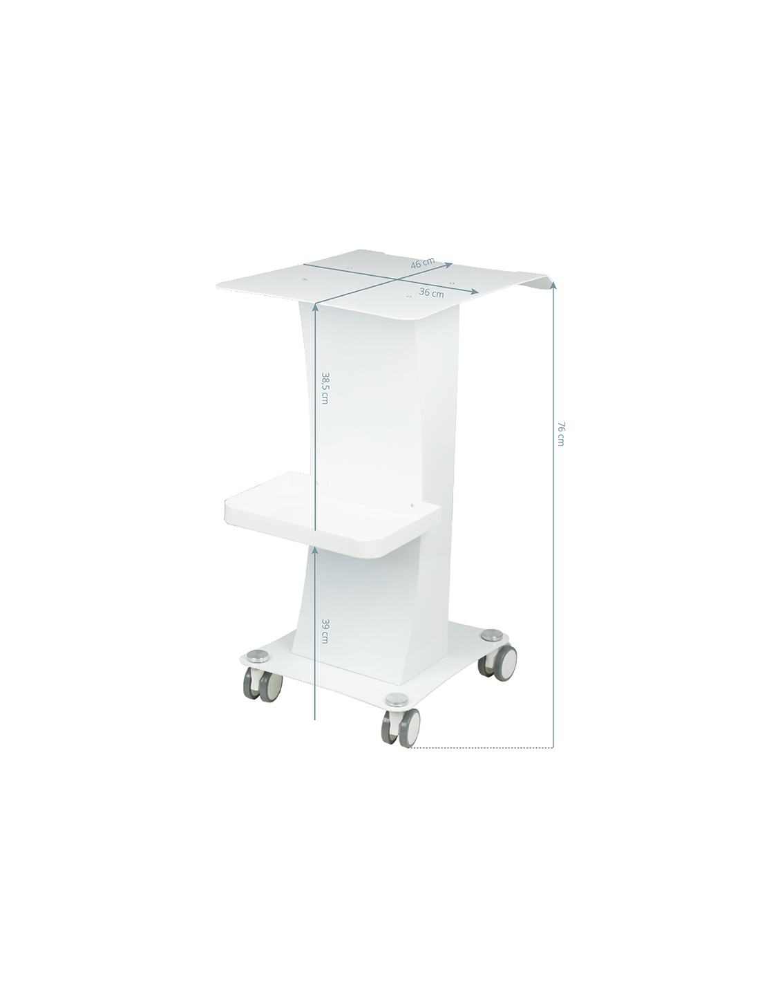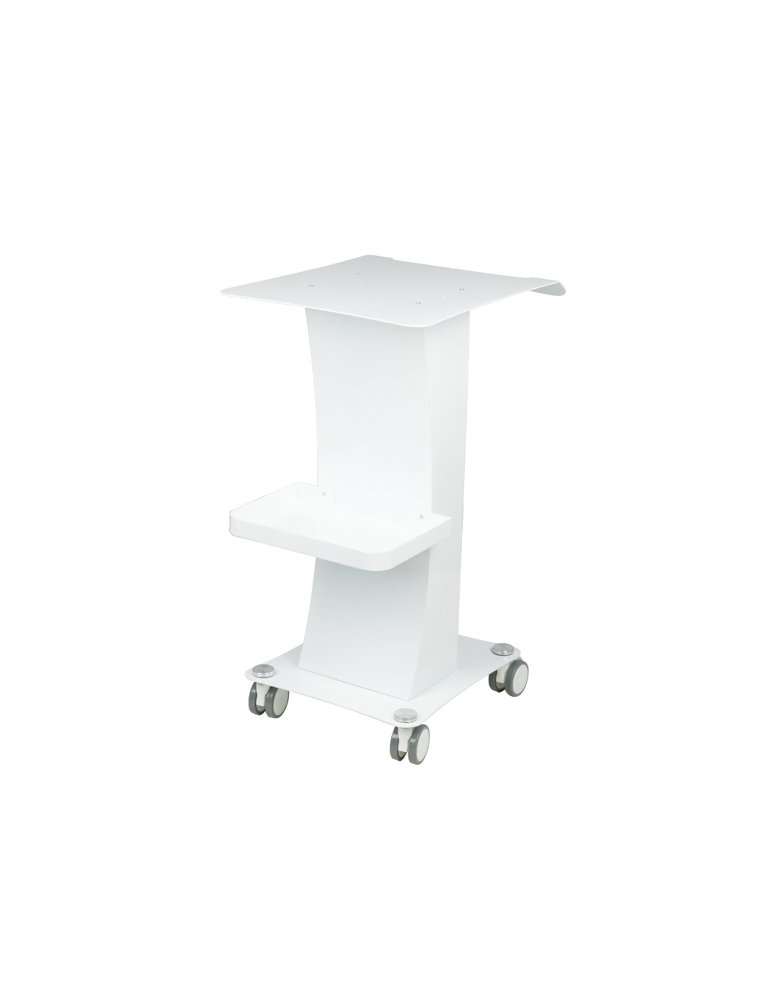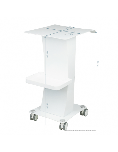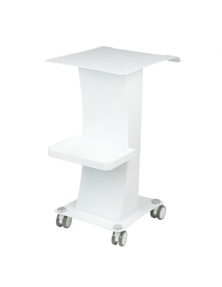Funkcjonalny, metalowy stolik z gumowymi kółkami z funkcją blokady. Idealnie sprawdza się jako stolik pod urządzenie kosmetyczne. Posiada stabilną półkę na urządzenie oraz drugą na akcesoria a dzięki kółką stolik jest mobilny i łatwy do przesuwania. Mebel zapewnia wygodę i komfort podczas pracy.
