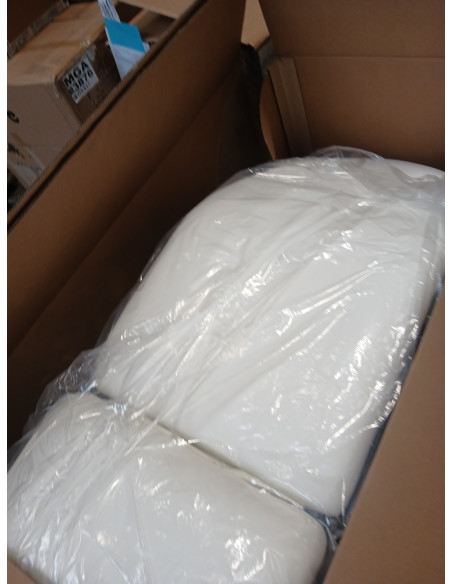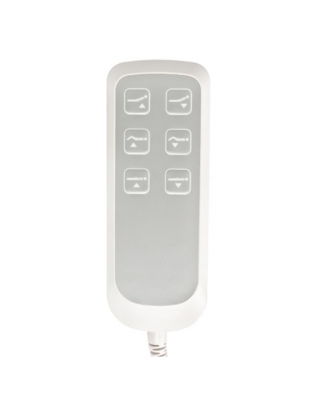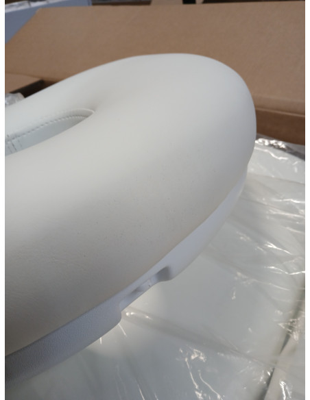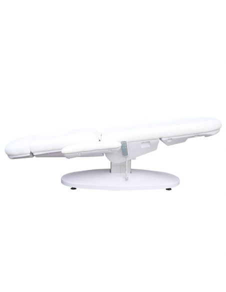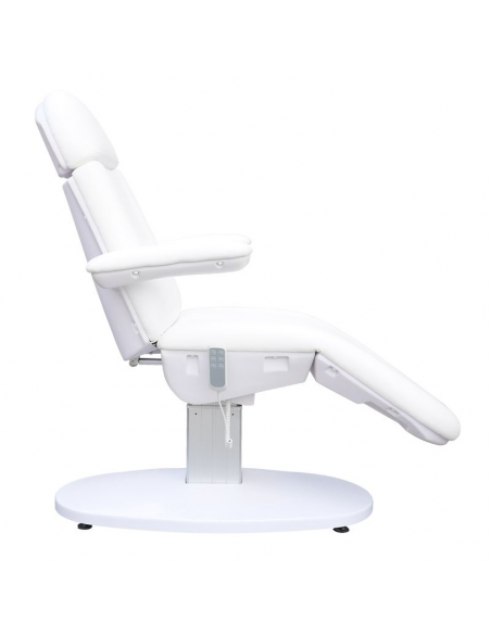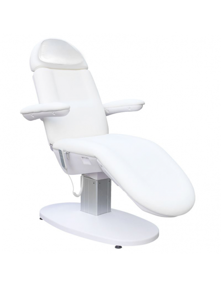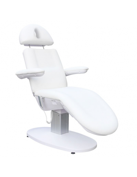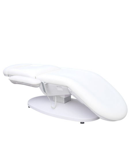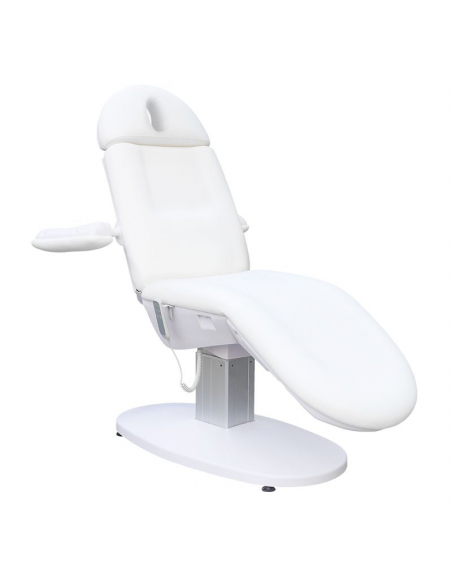Nowoczesny, estetyczny fotel kosmetyczny sterowany pilotem, o opływowym kształcie z zagłówkiem z otworem. Wykonany z eko-skóry spełniającej rygorystyczne wymogi UE. Fotel posiada możliwość elektrycznego regulowania wysokości, oparcia, kołyski oraz podnóżka.