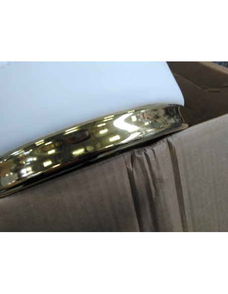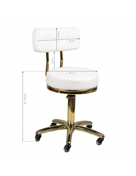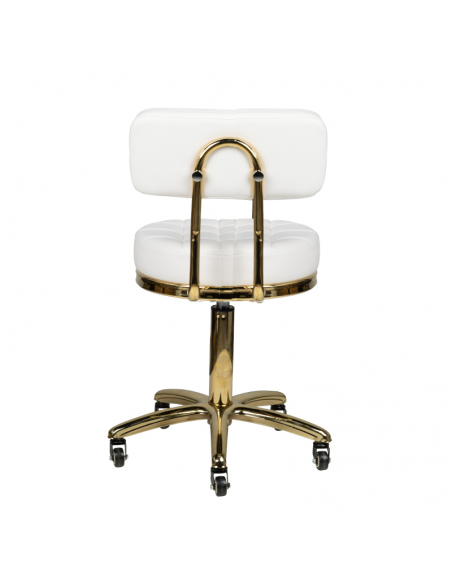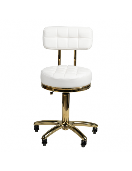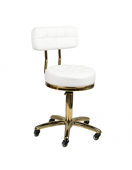 Wyjątkowy taboret kosmetyczny w kolorze białym z pikowanym siedziskiem i wygodnym oparciem. Elementy metalowe pięnie błyszczą złotym kolorem. Posiada regulację wysokości i pęcioramienną podstawę wyposażoną jest w solidne metalowo-gumowe kółka.