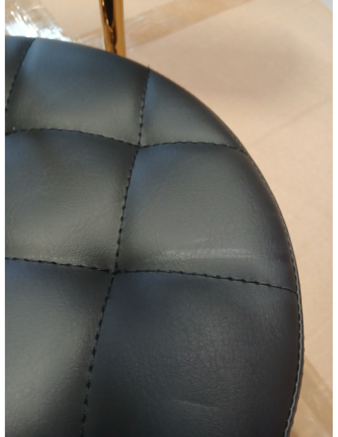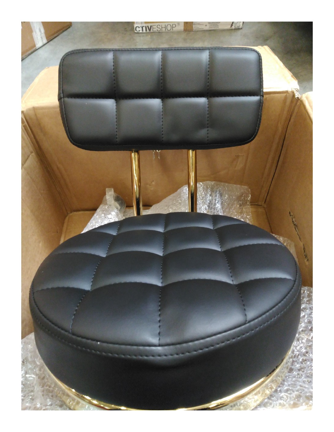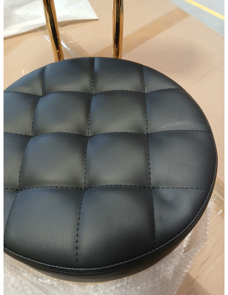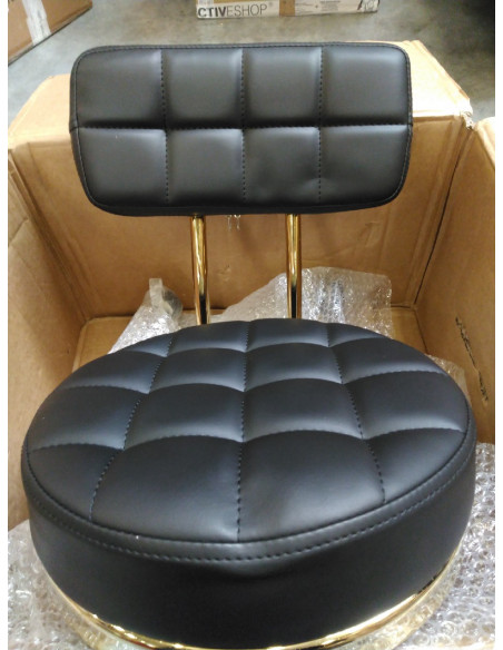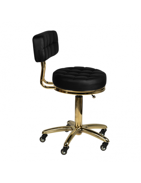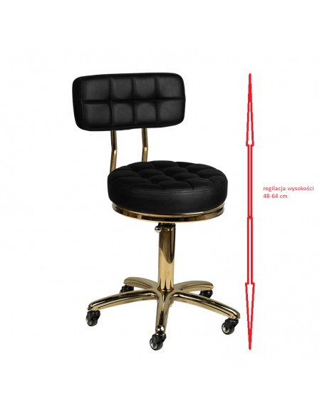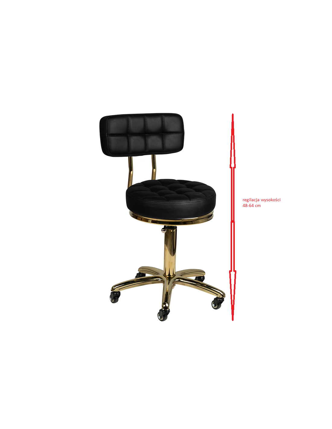 Wyjątkowy taboret kosmetyczny w kolorze czarnym z ekoskóry. Wygodne pikowane siedzisko i oparcie pięknie się prezentuje w każdym salonie kosmetycznym. Elementy metalowe pięknie błyszczą złotym kolorem. Posiada regulację wysokości i pięcioramienną podstawę wyposażoną jest w solidne metalowo-gumowe kółka.