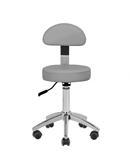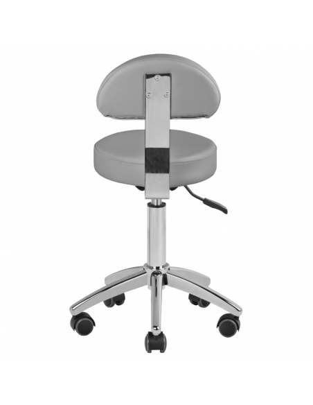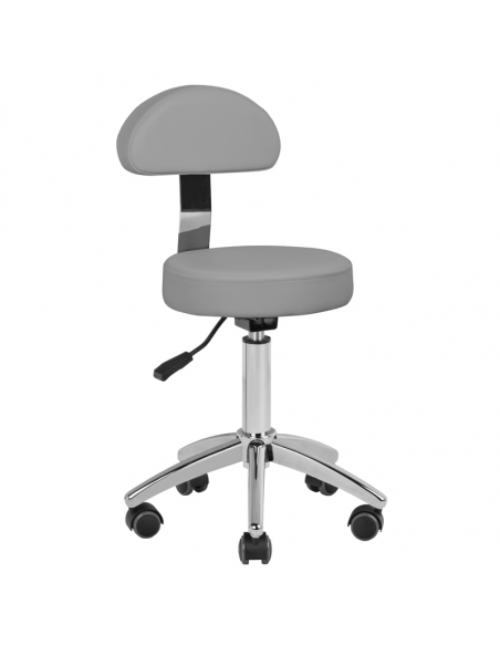 Wygodny taboret kosmetyczny, stabilny na pięcioramiennej podstawie, z gumowanymi kółkami, z możliwością demontażu oparcia, w kolorze białym, niezbędny mebel w gabinecie kosmetycznym.