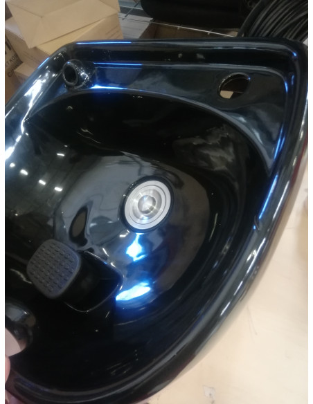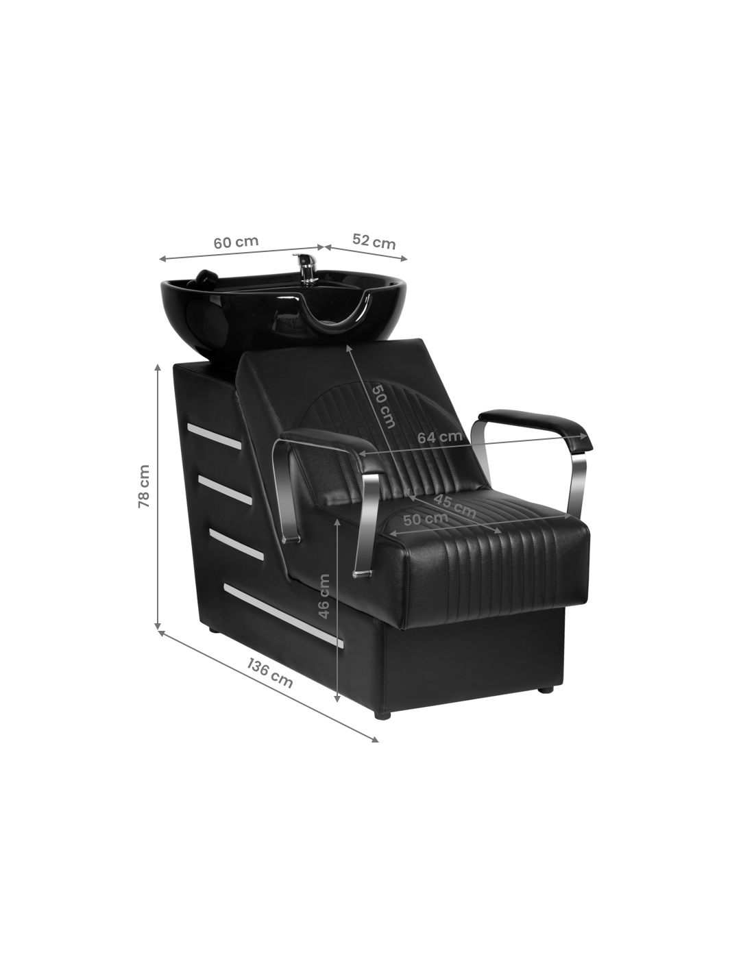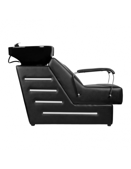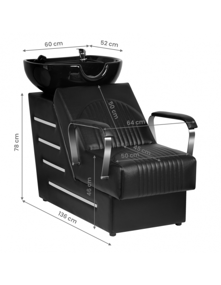 Nowoczesna myjnia fryzjerska marki Gabbiano -połączenie funkcjonalności w włoska elegancją. Myjnia wykonana jest z najwyższej jakości materiałów i doskonale wykończona. Wiemy jak ważny jest komfort klienta podczas zabiegów, dlatego specjalna konstrukcja zapewnia klientowi solidne podparcie głowy w czasie mycia. Miękkie, wygodne siedzisko pokryte jest wysokiej jakości ekoskórą. Czerń kontrastująca ze metalicznym odcieniem podłokietników czyni z powyższej myjni element uniwersalny, pasujący niemal do każdego wnętrza niezależnie od jego kolorystyki.