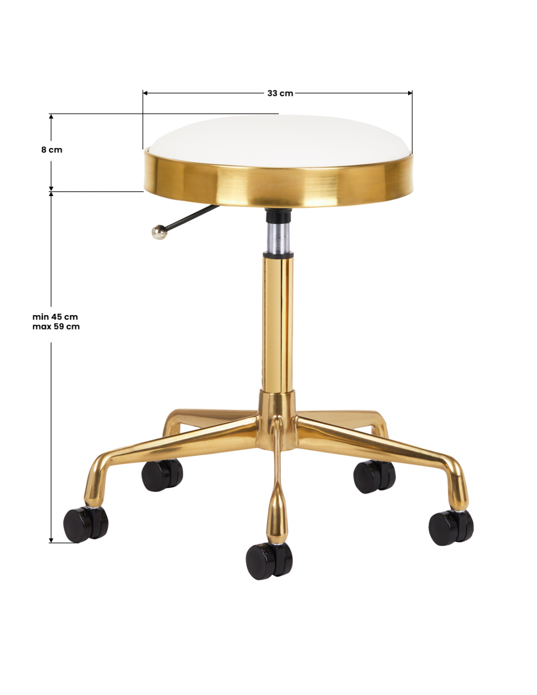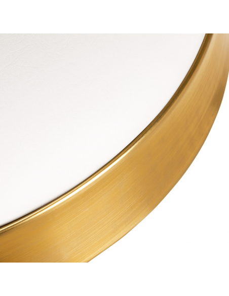 Ten złoty taboret ma wygodne białe siedzisko pokryte skórą ekologiczną. Znajduje się na stabilnej pięcioramiennej podstawie. Stworzony ze stopów metali, jest trwały i odporny na zniszczenia. Wysokość siedziska jest sprawnie regulowana. Plastikowe kółka pozwalają na łatwą zmianę położenia. Siedzisko jest w pełni obrotowe.