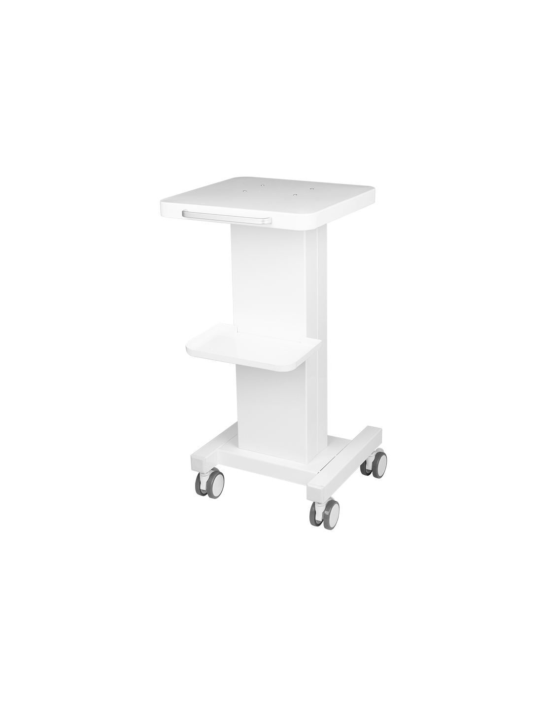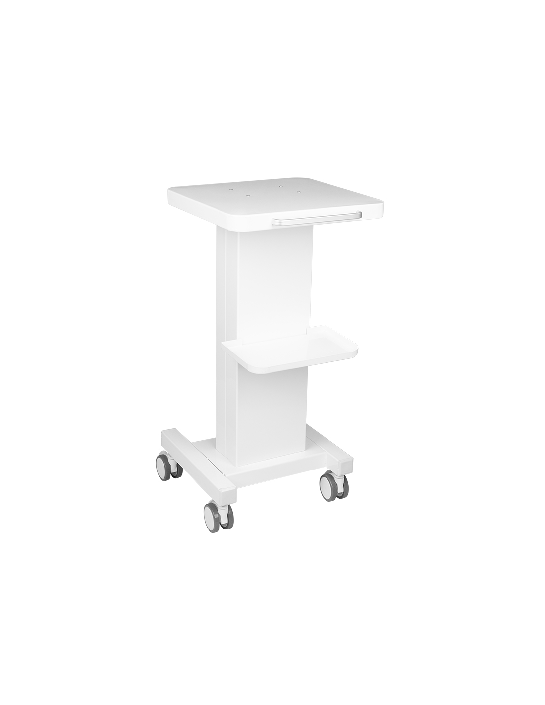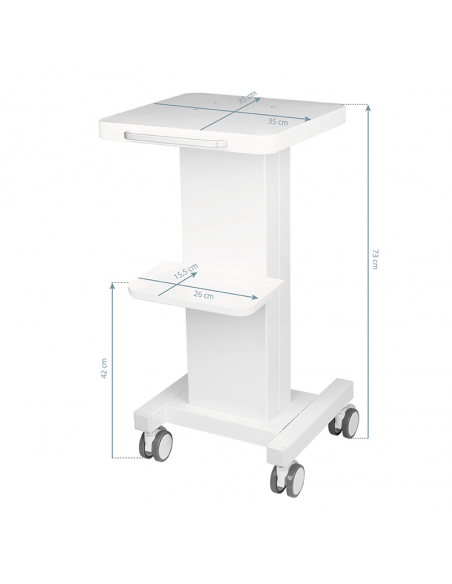 Funkcjonalny, metalowy stolik z gumowymi kółkami z funkcją blokady. Idealnie sprawdza się jako stolik pod urządzenie kosmetyczne. Posiada stabilną półkę na urządzenie oraz drugą na akcesoria a dzięki kółkom stolik jest mobilny i łatwy do przesuwania. Mebel zapewnia wygodę i komfort podczas pracy