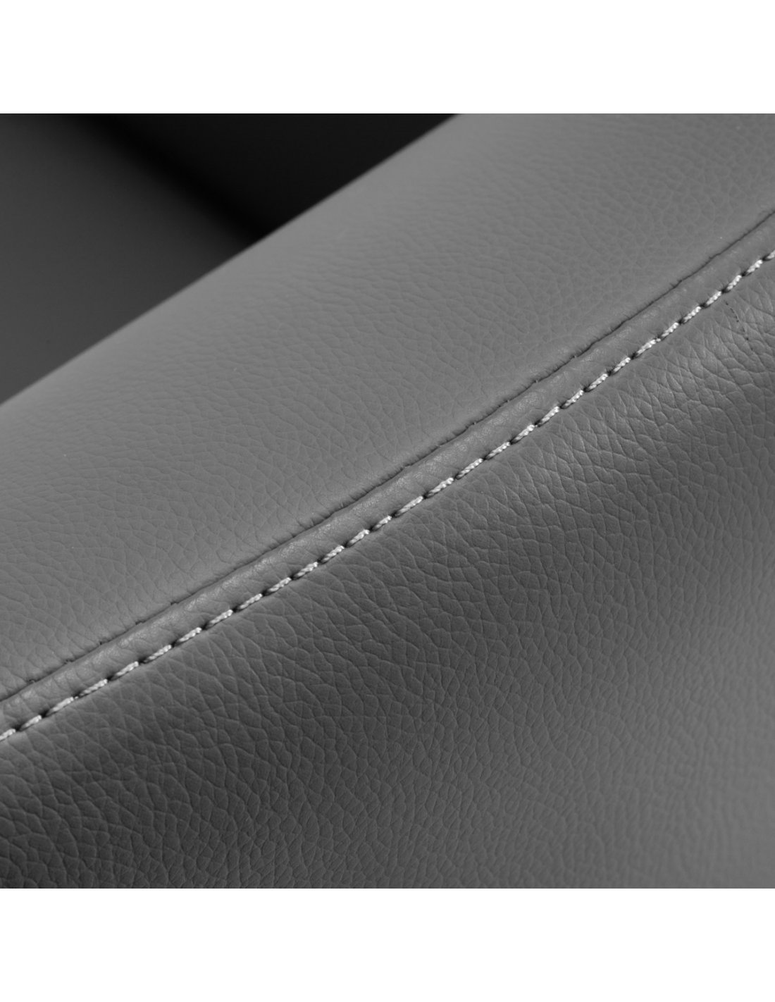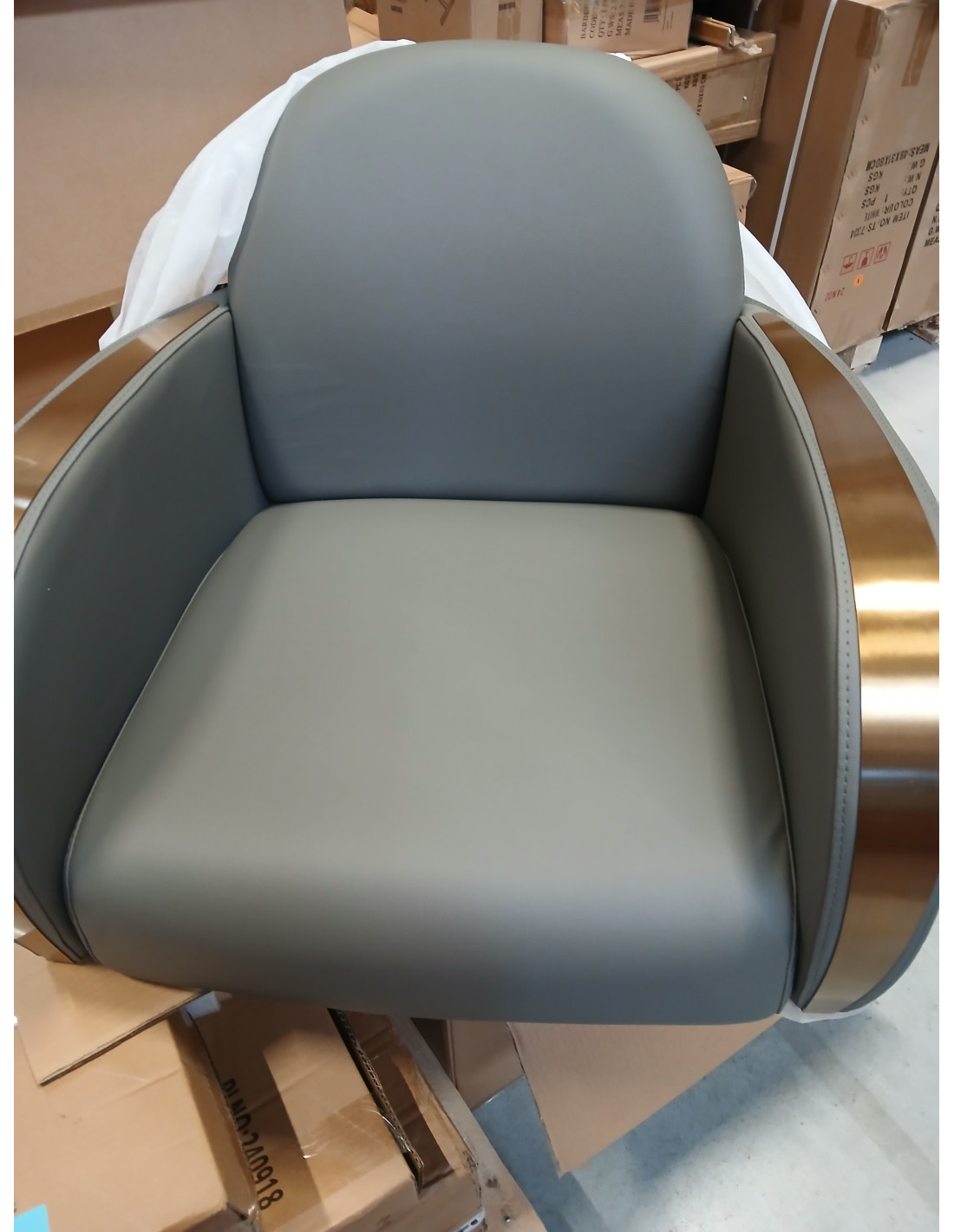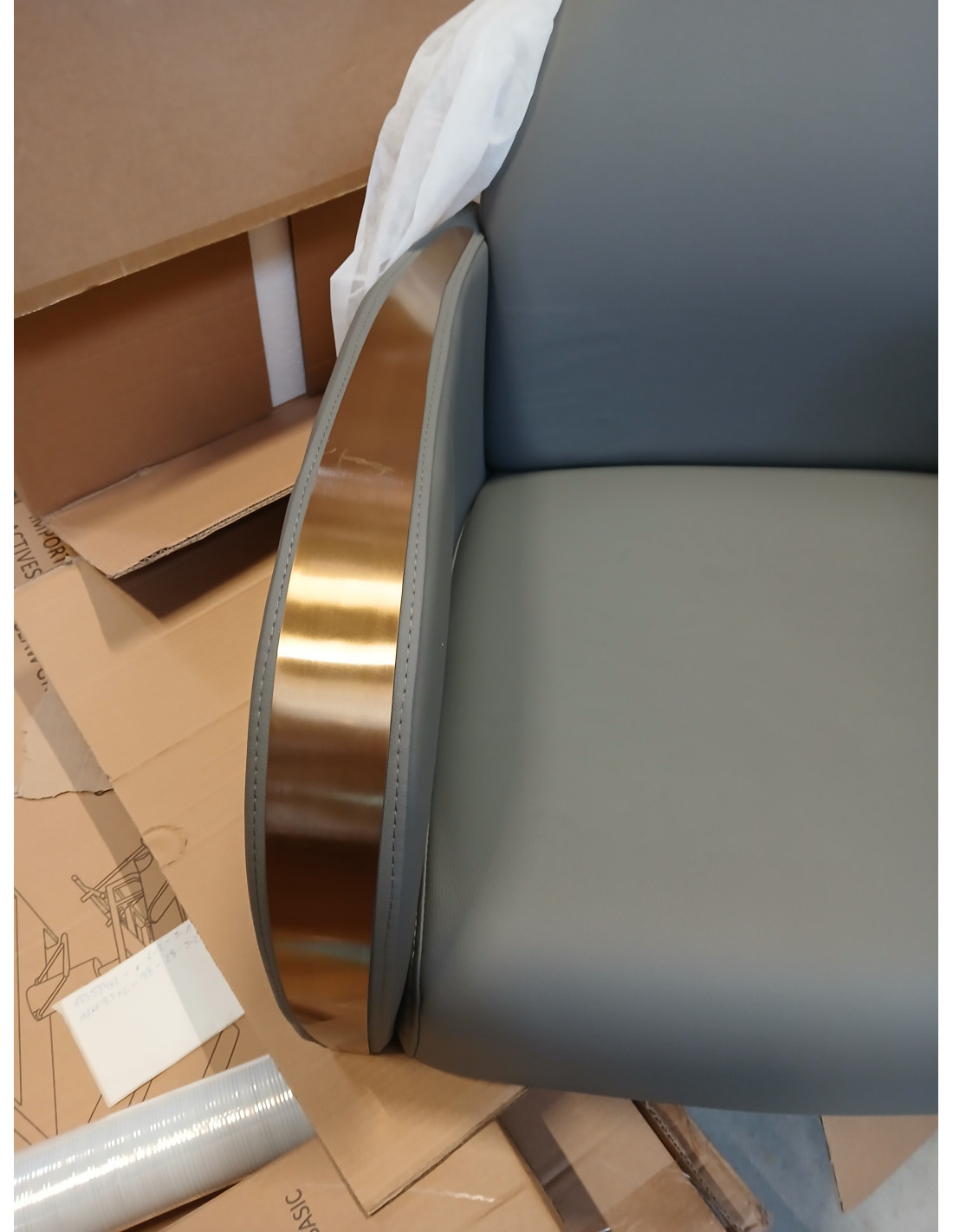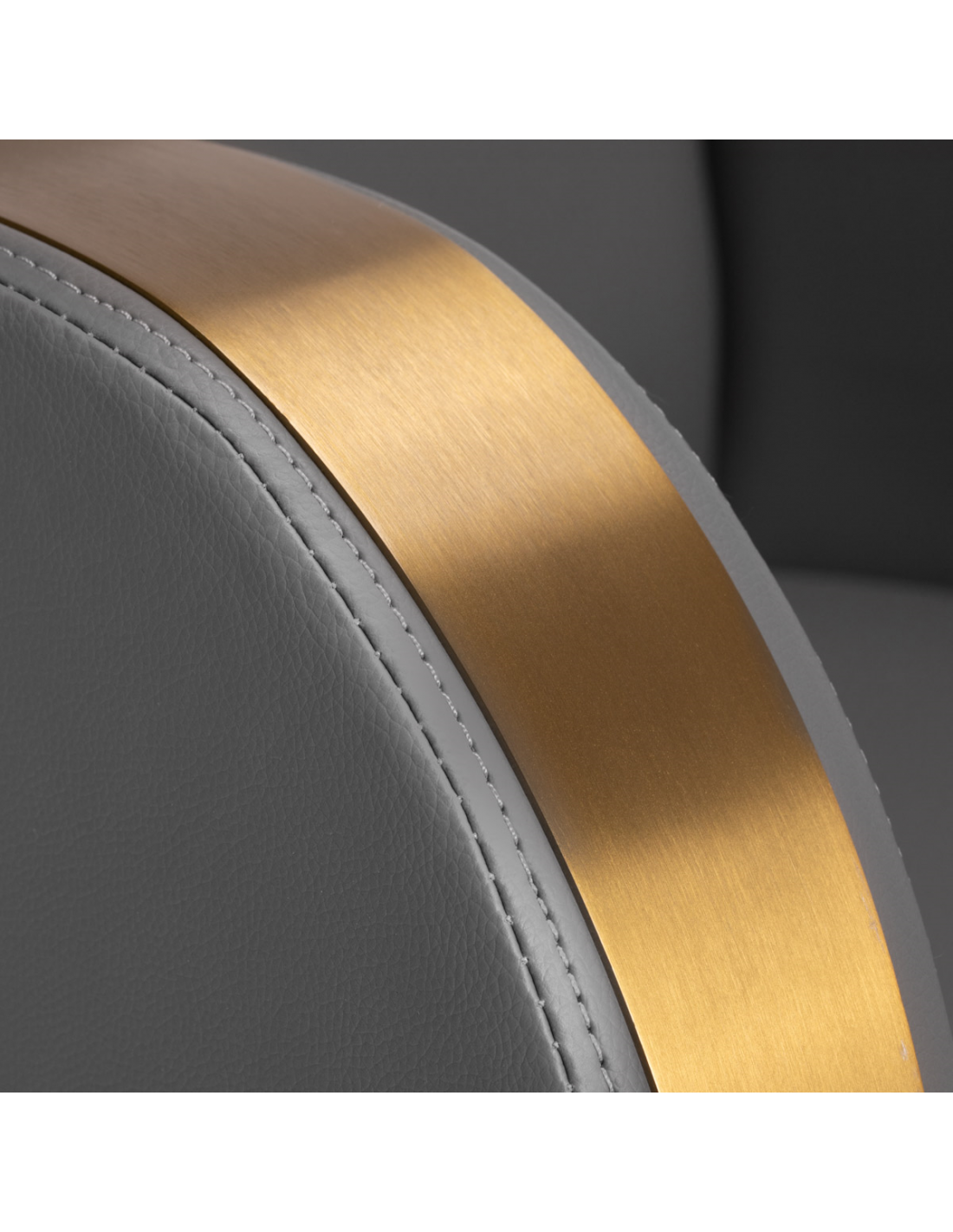 Fotel wypełniony jest pianką, która jest trwała i nie odkształca się, zapewniając komfortowe użytkowanie przez długi czas. Obicie wykonane jest z przyjemnej w dotyku imitacji skóry o specyficznej strukturze. Dzięki użyciu takiego materiału, sprzęt jest odporny na wilgoć, wytrzymały i łatwy w czyszczeniu. Pokrycie w odcieniach szarości oraz ozdobne powierzchnie metalowe lakierowane w barwach złota nadają mu wyraz ponadczasowej elegancji. Wyróżniające go klasyczne wykończenie sprawia, że będzie doskonale prezentować się w niemal każdej przestrzeni.
