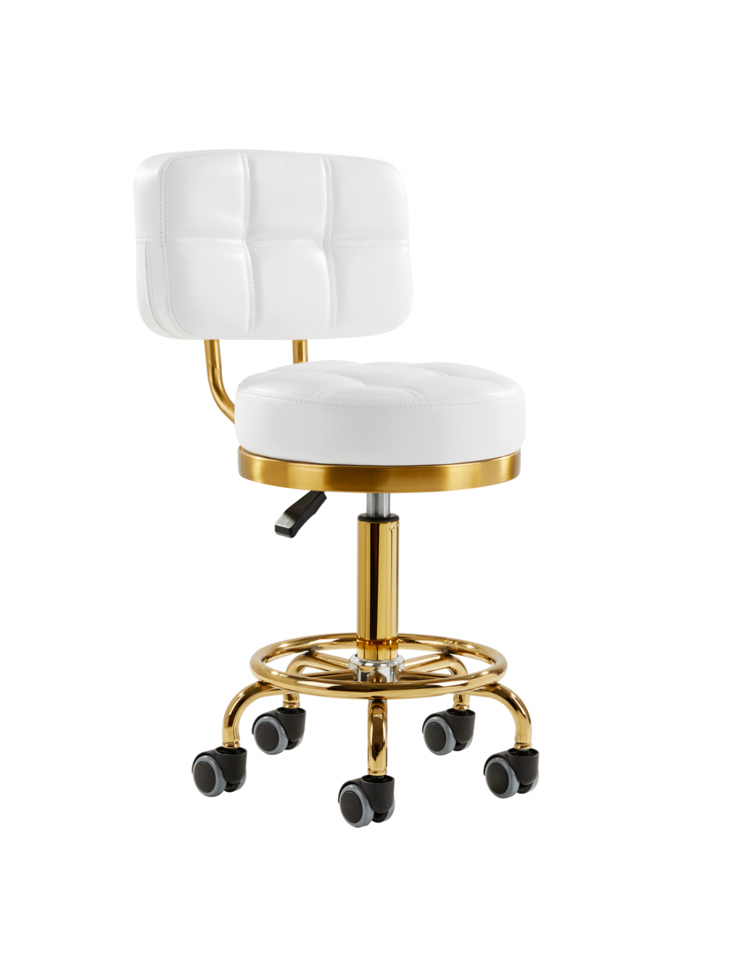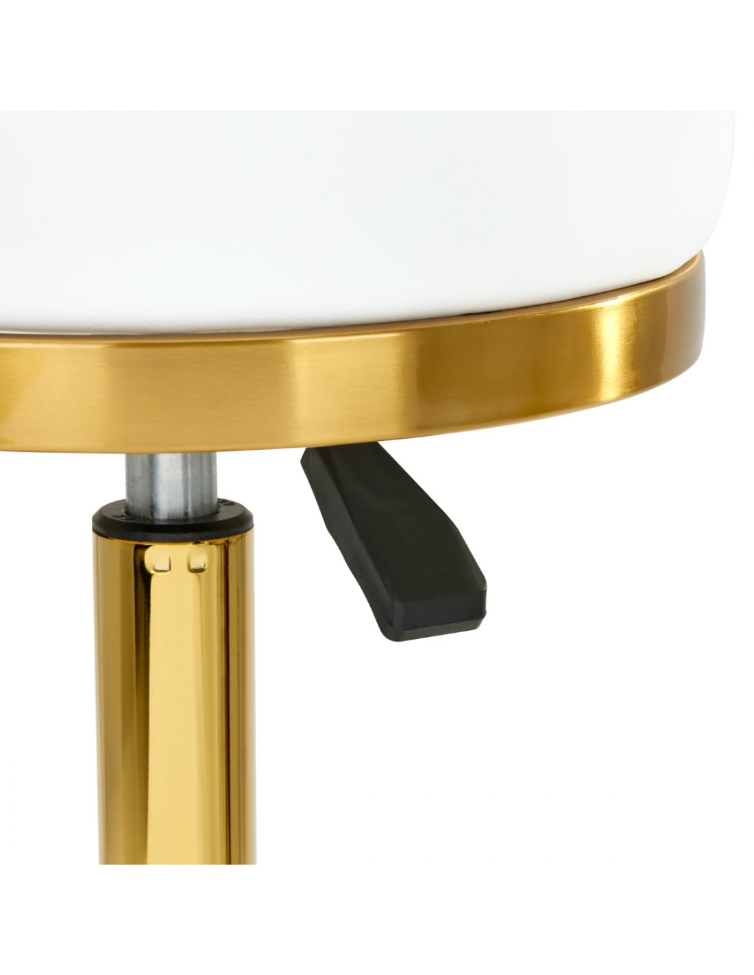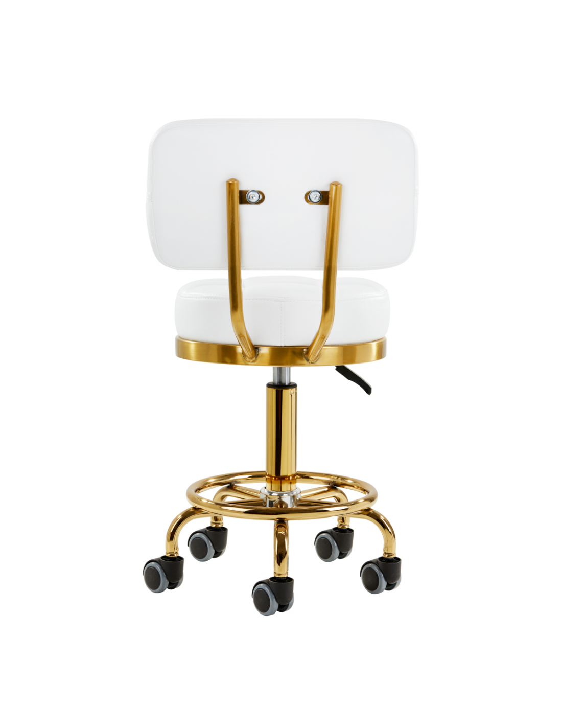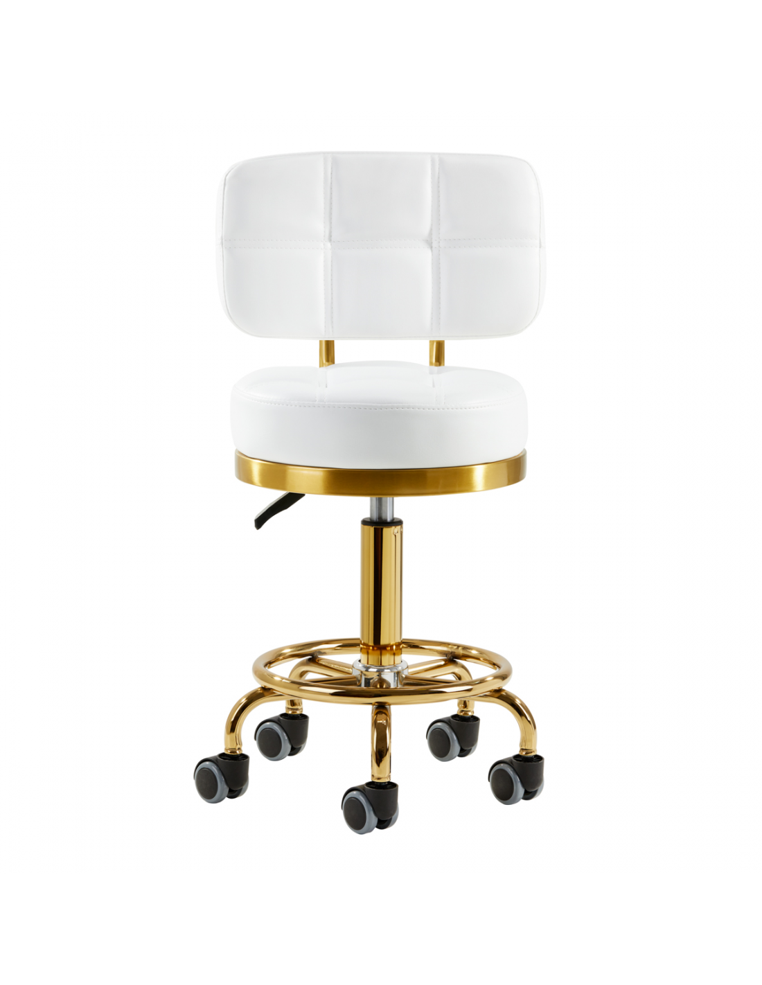 Pięcioramienna podstawa zapewnia stabilność oraz poczucie bezpieczeństwa, nawet podczas bardziej dynamicznych ruchów i częstych zmian pozycji. Wyposażenie w wytrzymałe koła zapewnia wysoką mobilność, co pozwala na swobodne przemieszczanie się po salonie czy gabinecie. Obicie ze skóry syntetycznej w odcieniach bieli które jest nie tylko trwałe, ale także łatwe do utrzymania w czystości. Estetyczne obszycia i pikowanie nadają mu wyjątkowy wygląd, a złote elementy ozdobne dodają luksusowego charakteru, który przyciąga uwagę. Wyjątkowe połączenie elegancji oraz komfortu czyni taboret niezastąpionym narzędziem w pracy każdego profesjonalisty.