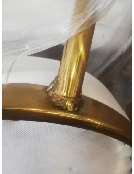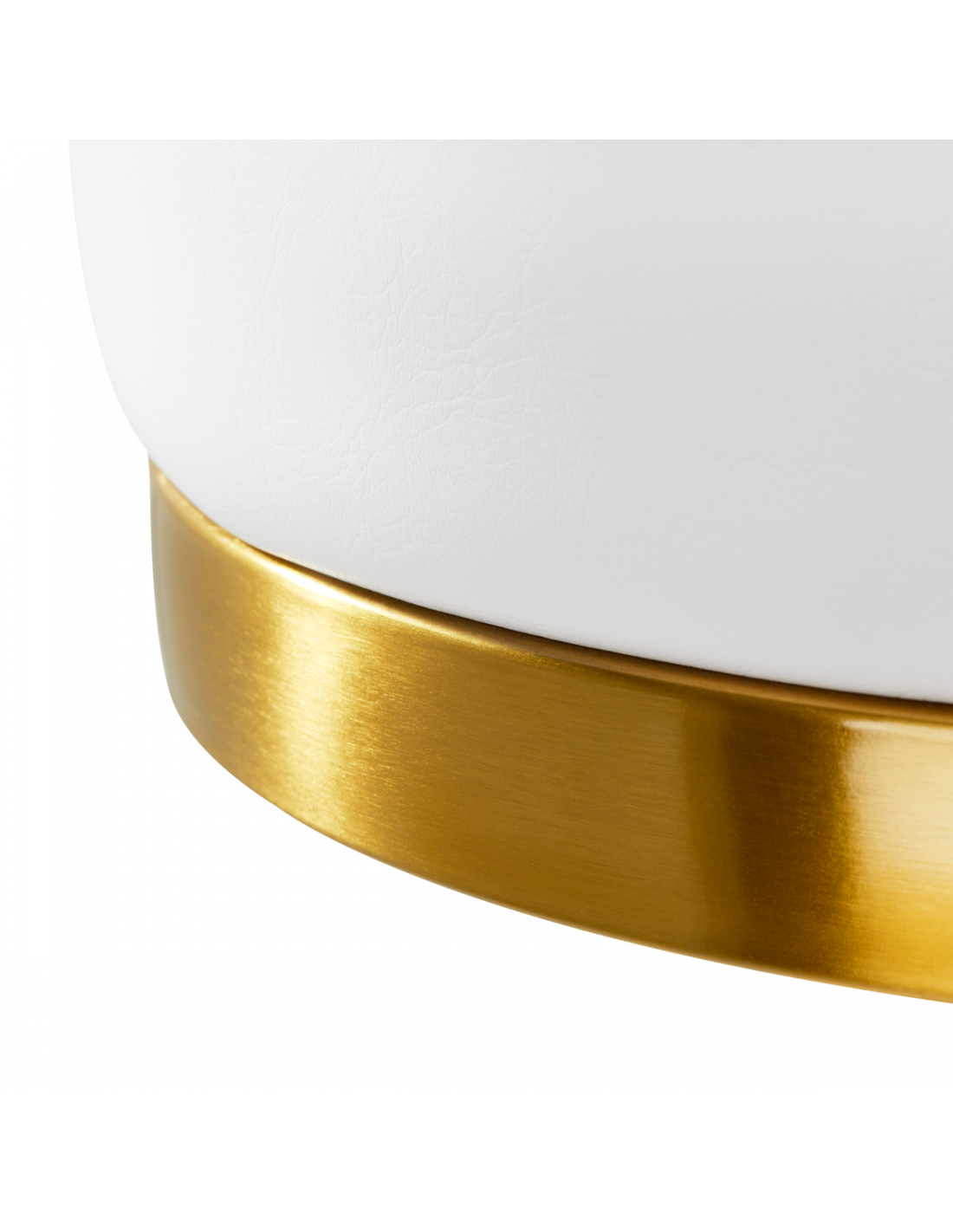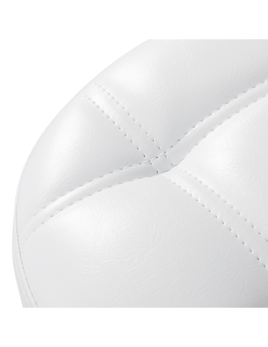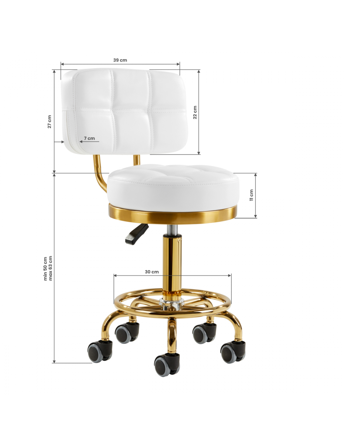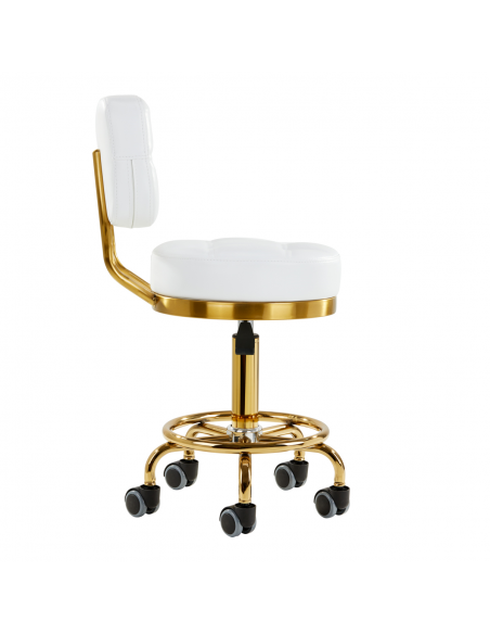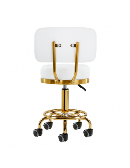 Pięcioramienna podstawa zapewnia stabilność oraz poczucie bezpieczeństwa, nawet podczas bardziej dynamicznych ruchów i częstych zmian pozycji. Wyposażenie w wytrzymałe koła zapewnia wysoką mobilność, co pozwala na swobodne przemieszczanie się po salonie czy gabinecie. Obicie ze skóry syntetycznej w odcieniach bieli które jest nie tylko trwałe, ale także łatwe do utrzymania w czystości. Estetyczne obszycia i pikowanie nadają mu wyjątkowy wygląd, a złote elementy ozdobne dodają luksusowego charakteru, który przyciąga uwagę. Wyjątkowe połączenie elegancji oraz komfortu czyni taboret niezastąpionym narzędziem w pracy każdego profesjonalisty.