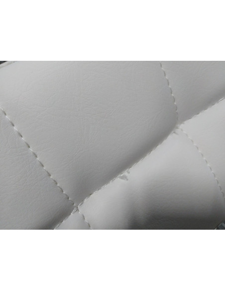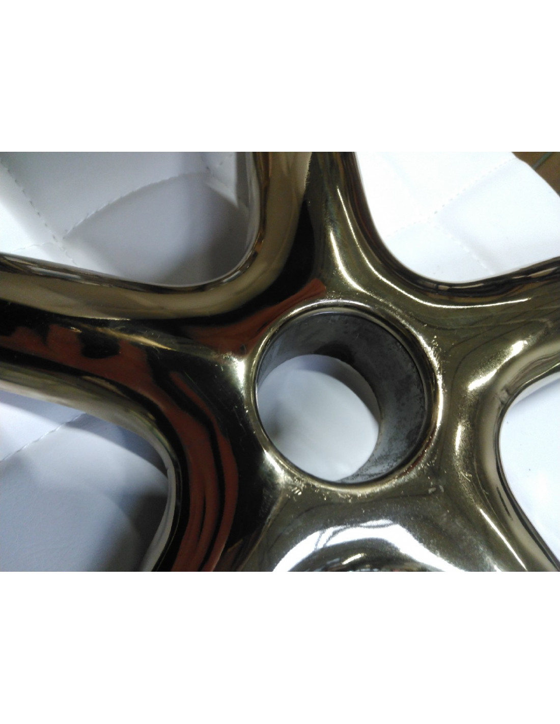 Wyjątkowy taboret kosmetyczny w kolorze białym z pikowanym siedziskiem i wygodnym oparciem. Elementy metalowe pięnie błyszczą złotym kolorem. Posiada regulację wysokości i pęcioramienną podstawę wyposażoną jest w solidne metalowo-gumowe kółka.