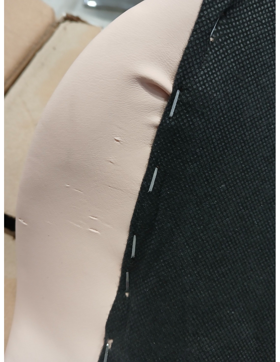 Pięcioramienna podstawa w odcieniach złota wyposażona jest w kółka, które zapewniają znaczną mobilność, ułatwiając łatwe przemieszczanie mebla po gabinecie. Obicie taboretu wykonano z przyjemnej w dotyku imitacji skóry w odcieniach różu. Dzięki użyciu takiego materiału taboret jest trwały, odporny na wilgoć i łatwy w czyszczeniu.