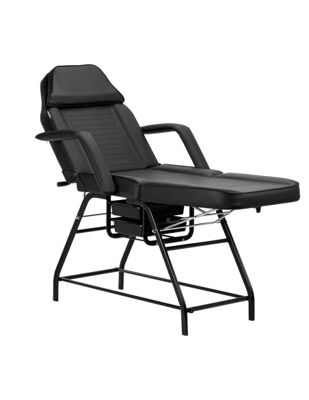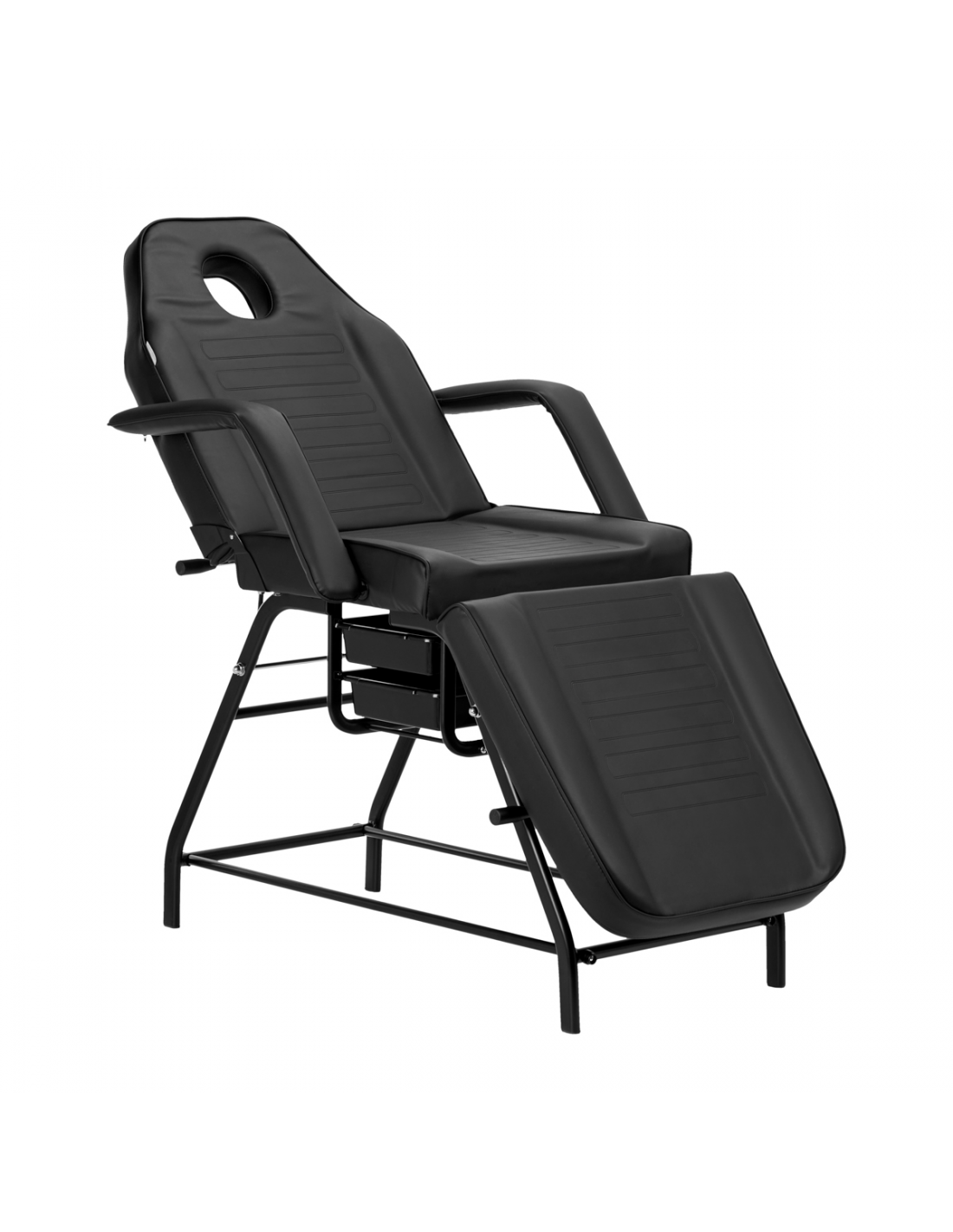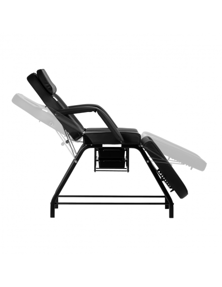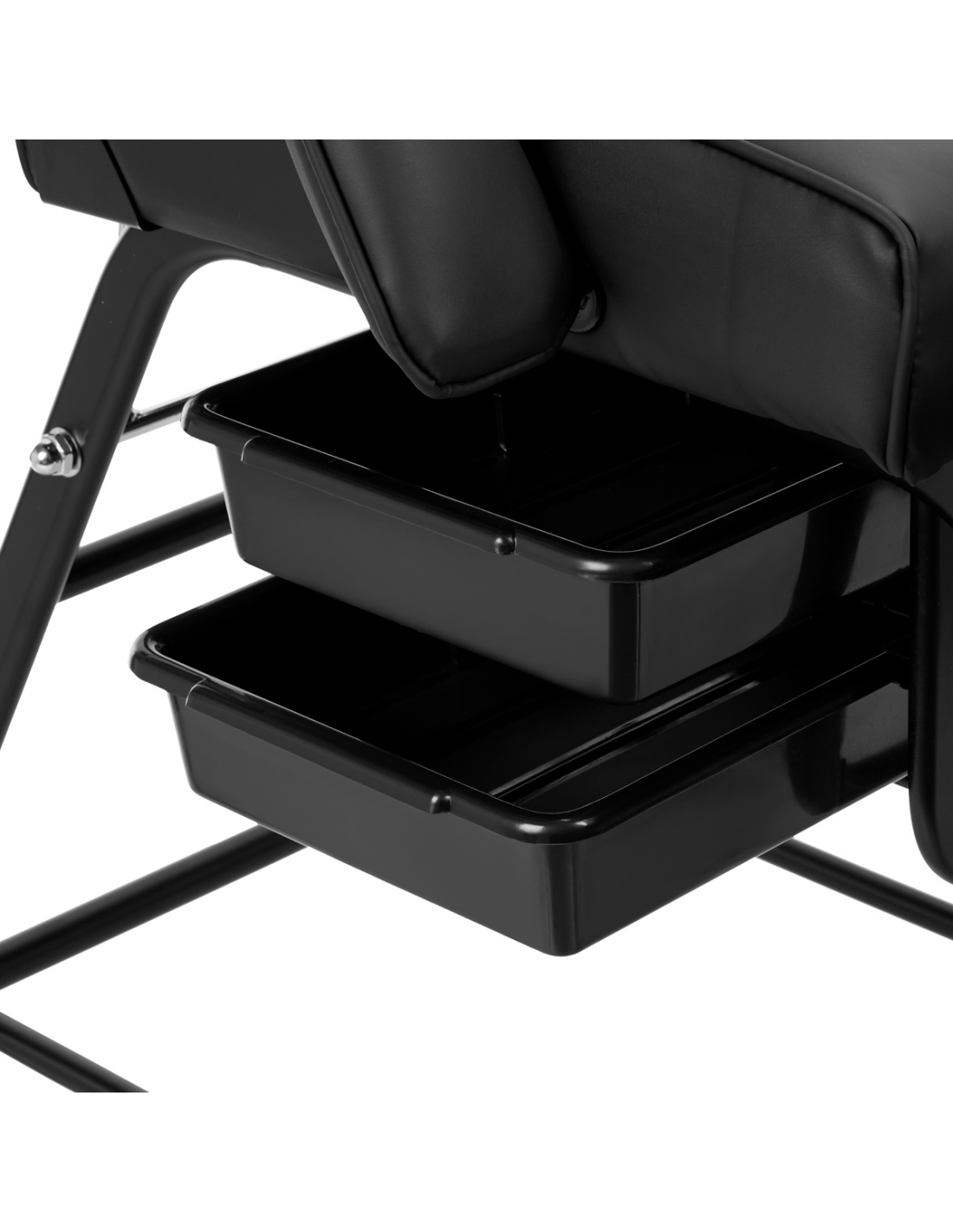 Praktyczne kuwety z tworzywa sztucznego umieszczone pod siedziskiem zapewniają łatwy dostęp do najpotrzebniejszych przyrządów. Wysuwane pojemniki są trwałe i łatwe w czyszczeniu, a dodatkowo pomagają utrzymać porządek na stanowisku pracy. Dzięki otworowi w zagłówku, który jest ukryty pod odpowiednio wyprofilowaną poduszką, fotel doskonale sprawdzi się przy zabiegach przeprowadzanych na plecach, takich jak masaże.