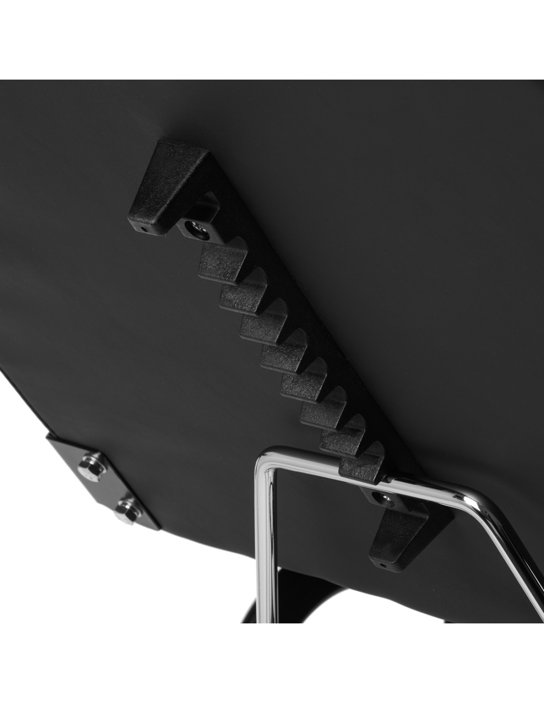 Metalowy stelaż dzięki półmatowemu wykończeniu oraz opływowo wyprofilowanym nóżkom wygląda elegancko i nie przytłacza przestrzeni. Podstawa fotela nie umożliwia regulacji wysokości siedziska, jednak znajduje się ono na wysokości, które powinna być komfortowa w trakcie użytkowania. Fotel wypełniony jest pianką i pokryty imitacją skóry w odcieniach czerni. Dzięki użyciu takiego materiału, sprzęt jest komfortowy w użytkowaniu, odporny na wilgoć oraz łatwy w czyszczeniu. Odpowiednio wyprofilowane obszycia nadają ergonomiczny kształt siedzisku. Prosty design i klasyczna kolorystyka pozwalają mu wpasować się w każde wnętrze.