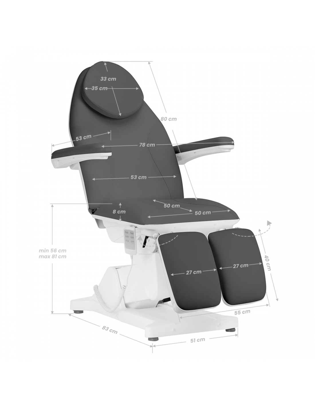 Przy pomocy intuicyjnego pilota fotel można płynnie dostosowywać w 3 płaszczyznach – posiada regulację wysokości, oparcia oraz kołyski. Siedzisko można ustawić na wysokości od 56 cm do 81 cm, a przy całkowitym rozłożeniu fotel osiąga długość około 1,9 m. Wymiary te pozwalają na łatwe korzystanie ze sprzętu osobom o różnym wzroście i umożliwiają dostosowanie go do indywidualnych potrzeb zarówno klienta, jak i osoby wykonującej zabieg. Uchwyt znajdujący się po prawej stronie siedziska służy wygodnemu odwieszeniu pilota tak, by nie przeszkadzał w trakcie zabiegów.