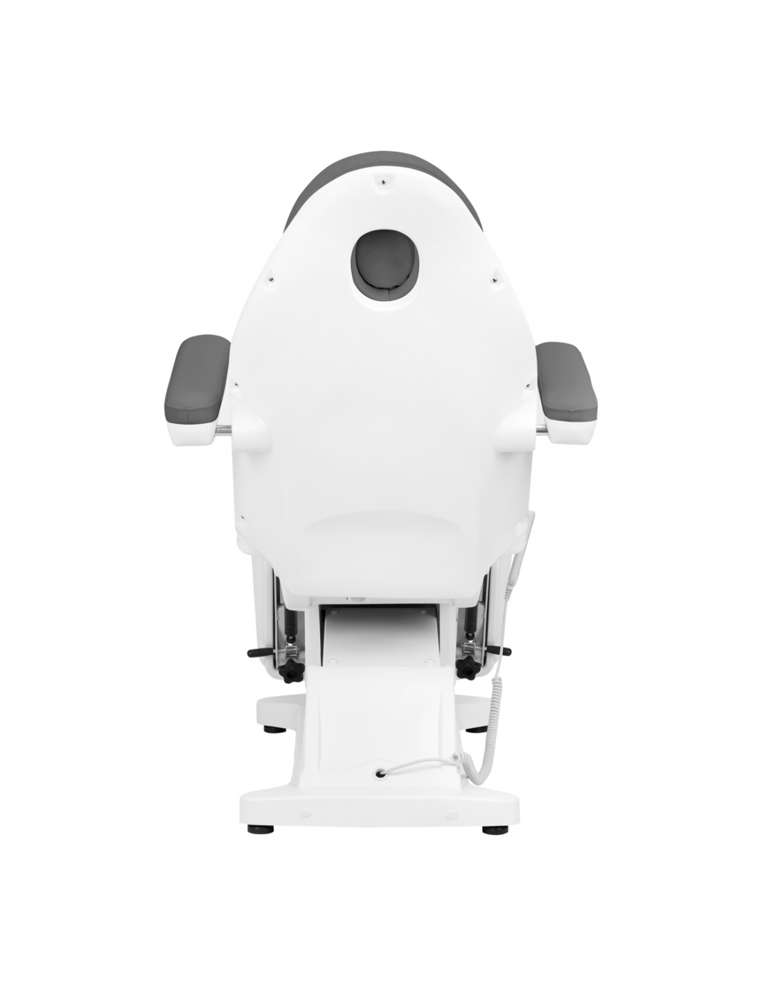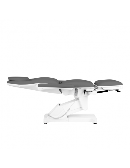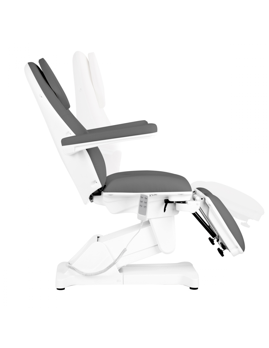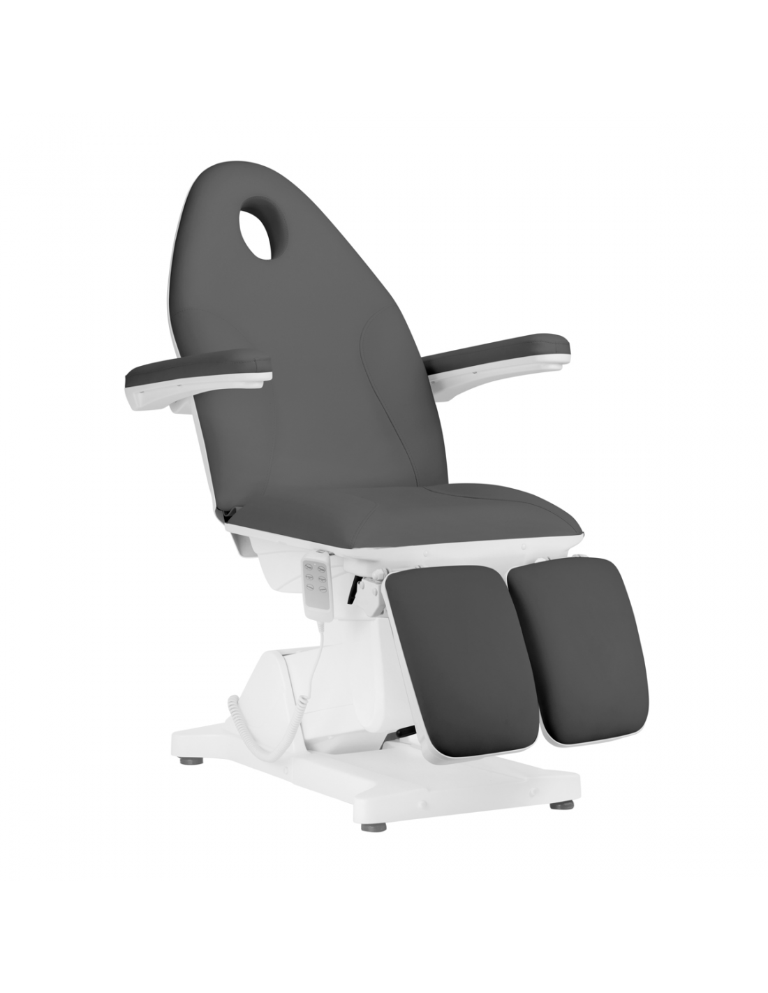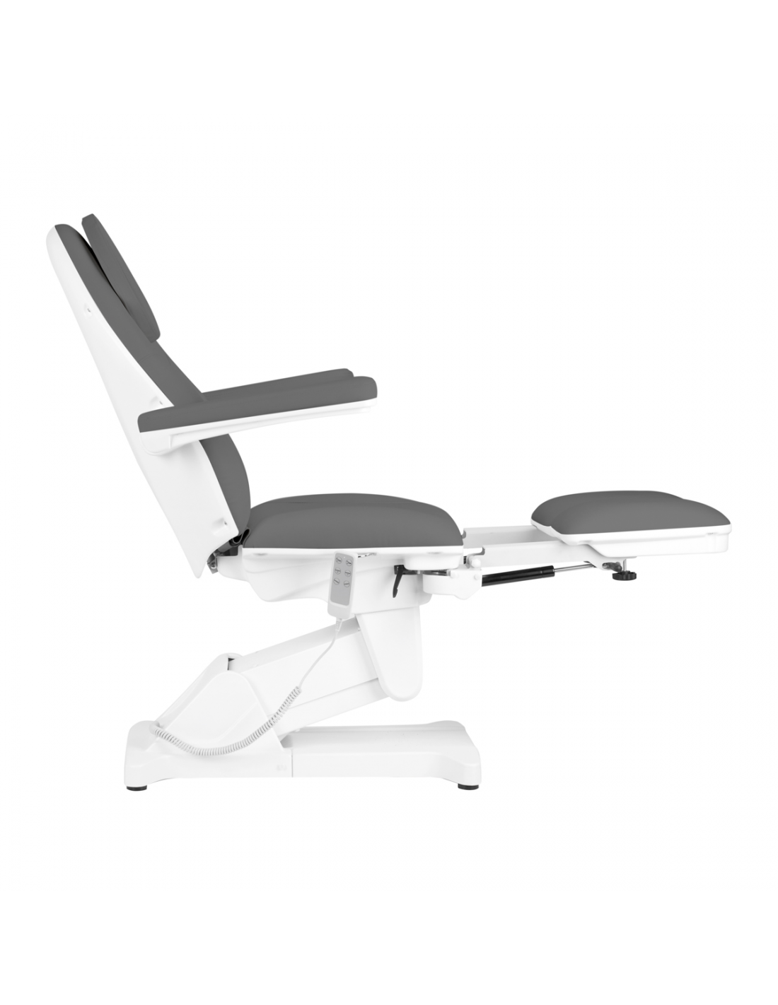 Fotel doskonale przystosowany jest do wykonywania zabiegów podologicznych – dzielony podnóżek ułatwia komfortowe przeprowadzenie usług, pozwalając na niezależne układanie pozycji nóg. Kąty, pod jakimi znajdują się jego części, regulowane są manualnie. Specjalnie zaprojektowany mechanizm pozwala na odchylanie podnóżków również na boki, o kąt 90 stopni. Po ustawieniu wybranej pozycji, można w łatwy sposób go zablokować. Wysunięcie podnóżka również można dostosowywać, co zapewni lepsze podparcie wyższym użytkownikom. Wszystkie te cechy zapewniają wysoki komfort korzystania.