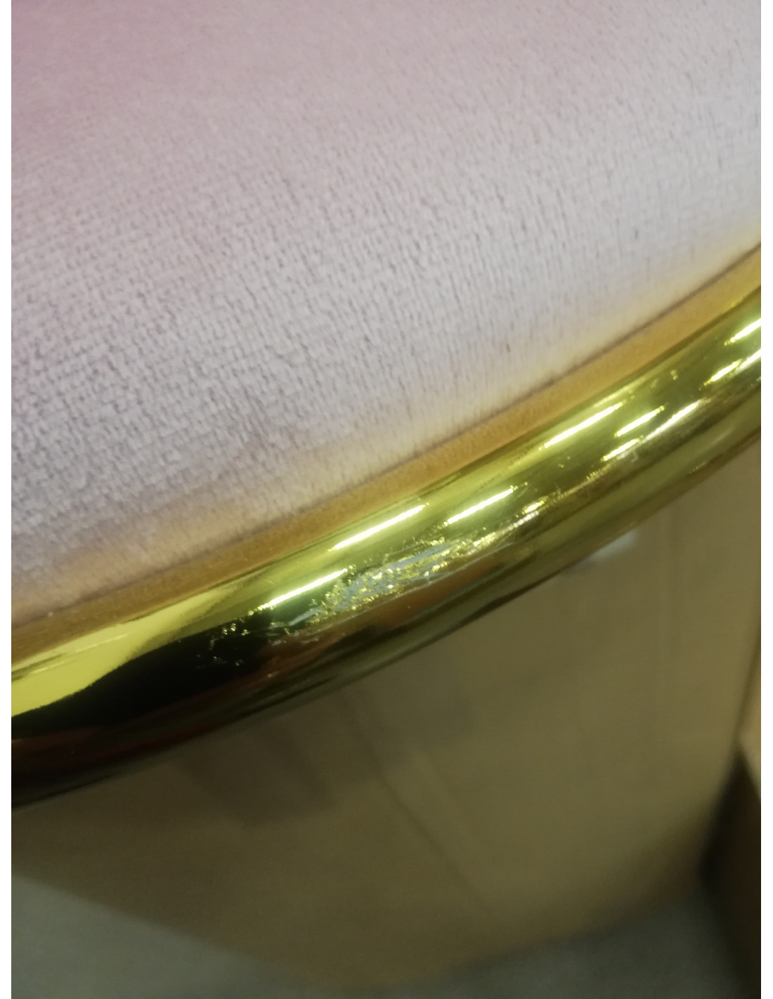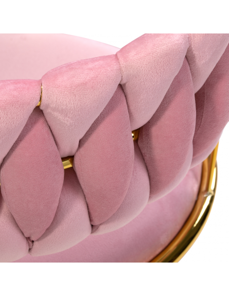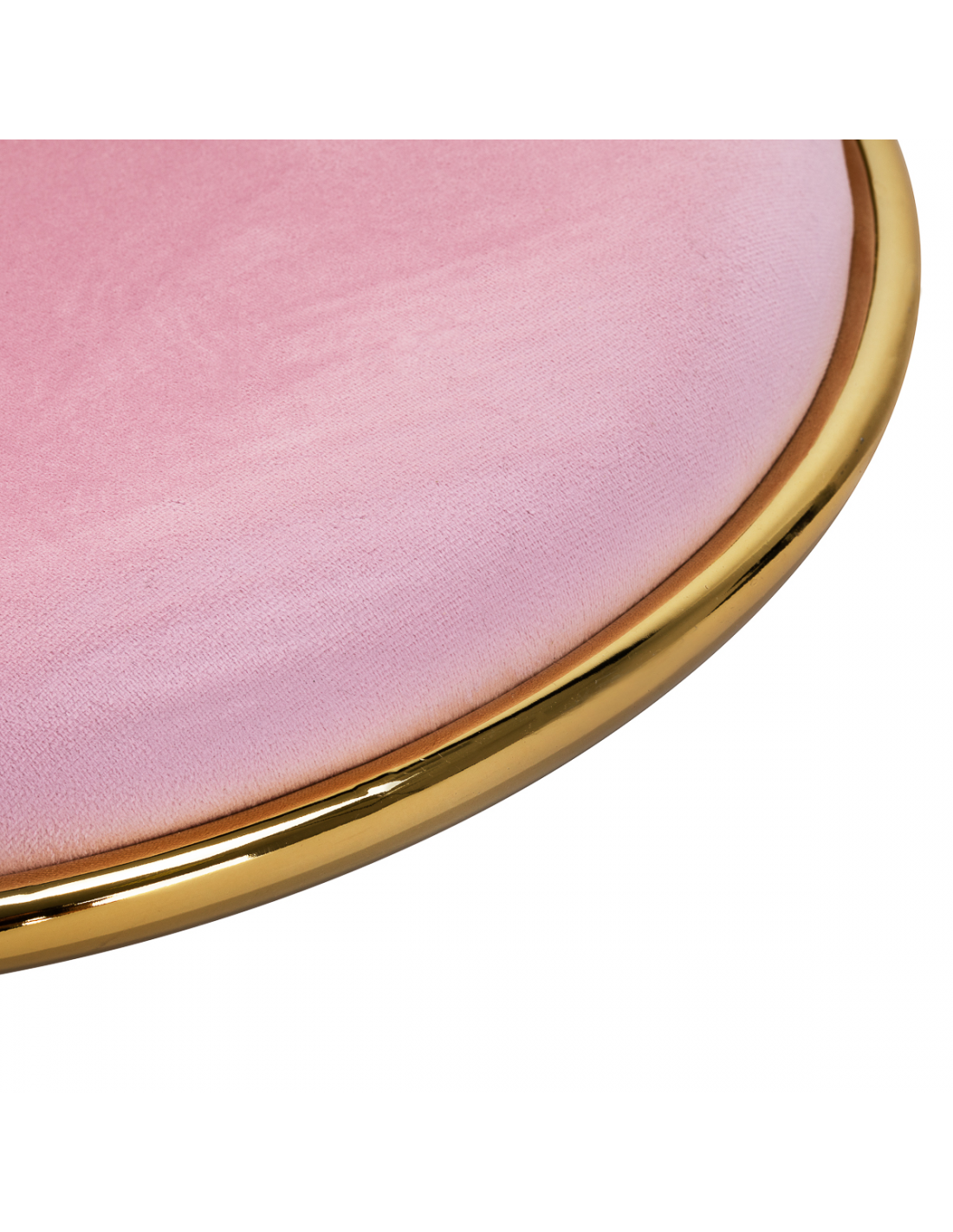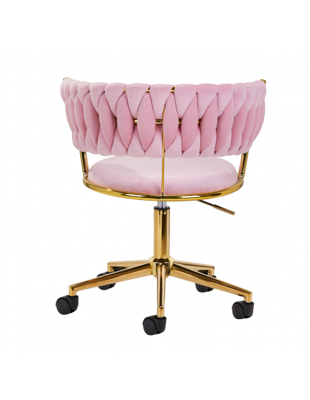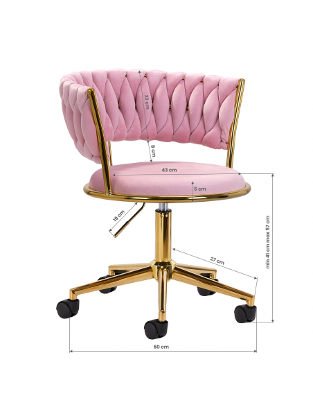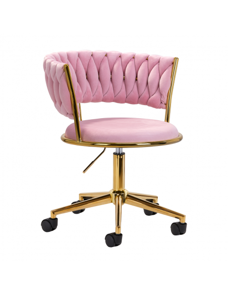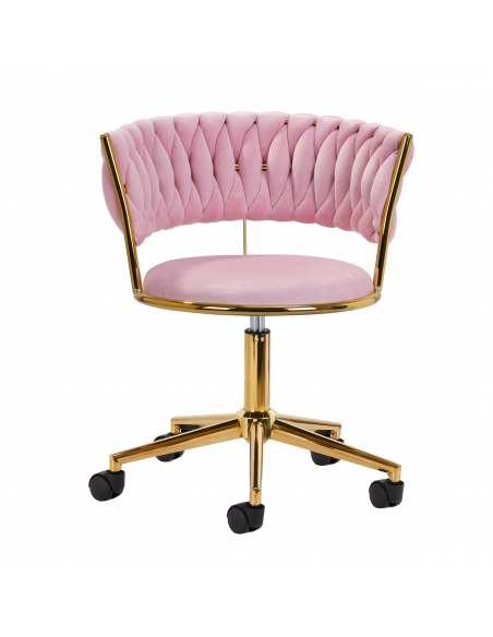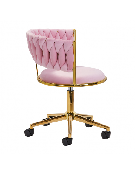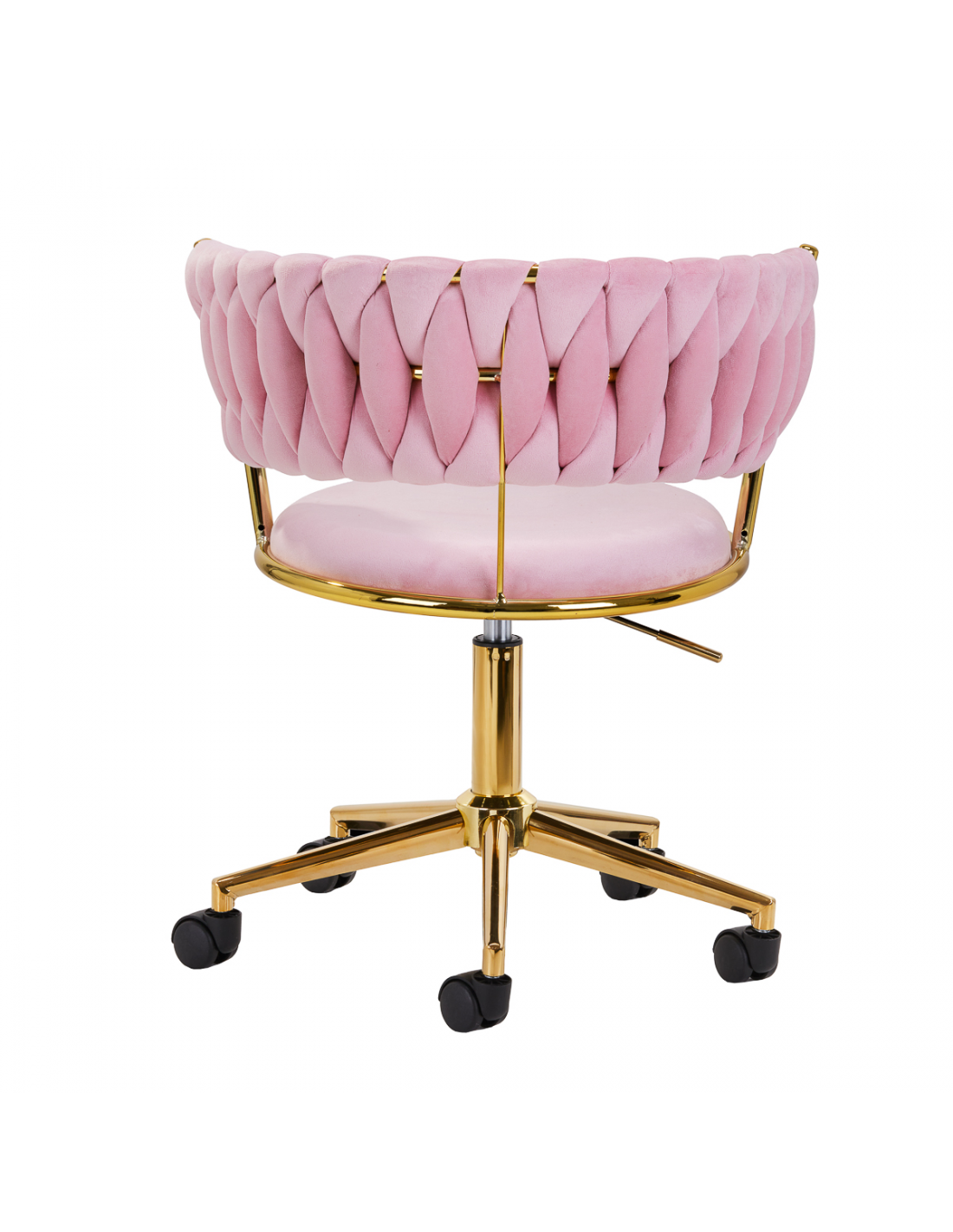 Wykończenie sprawia, że mebel wpada w oko. Przyjemne w dotyku, welwetowe obicie w odcieniach różu nadaje mu wyjątkowego charakteru. Podstawa w odcieniach złota dodaje elegancji, idealnie komponując się z welwetem. Funkcjonalne koła zapewniają mobilność, ułatwiając przestawianie krzesła oraz poruszanie się po salonie w trakcie pracy. Staranność wykonania, komfort użytkowania oraz estetycznie przeplatany materiał na wyprofilowanym oparciu sprawiają, że krzesło spełni wymagania nawet najbardziej wymagających użytkowników.