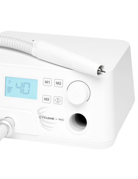 Estetyczna, futurystyczna obudowa w odcieniach bieli doskonale wpasuje się w każde wnętrze. Specjalne miejsce na odłożenie głowicy pozwala na znacznie bardziej komfortową pracę, a antypoślizgowe nóżki zapewniają stabilność urządzenia w trakcie użytkowania. Frezarka z pochłaniaczem Saeyang Cyclone-Vac objęta jest 12-miesięczną gwarancją.