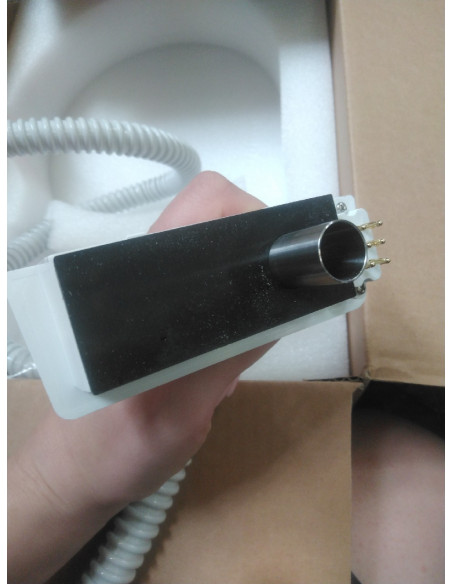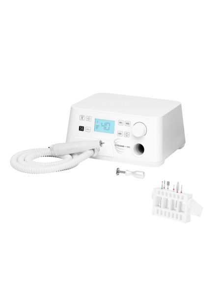 Cicha, ergonomiczna głowica z silnikiem bezszczotkowym o regulowanej prędkości obrotów w granicach 4 000 – 40 000 RPM z wydajnym pochłaniaczem gwarantuje doskonałą jakość usług oraz zachowanie najwyższych standardów higieny, chroniąc płuca zarówno osób wykonujących zabiegi, jak i klientów. Pył z miejsca zabiegu zasysany jest przez otwory w głowicy bezpośrednio do filtra. Przełącznik ON/OFF umieszczony z tyłu rączki pozwala w łatwy sposób w trakcie pracy tymczasowo zatrzymywać obroty oraz ssanie. Usprawnia to swobodne operowanie urządzeniem. Wymiana frezów jest bezproblemowa, co zapewnia zastosowany mechanizm Push-in & Pull-out – wystarczy wcisnąć frez do tulei, bez konieczności zakręcania czy blokowania – a dodatkowo ułatwia to dołączone do zestawu narzędzie. Głowicę w prosty sposób można zdemontować, co usprawnia jej czyszczenie. Zastosowane rozwiązania zapobiegają nadmiernemu zmęczeniu ręki oraz wspomagają komfortową i bezpieczną pracę.
