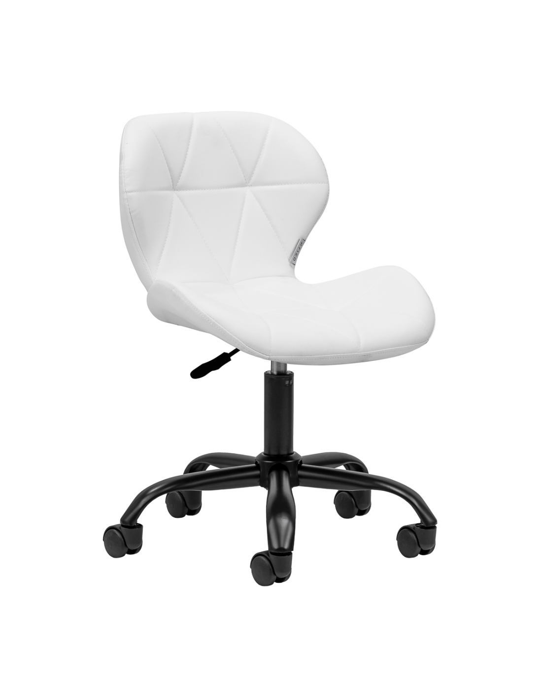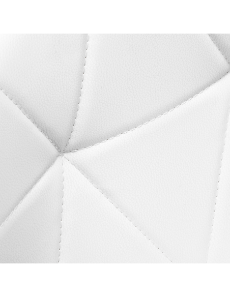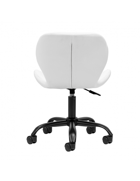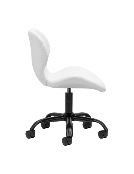 Pięcioramienna podstawa w odcieniach złota wyposażona jest w plastikowe kółka, które zapewniają znaczną mobilność, umożliwiając swobodne przemieszczanie mebla po gabinecie. Siedzisko taboretu zostało obite przyjemną w dotyku imitacją skóry w eleganckim odcieniu bieli. Zastosowany materiał gwarantuje trwałość, odporność na wilgoć oraz łatwość w utrzymaniu czystości. Całość dopełniają stylowe przeszycia, które podkreślają nowoczesny design.