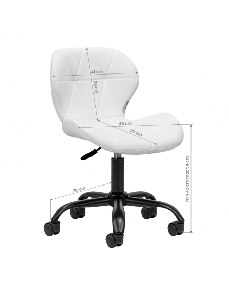 Wydajny podnośnik gazowy pozwala na łatwą regulację wysokości siedziska w granicach 42-54 cm. Umożliwia to dopasowanie krzesła do indywidualnych potrzeb oraz przeprowadzanych usług, zapewniając wysoki komfort użytkowania – zarówno podczas wykonywania makijażu, stylizacji brwi, jak i w trakcie innych czynności. Wyprofilowane oparcie zapewnia odpowiednie wsparcie pleców. Krzesło wyposażone jest w mechanizm pełnego obrotu, co poprawia efektywność i wygodę pracy.