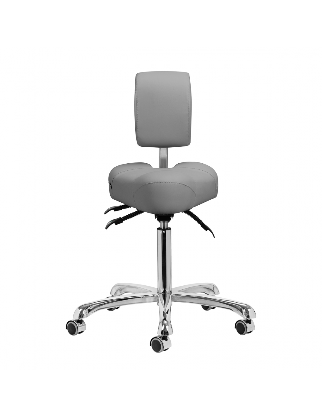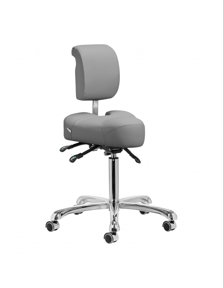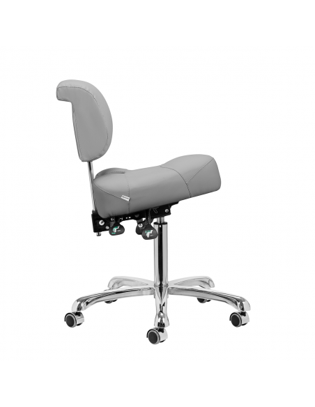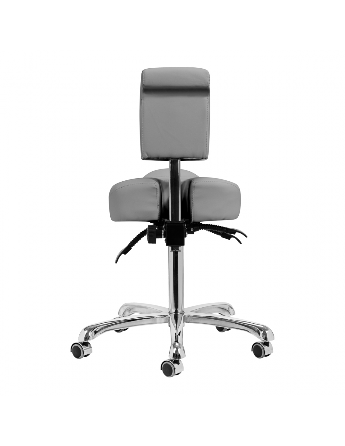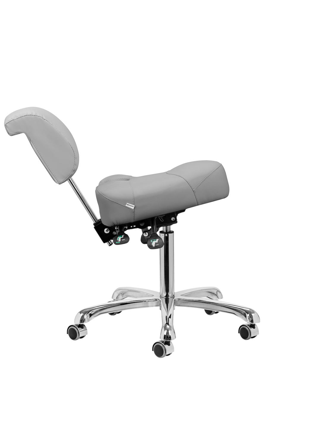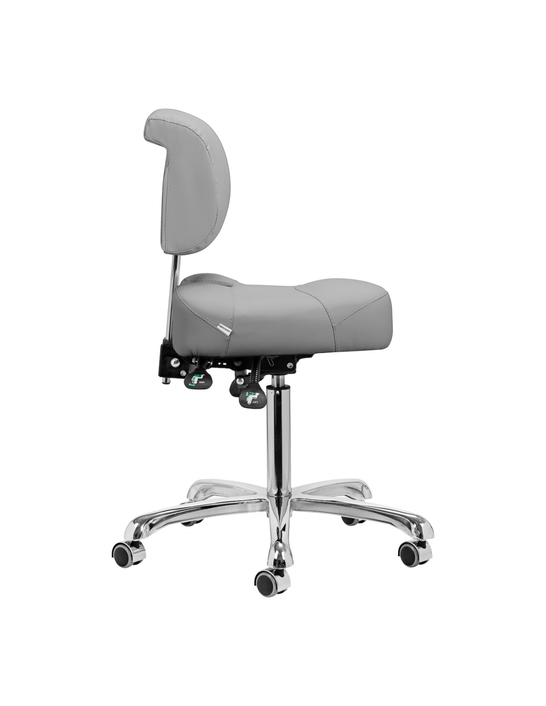 Możliwość regulacji wysokości w zakresie 55-72 cm pozwala przybrać odpowiednią pozycję w trakcie wykonywania usług. Perfekcyjnie wyprofilowane oparcie z regulacją zapewnia optymalne wsparcie dla odcinka lędźwiowego, minimalizując zmęczenie podczas długotrwałej pracy. Mechanizm pełnego obrotu, że praca staje się bardziej efektywna i wygodna. Taboret posiada również funkcję kołyski z możliwością blokady, co pozwala na ergonomiczne ustawienie ciała. Siedzisko zapewnia regulację pochylenia oraz wysokości dzięki siłownikom gazowym. Dodatkowo wysokość oparcia można manualnie dostosować dla pełnej wygody użytkowania.