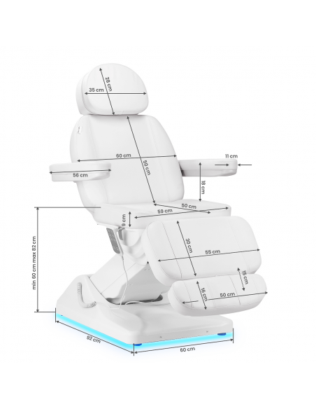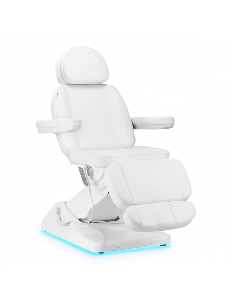 Podświetlenie spodu podstawy fotela kosmetycznego nadaje nowoczesny wygląd i elegancję, tworząc relaksującą atmosferę w gabinecie. Delikatne światło sprzyja odprężeniu, zapewniając komfort podczas zabiegów. Funkcja ta nie tylko podkreśla estetykę wnętrza, ale także wprowadza subtelną, kojącą atmosferę, idealną do zabiegów pielęgnacyjnych.