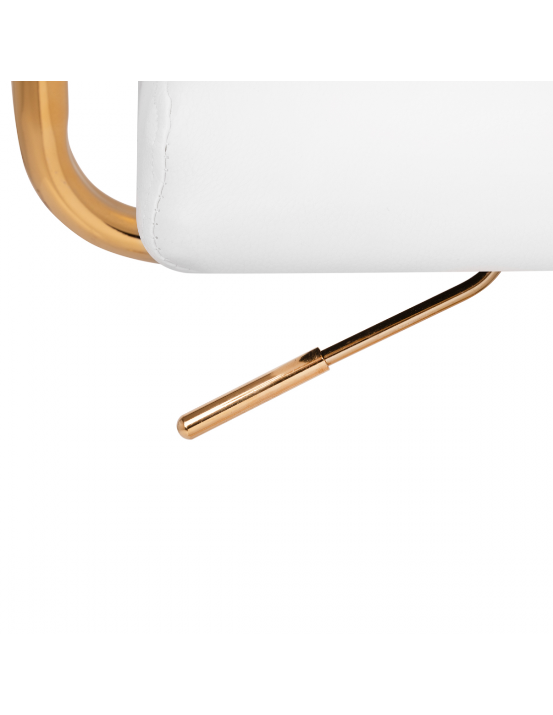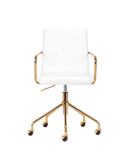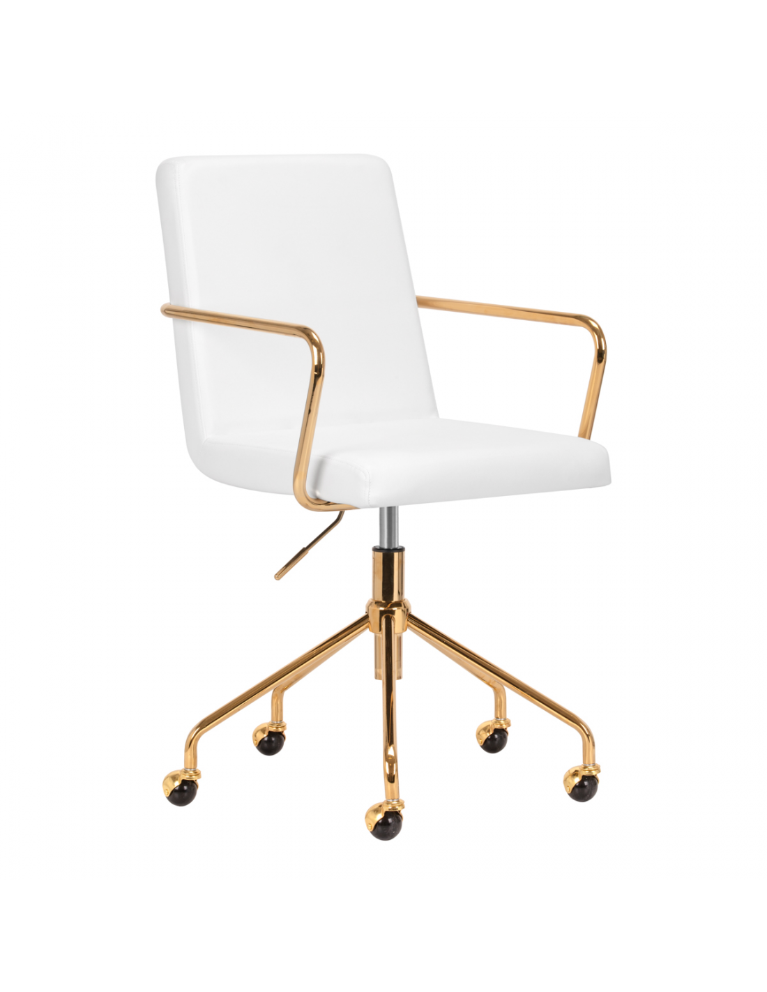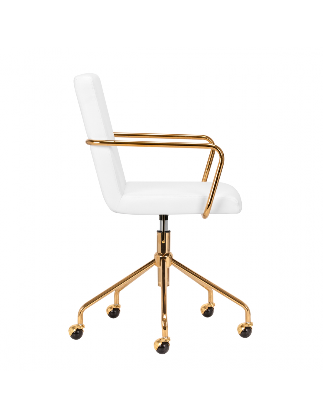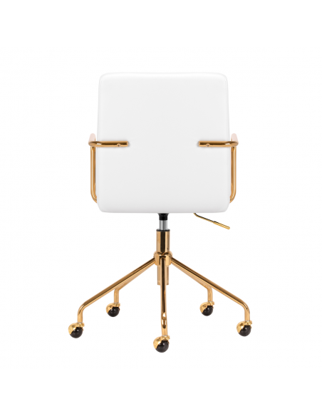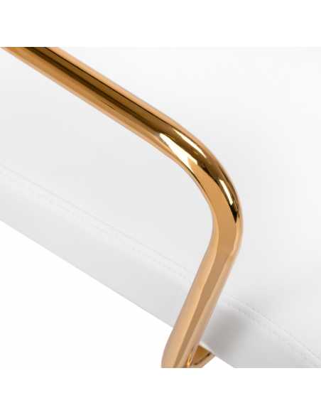 Przyjemne w dotyku, obicie ze skóry syntetycznej w odcieniach bieli nadaje meblowi wyjątkowego charakteru. Eleganckie wykończenie sprawia, że mebel przykuwa wzrok. Stelaż w odcieniach złota dodaje elegancji, idealnie komponując się z prostymi kształtami. Funkcjonalne kółka zapewniają znaczną mobilność, ułatwiając przestawianie krzesła oraz poruszanie się po salonie w trakcie pracy. Estetyka wykonania, komfort użytkowania oraz ergonomicznie wyprofilowane oparcie sprawiają, że krzesło spełni wymagania nawet najbardziej wymagających użytkowników.