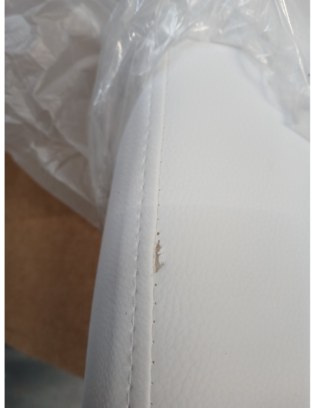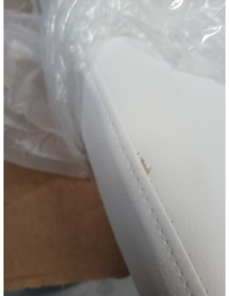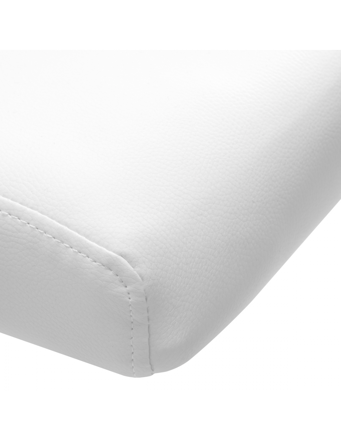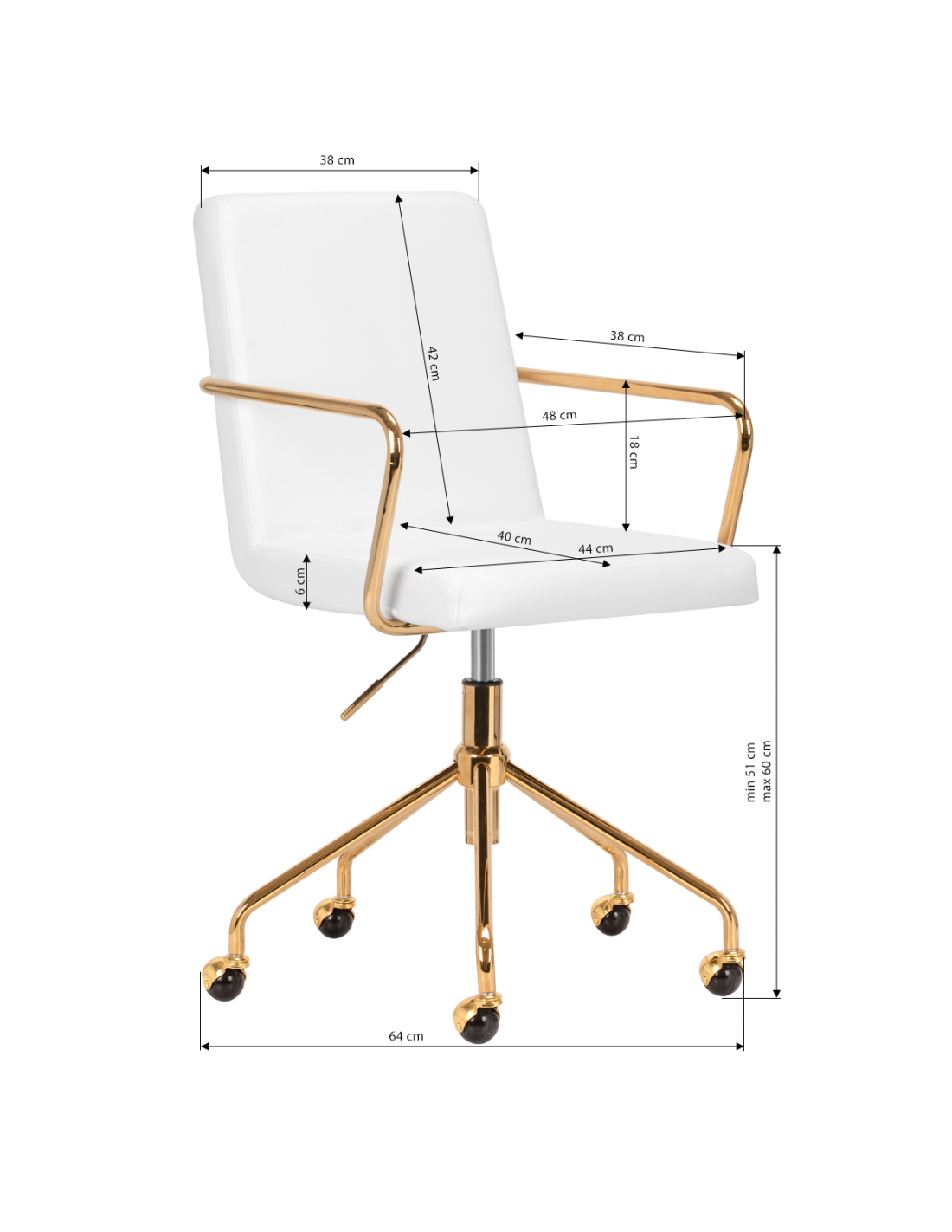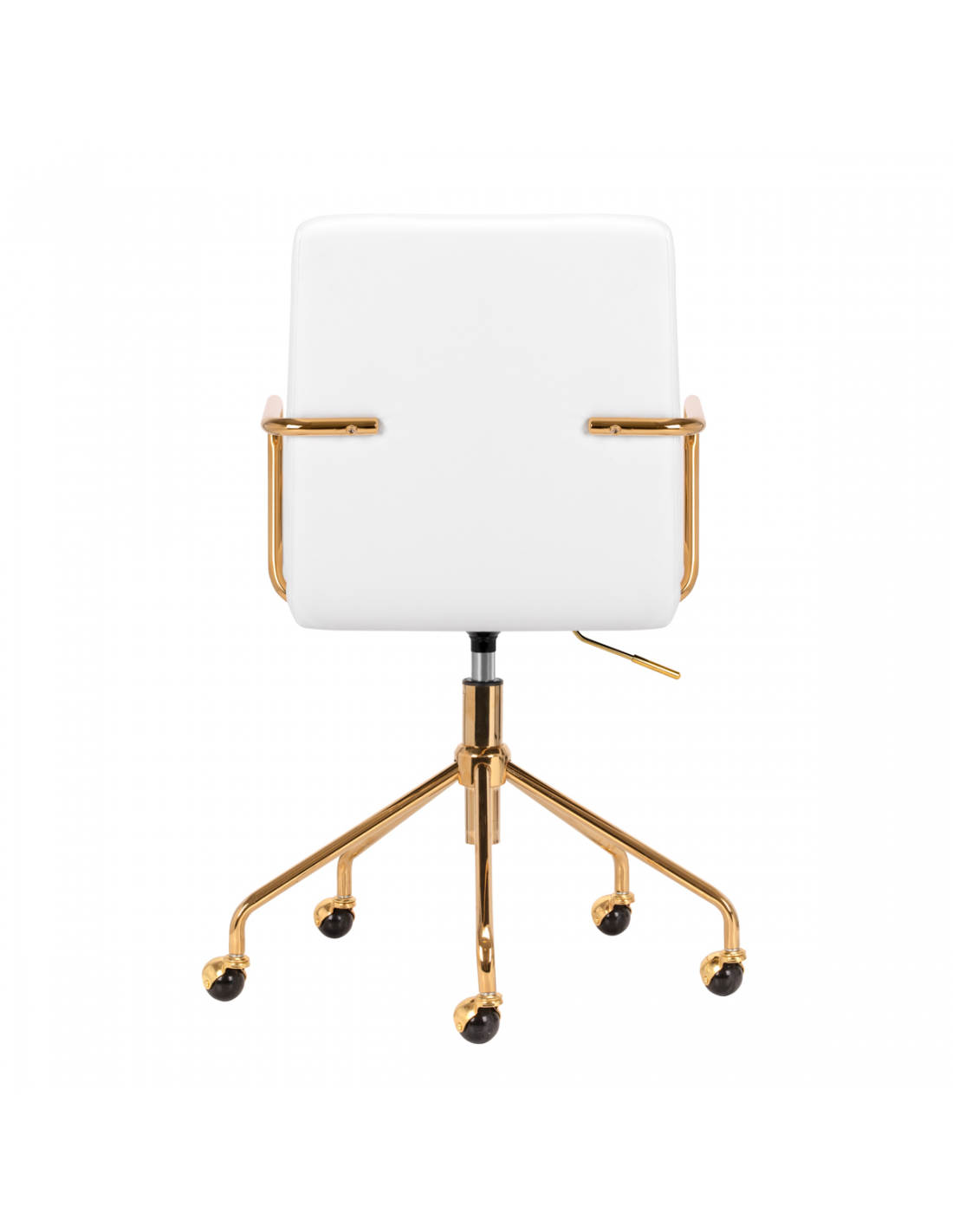 Przyjemne w dotyku, obicie ze skóry syntetycznej w odcieniach bieli nadaje meblowi wyjątkowego charakteru. Eleganckie wykończenie sprawia, że mebel przykuwa wzrok. Stelaż w odcieniach złota dodaje elegancji, idealnie komponując się z prostymi kształtami. Funkcjonalne kółka zapewniają znaczną mobilność, ułatwiając przestawianie krzesła oraz poruszanie się po salonie w trakcie pracy. Estetyka wykonania, komfort użytkowania oraz ergonomicznie wyprofilowane oparcie sprawiają, że krzesło spełni wymagania nawet najbardziej wymagających użytkowników.