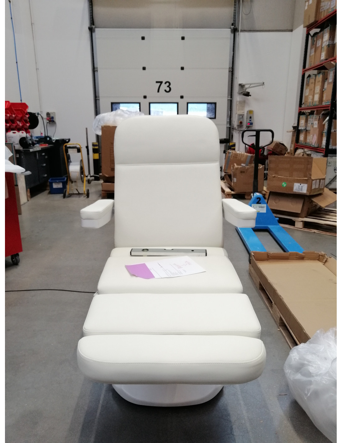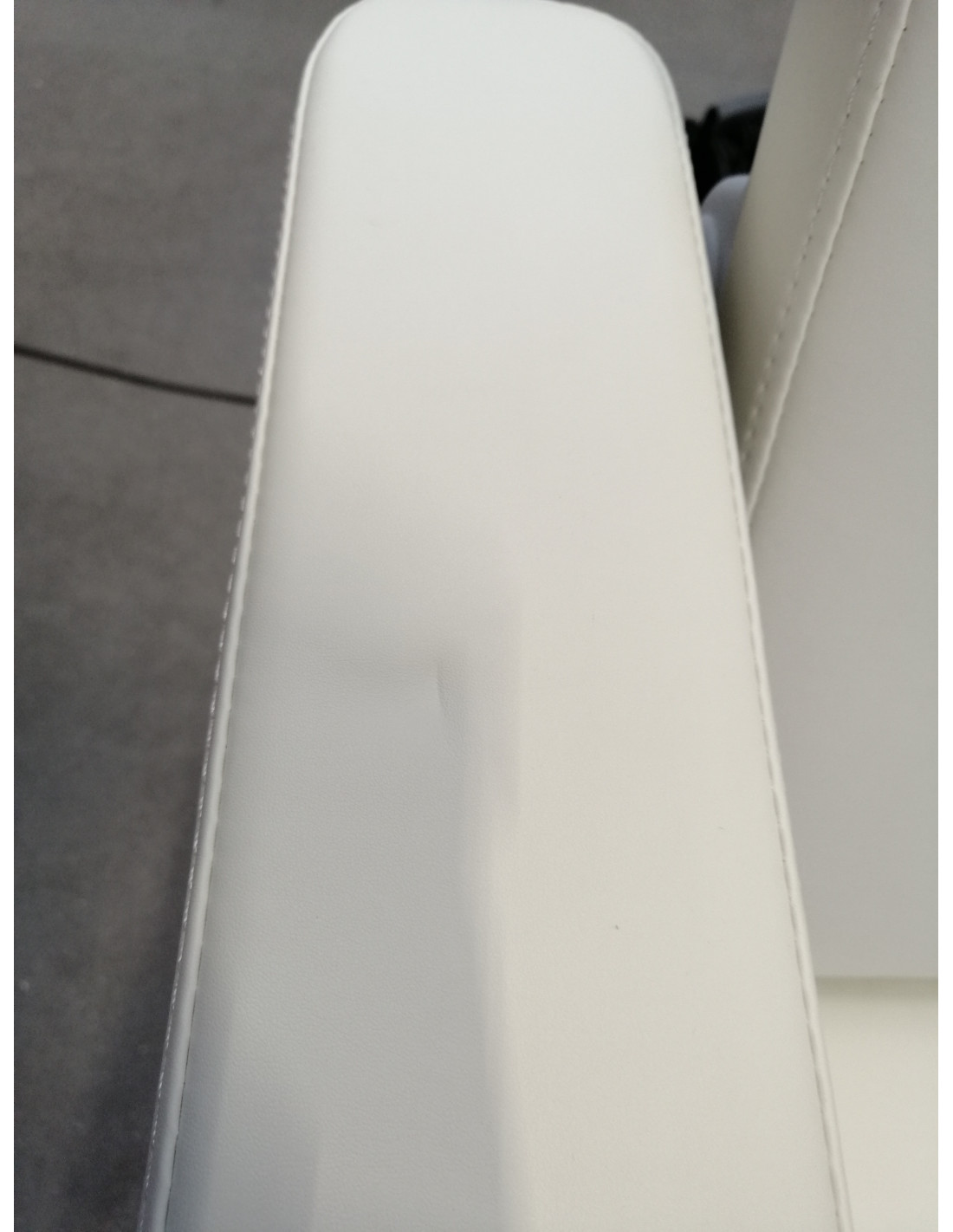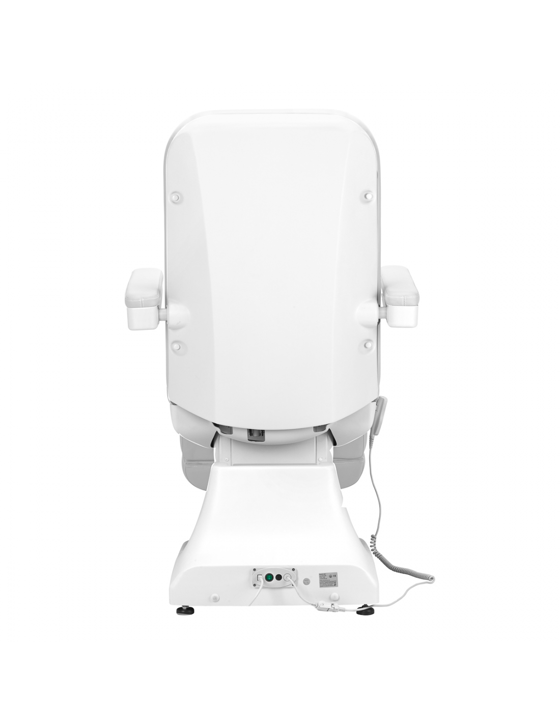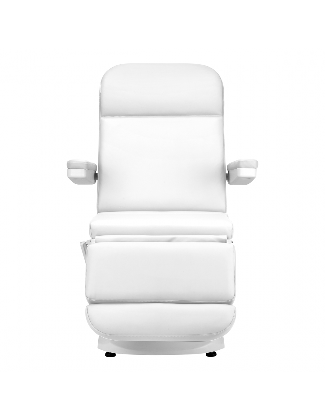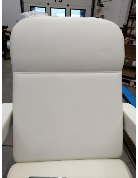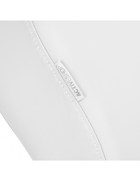 Fotel wypełniony jest pianką o odpowiedniej twardości oraz pokryty przyjemną w dotyku imitacją skóry w odcieniach bieli. Dzięki użyciu materiału, który jest łatwy do utrzymania w czystości oraz odporny na wybrane środki dezynfekcji, sprzęt jest komfortowy w użytkowaniu, wytrzymały na wilgoć oraz nieskomplikowany w czyszczeniu. Solidna podstawa wykonana z trwałego materiału w odcieniach bieli zapewnia stabilność w trakcie zabiegów. Odpowiednio wyprofilowane obszycia nadają fotelowi stylowy wygląd i sprawiają, że siedzisko jest ergonomiczne.