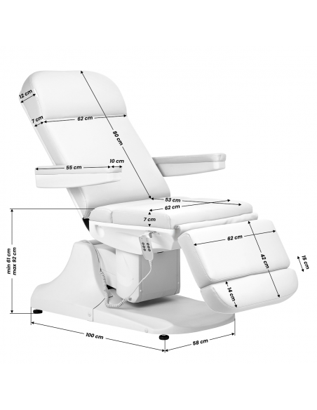 Wysokość siedziska regulowana jest w zakresie od 61 cm do 92 cm, a przy całkowitym rozłożeniu fotel osiąga długość 190 cm. Wymiary te pozwalają na łatwe korzystanie ze sprzętu osobom o różnym wzroście i umożliwiają dostosowanie go do potrzeb zarówno klienta, jak i osoby wykonującej zabieg. Uchwyty znajdujące się po obu stronach siedziska pozwalają na swobodne odwieszanie pilota tak, by zawsze znajdował się pod ręką.