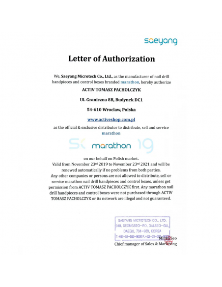 Frezarka Marathon N7 od koreańskiej firmy Saeyang to świetne narzędzie do zabiegów manicure i pedicure, oraz do pracy protetycznej. Firma była wielokrotnie nagradzana za wyjątkowe osiągnięcia, zaś jej produkty są polecane przez kosmetologów i protetyków. Blisko pięć dekad doświadczeń to gwarancja otrzymania produktu o najwyższej jakości.