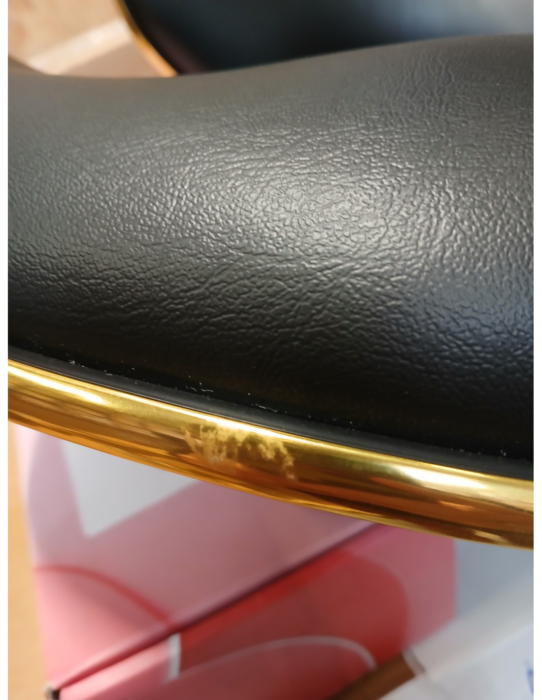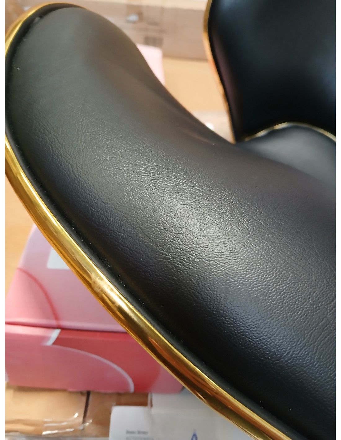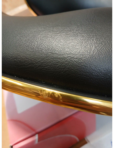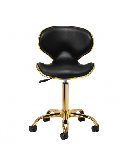Pięcioramienna podstawa zapewnia stabilność, nawet podczas bardziej dynamicznych ruchów czy częstych zmian pozycji. Wyposażenie w wytrzymałe koła zapewnia wysoką mobilność, co pozwala na swobodne przemieszczanie się po salonie czy gabinecie. Obicie ze skóry syntetycznej w odcieniach czerni, które jest nie tylko trwałe, ale także łatwe do utrzymania w czystości. Estetyczne złote elementy dodają luksusowego charakteru i przyciągają wzrok. Wyjątkowe połączenie elegancji oraz komfortu czyni taboret niezastąpionym narzędziem w pracy każdego profesjonalisty.