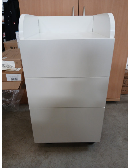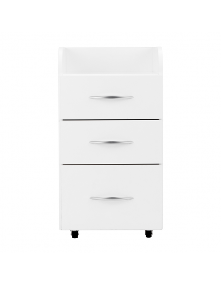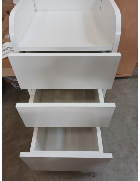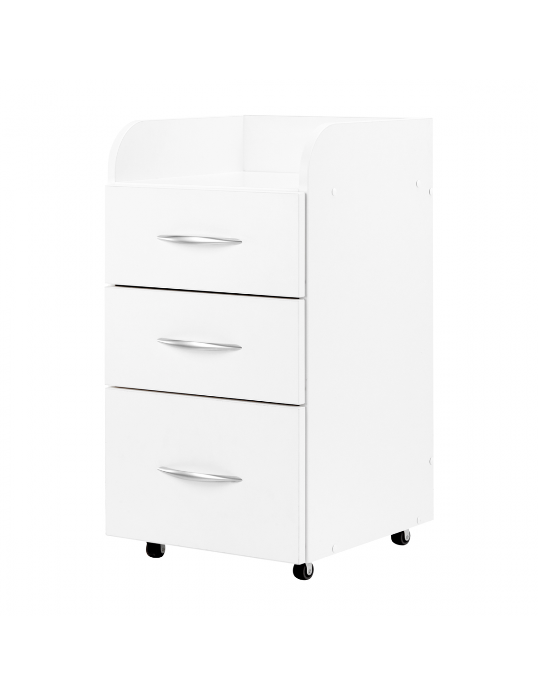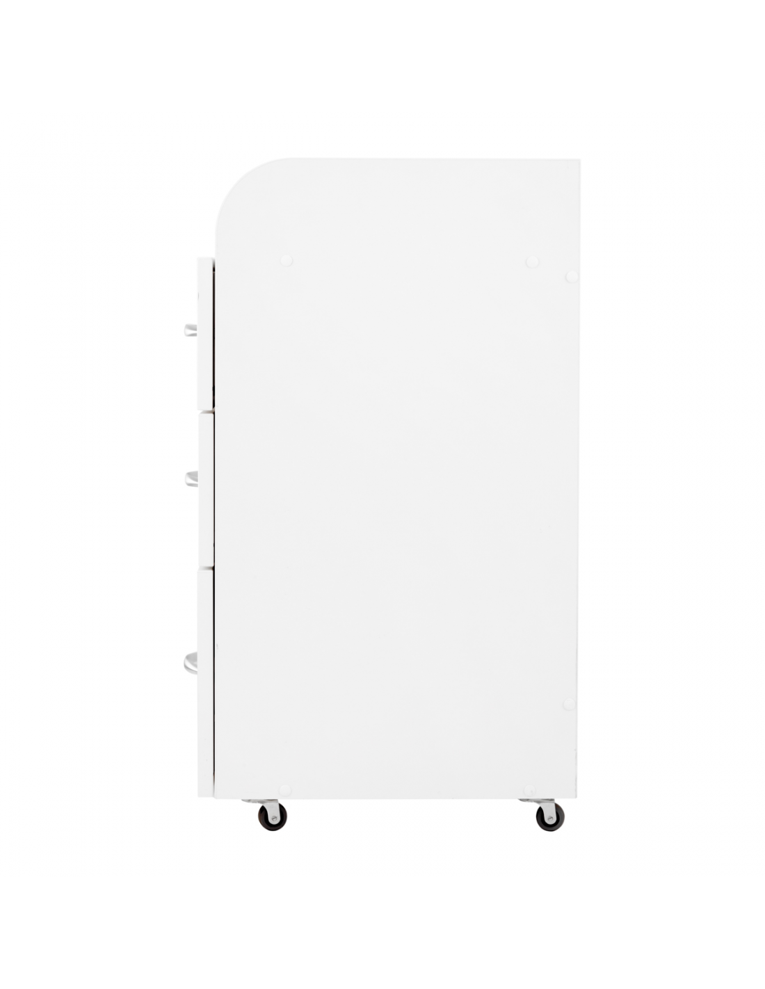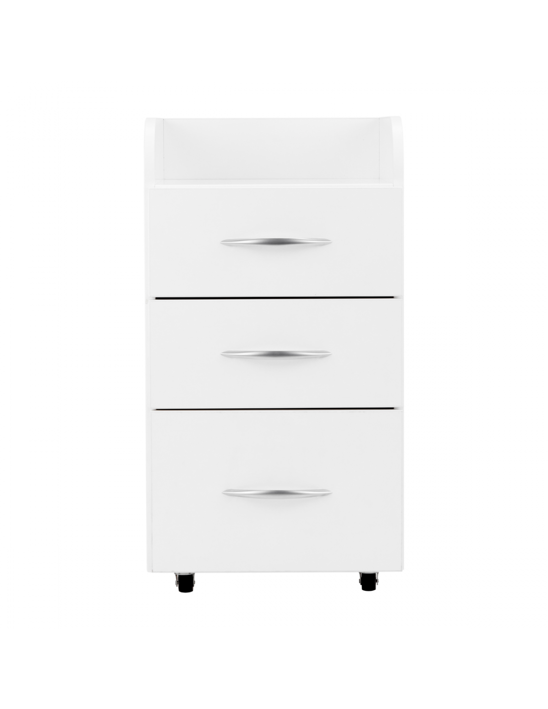 Szafka z 3 szufladami na prowadnicach rolkowych kolorze białym. Szafka ma zainstalowane kółka, co umożliwia łatwe przesuwanie jej po podłodze.