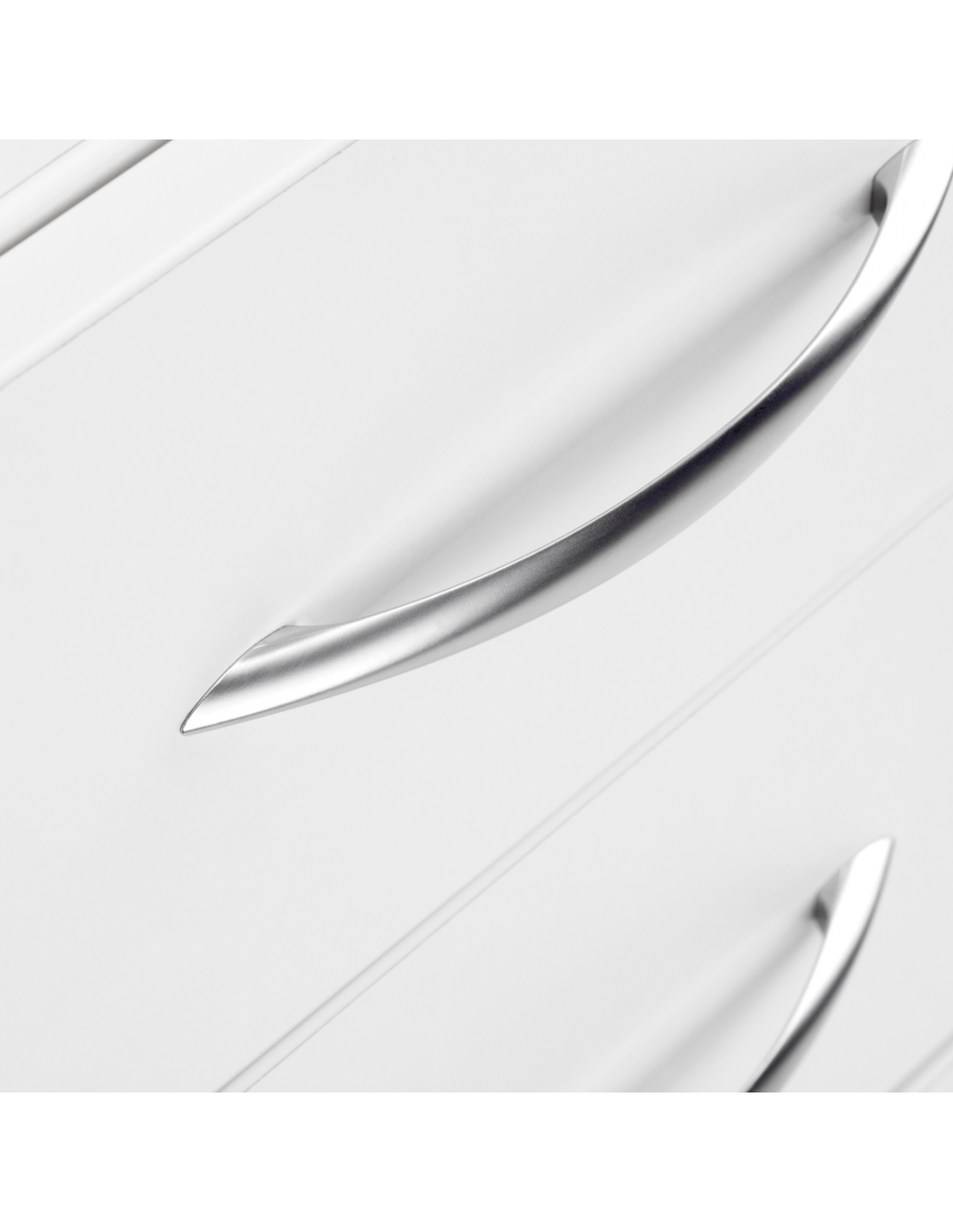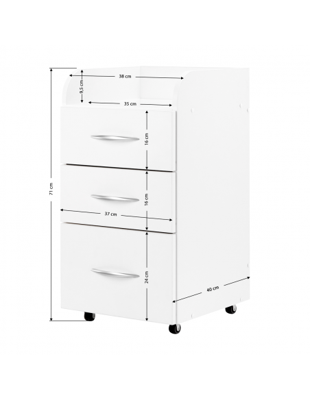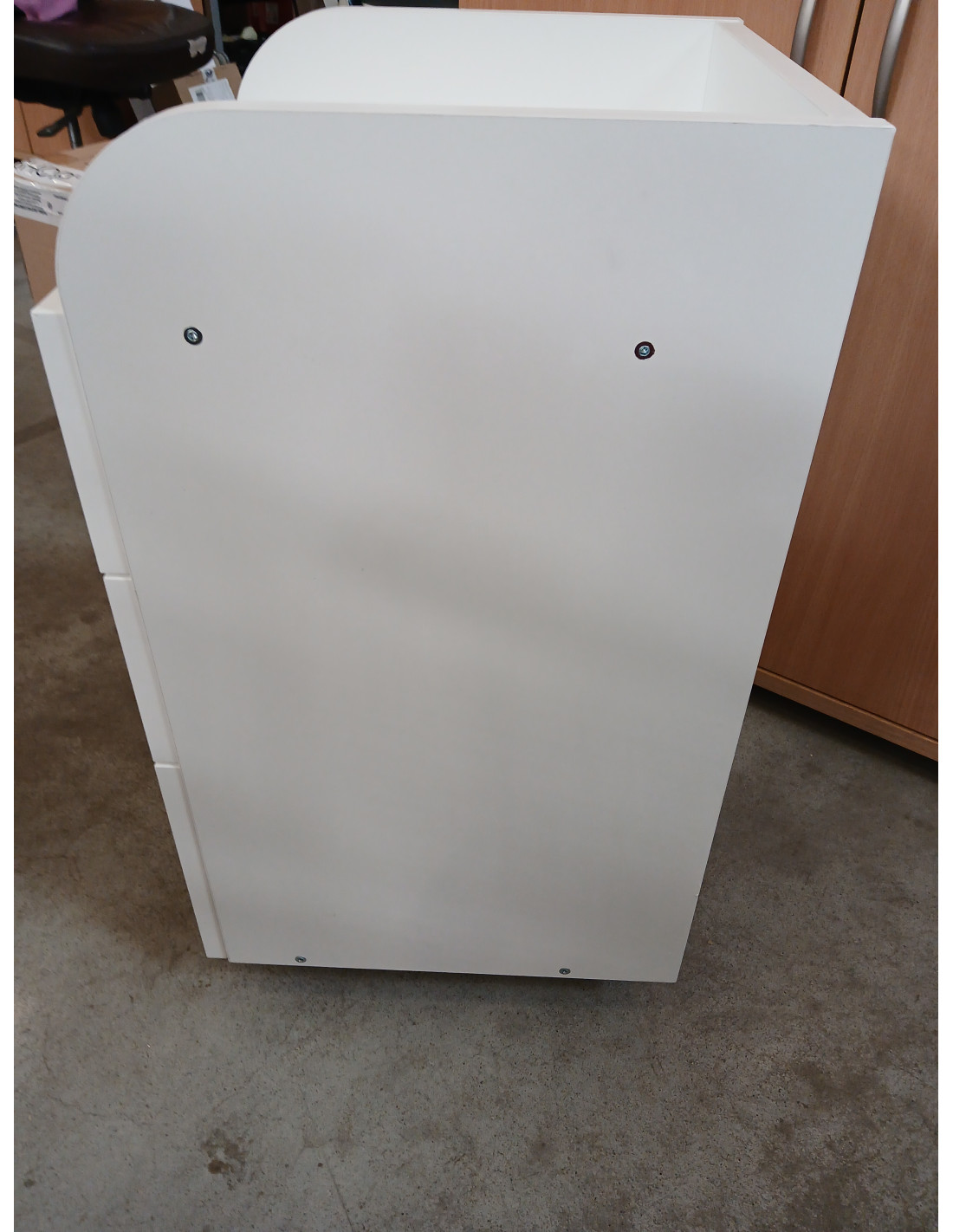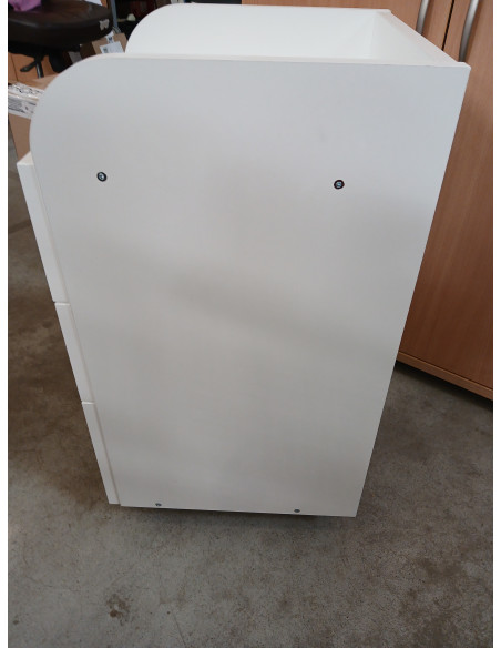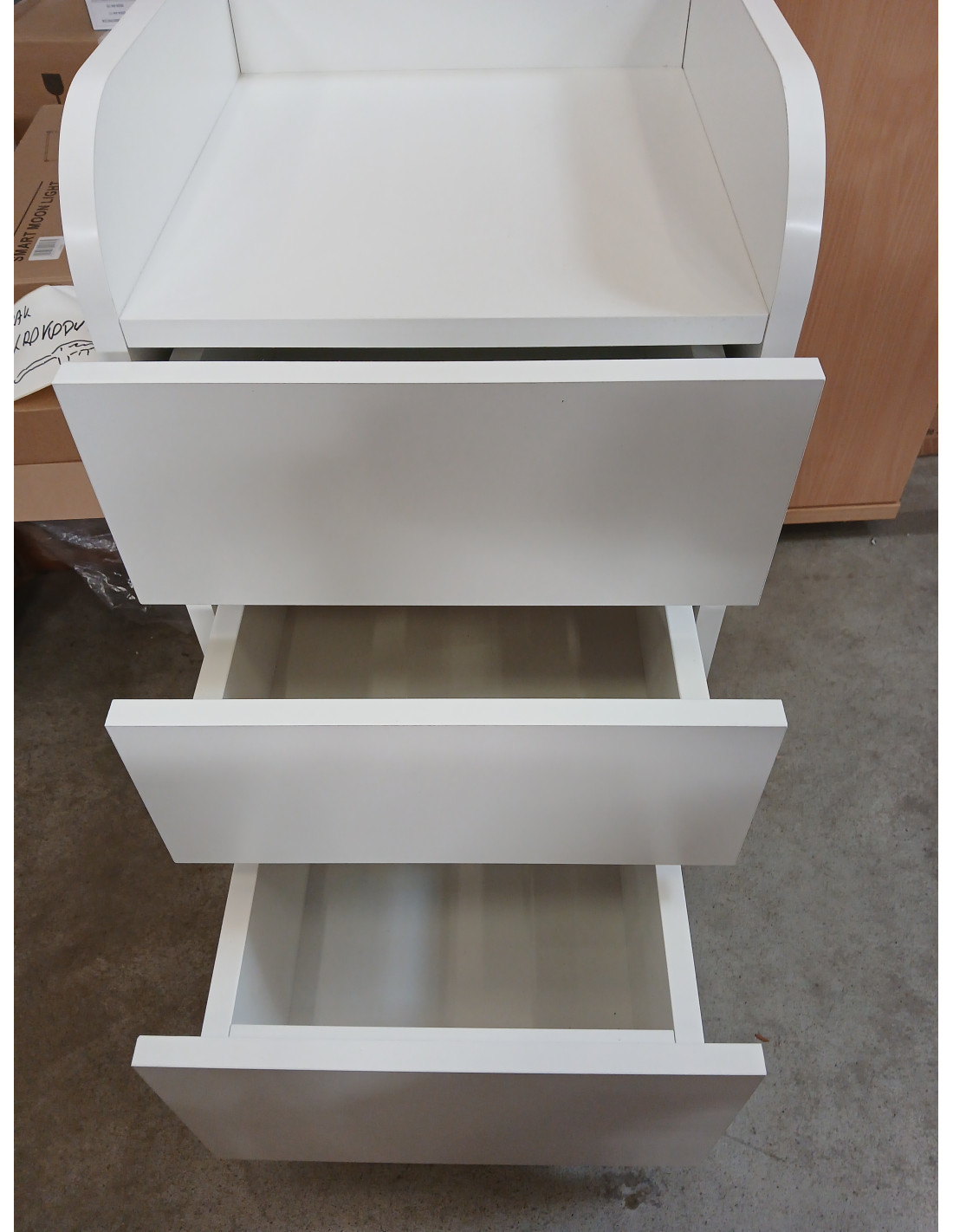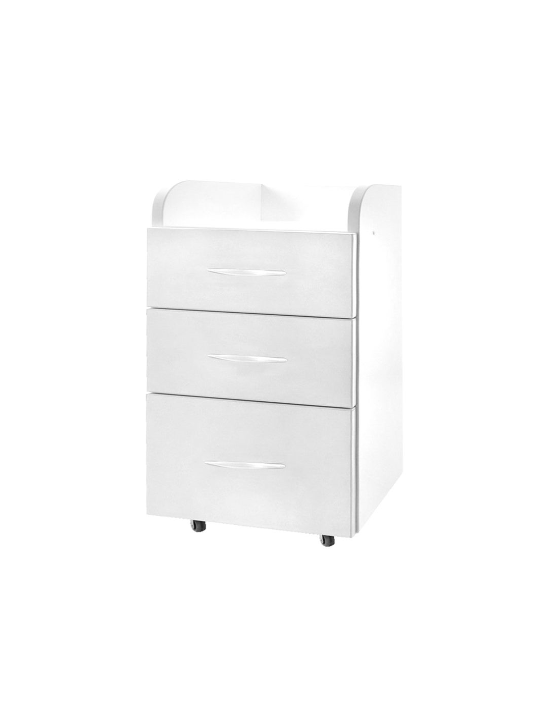 Szafka z 3 szufladami na prowadnicach rolkowych kolorze białym. Szafka ma zainstalowane kółka, co umożliwia łatwe przesuwanie jej po podłodze.