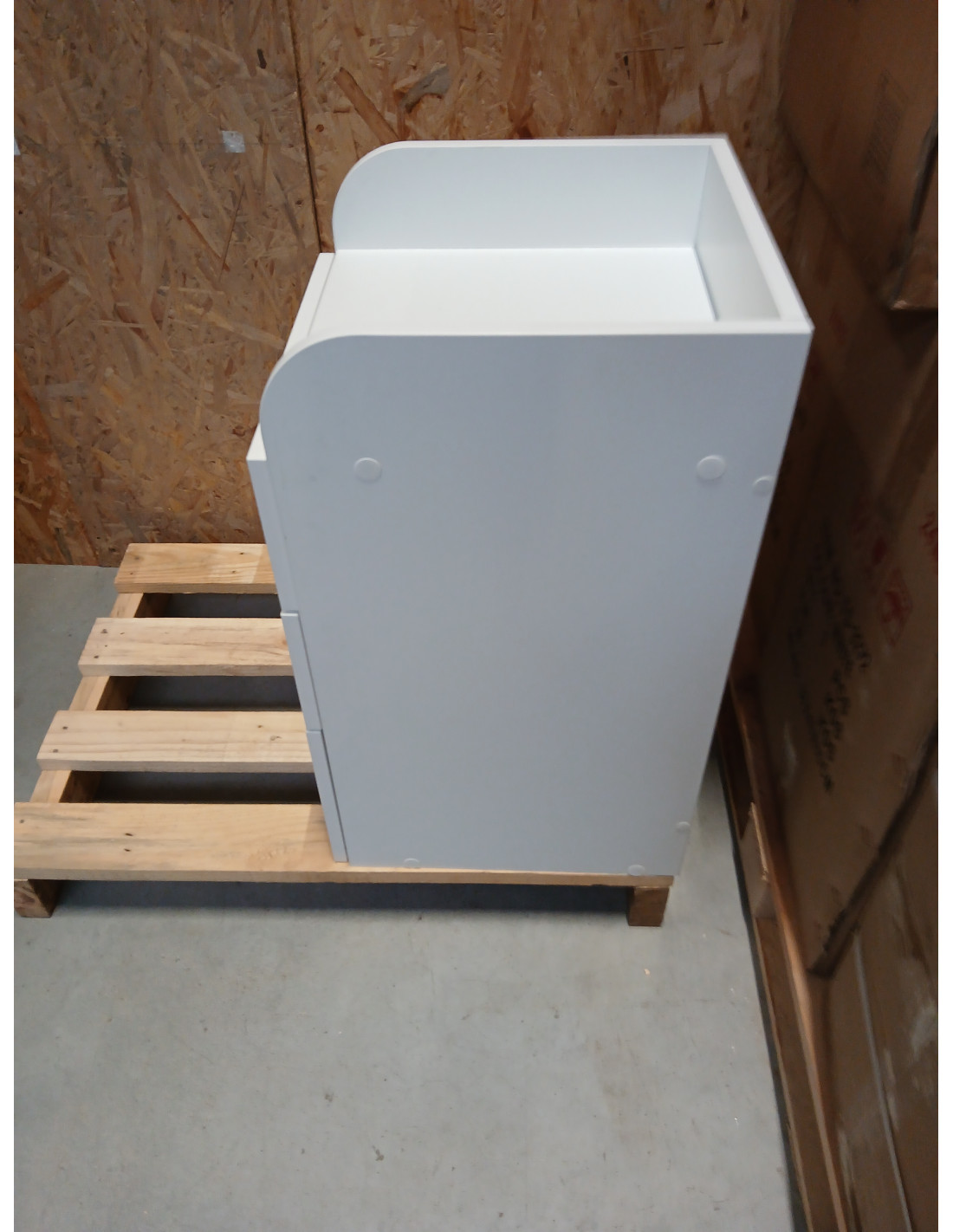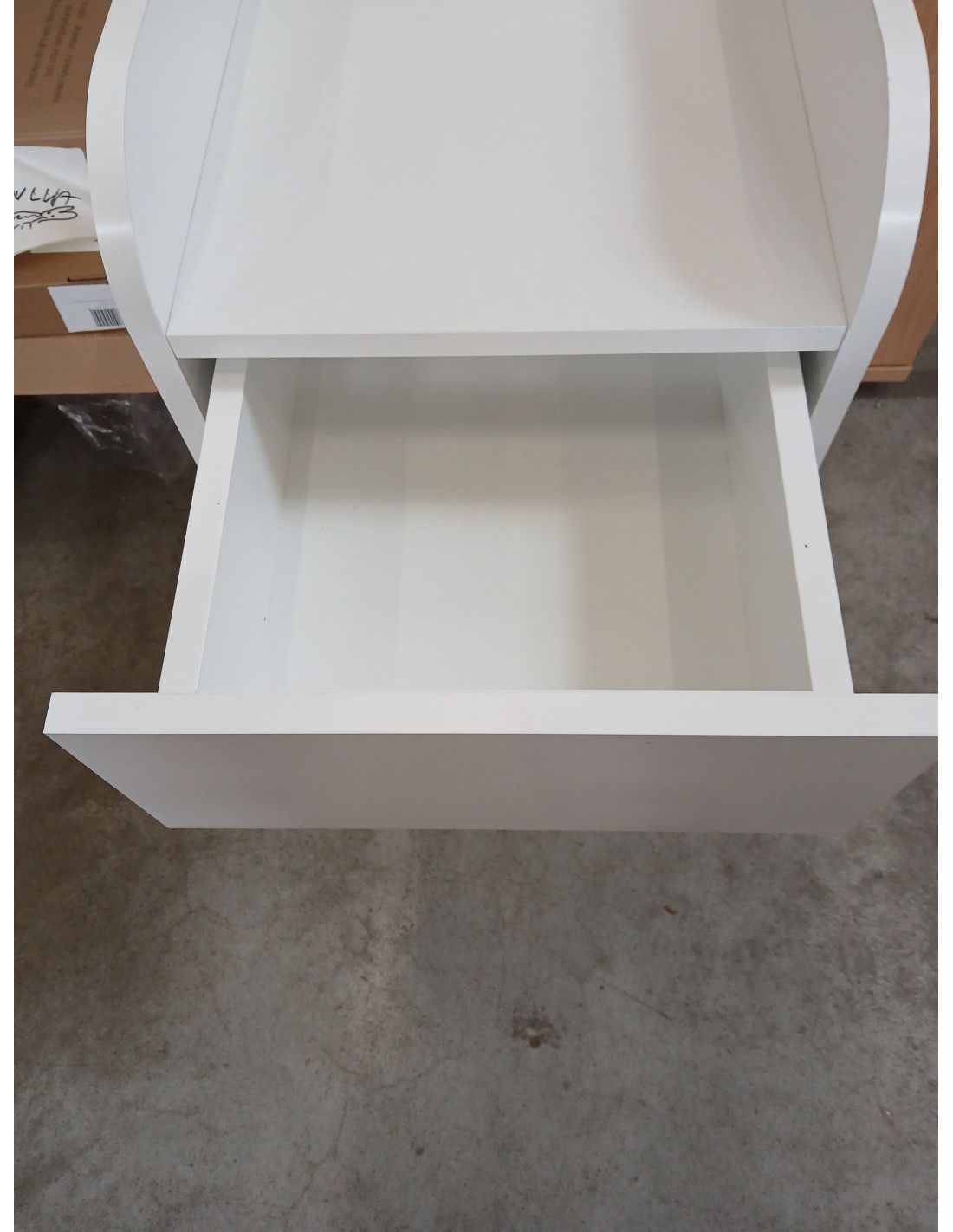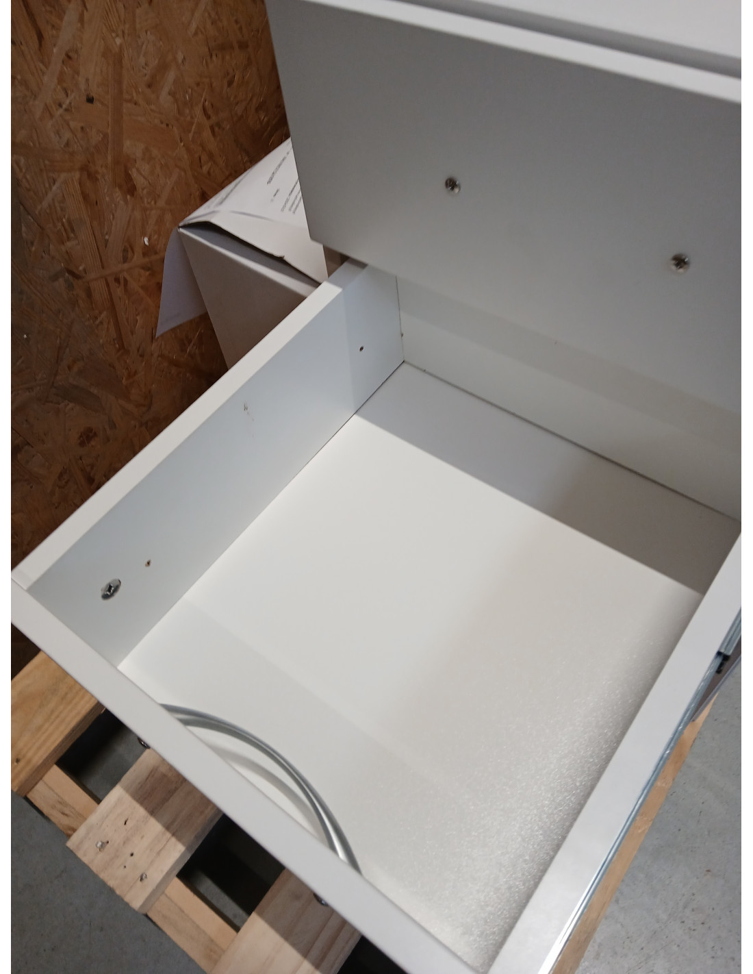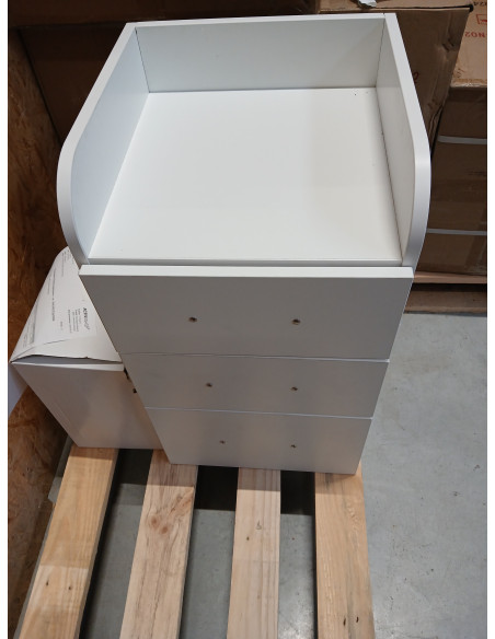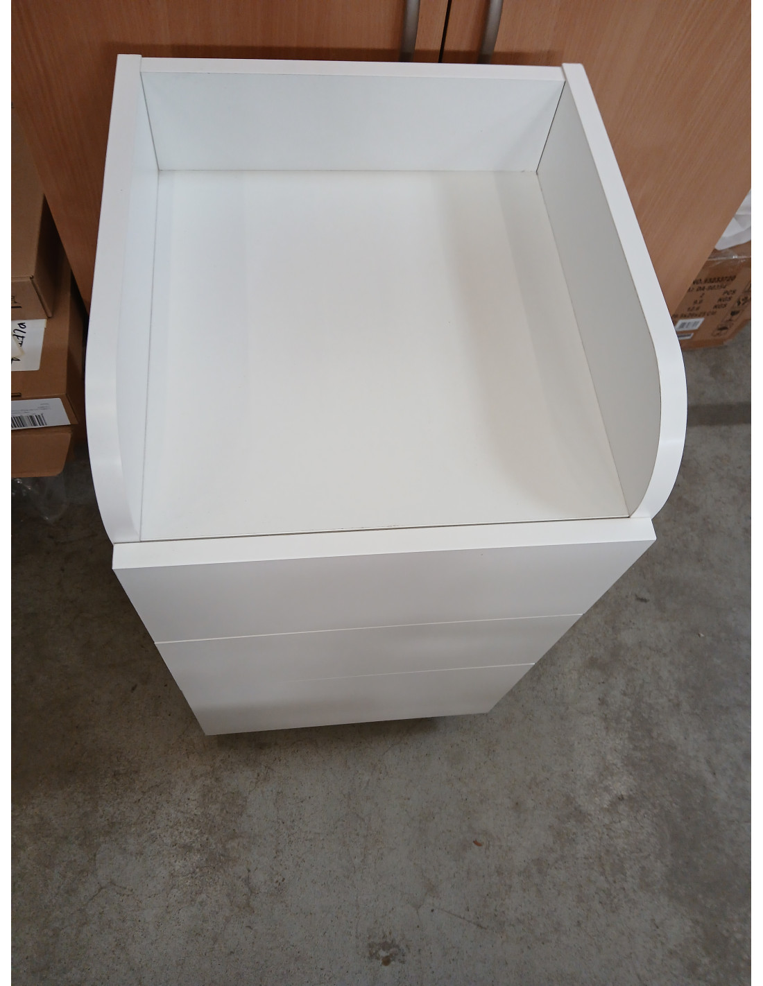 Szafka z 3 szufladami na prowadnicach rolkowych kolorze białym. Szafka ma zainstalowane kółka, co umożliwia łatwe przesuwanie jej po podłodze.