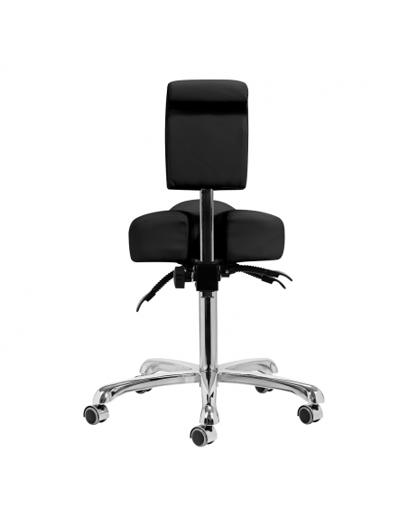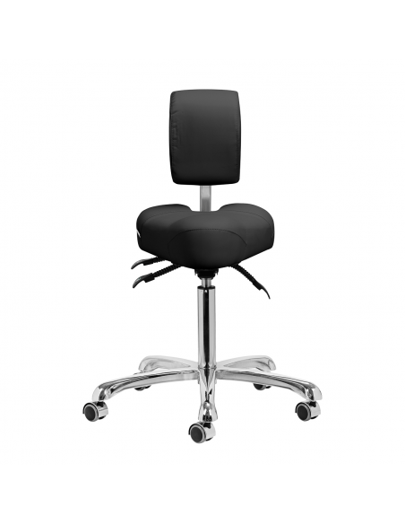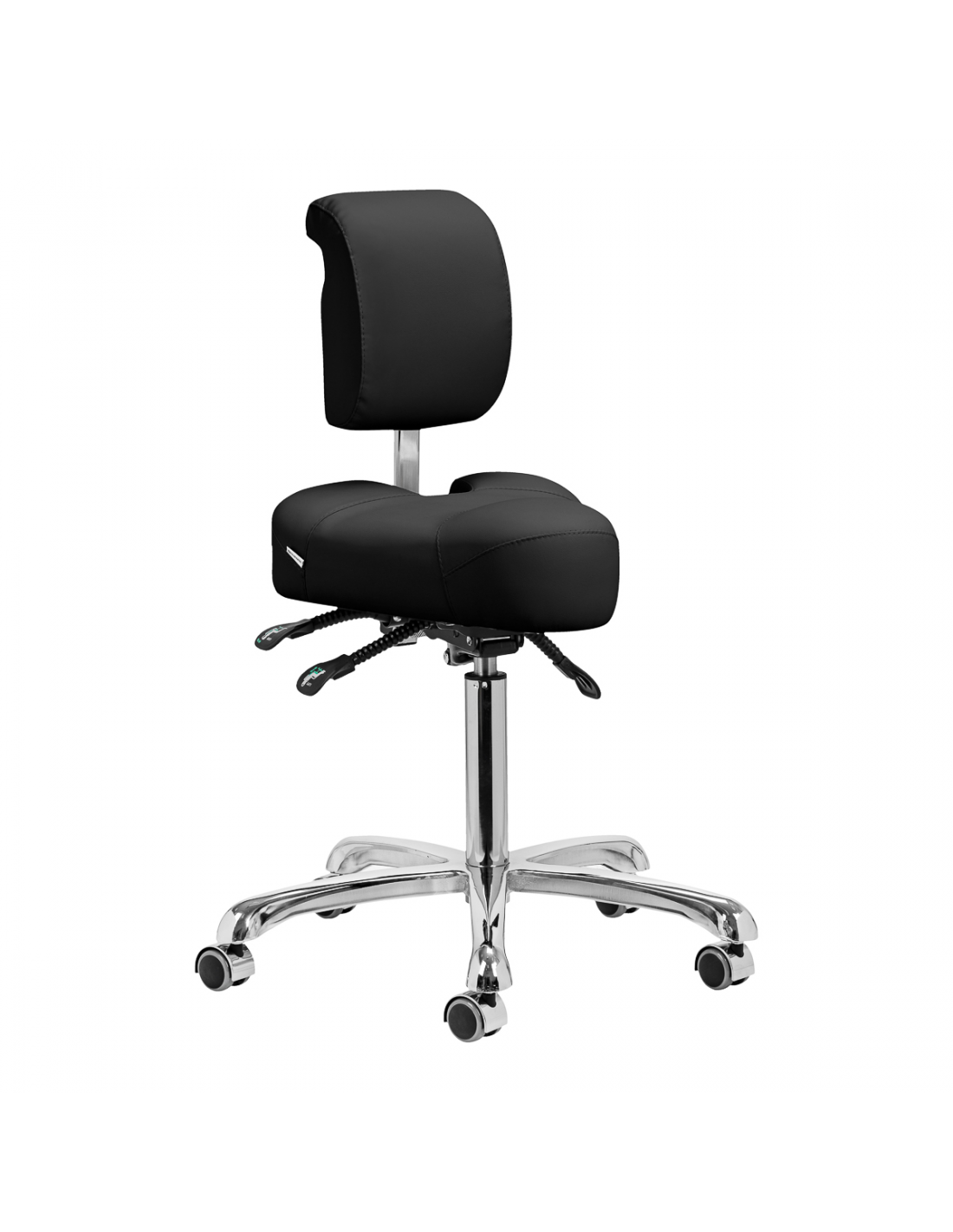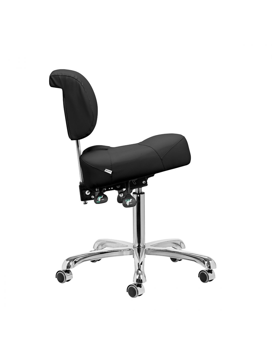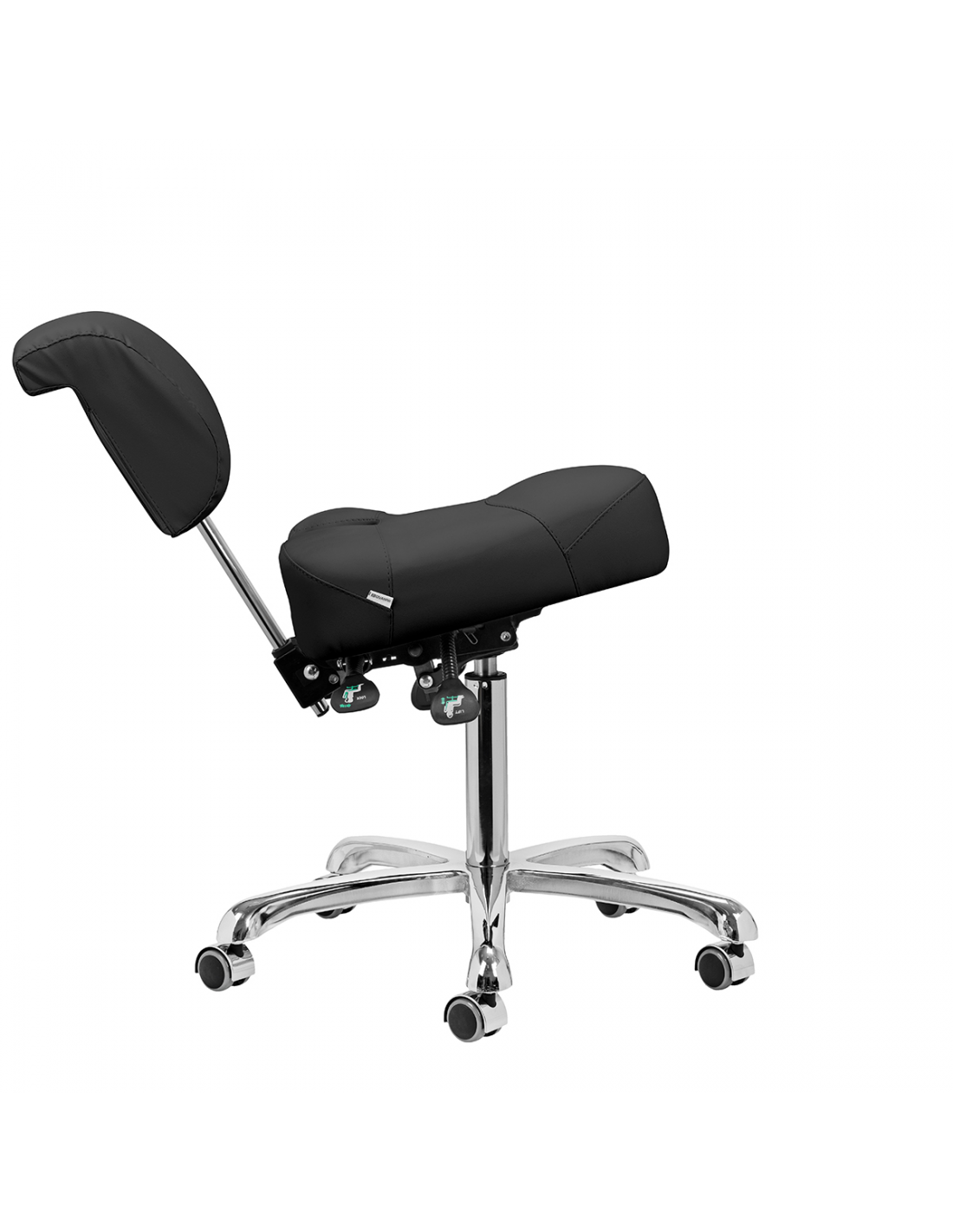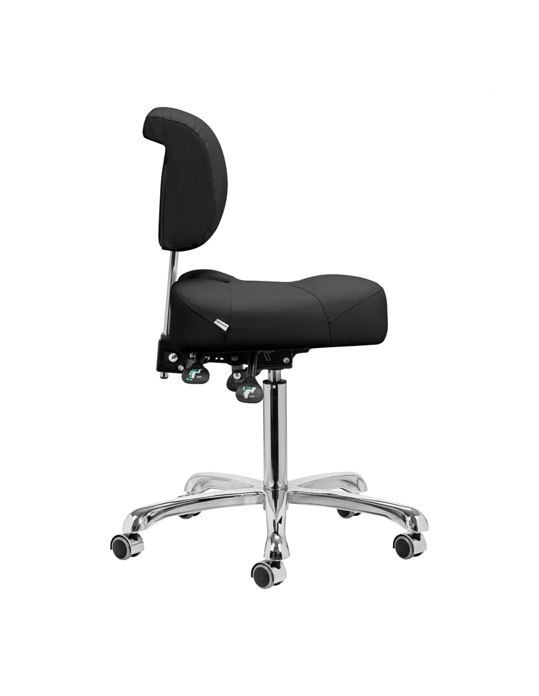 Możliwość regulacji wysokości w zakresie 55-72 cm pozwala przybrać odpowiednią pozycję w trakcie wykonywania usług. Perfekcyjnie wyprofilowane oparcie z regulacją zapewnia optymalne wsparcie dla odcinka lędźwiowego, minimalizując zmęczenie podczas długotrwałej pracy. Mechanizm pełnego obrotu, że praca staje się bardziej efektywna i wygodna. Taboret posiada również funkcję kołyski z możliwością blokady, co pozwala na ergonomiczne ustawienie ciała. Siedzisko zapewnia regulację pochylenia oraz wysokości dzięki siłownikom gazowym. Dodatkowo wysokość oparcia można manualnie dostosować dla pełnej wygody użytkowania.