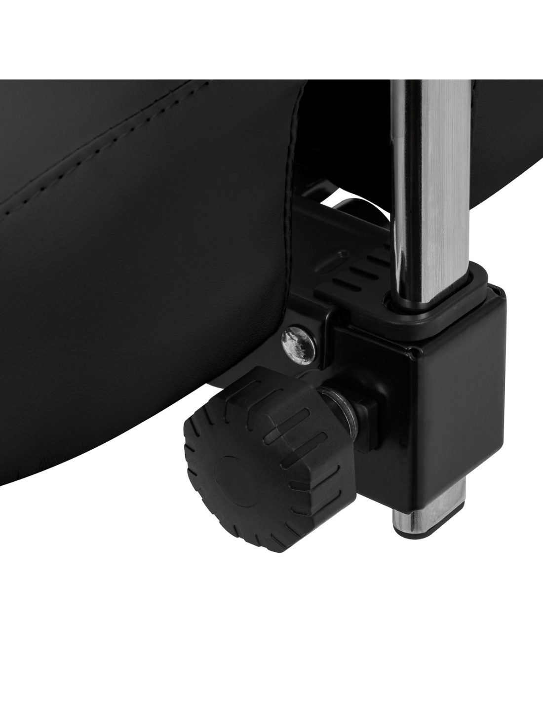 Pięcioramienna, solidna podstawa zapewnia wyjątkową stabilność taboretu, nawet podczas intensywnego użytkowania. Gumowane kółka umożliwiają jego łatwe i płynne przemieszczanie, nie niszcząc przy tym podłogi. Krzesło cechuje się trwałością i stabilnością, a jego obicie z wysokiej jakości imitacji skóry w odcieniach czerni jest odporne na wilgoć i łatwe do utrzymania w czystości, co dodatkowo podnosi komfort użytkowania.
