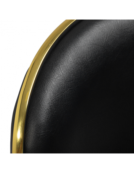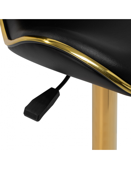 Pięcioramienna podstawa zapewnia stabilność, nawet podczas bardziej dynamicznych ruchów czy częstych zmian pozycji. Wyposażenie w wytrzymałe koła zapewnia wysoką mobilność, co pozwala na swobodne przemieszczanie się po salonie czy gabinecie. Obicie ze skóry syntetycznej w odcieniach czerni, które jest nie tylko trwałe, ale także łatwe do utrzymania w czystości. Estetyczne złote elementy dodają luksusowego charakteru i przyciągają wzrok. Wyjątkowe połączenie elegancji oraz komfortu czyni taboret niezastąpionym narzędziem w pracy każdego profesjonalisty.