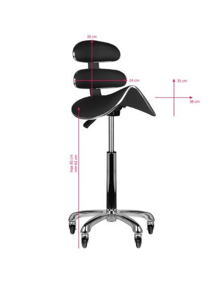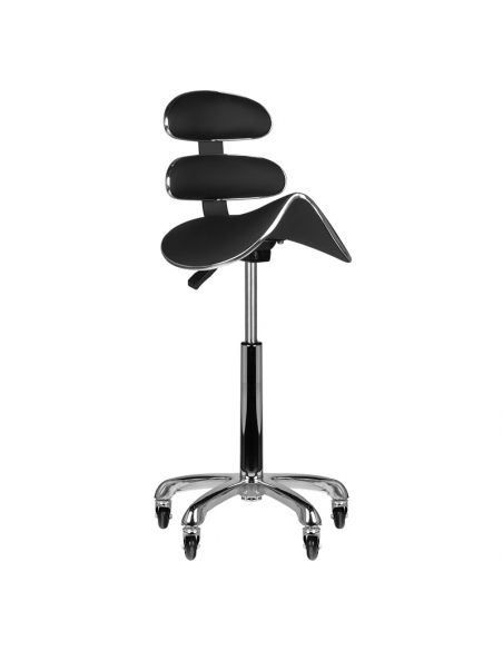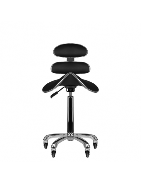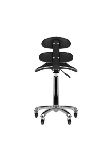 Wygodny, stabilny taboret kosmetyczny/fryzjerski z profilowanym siedziskiem i ergonomicznym oparciem. Osadzony na pięcioramiennej podstawie z rewelacyjnymi kauczukowymi i łożyskowanymi kółkami Roll Speed, które gwarantują lekkość w przemieszczaniu się. Wykonany z eko-skóry w kolorze czarnym.