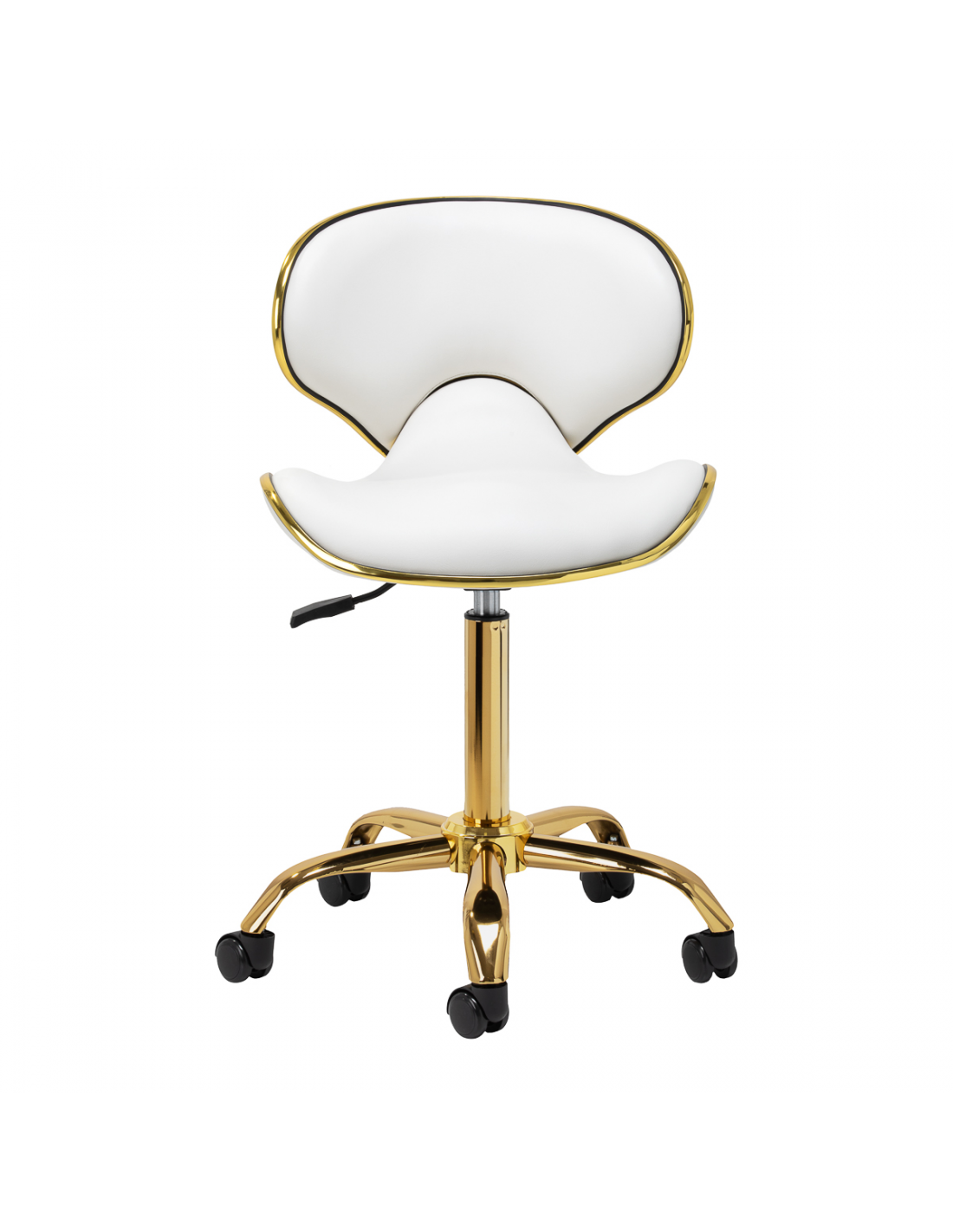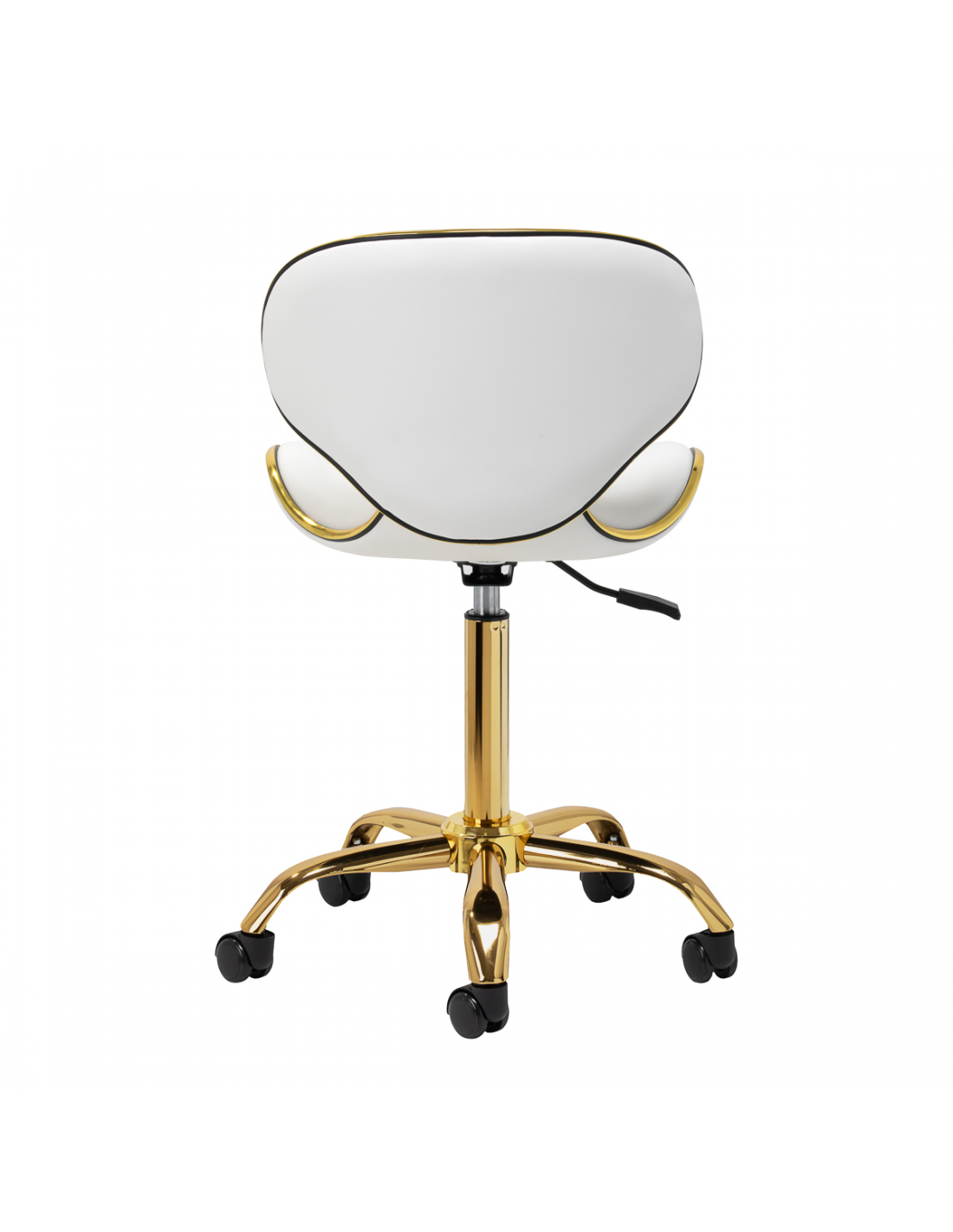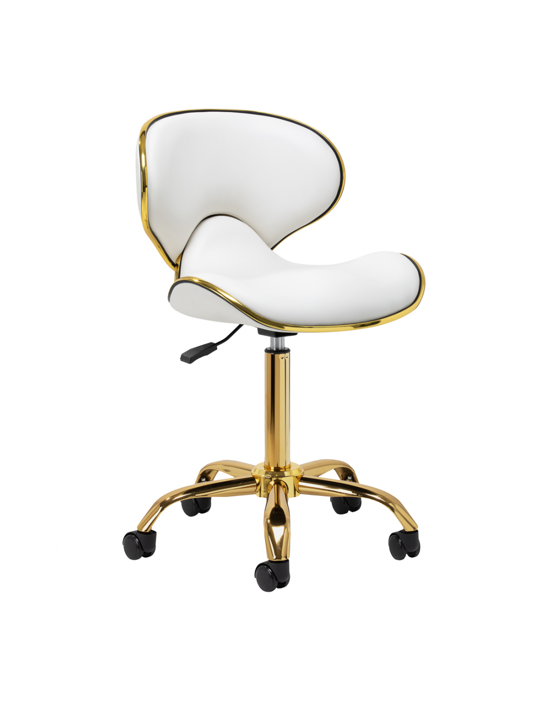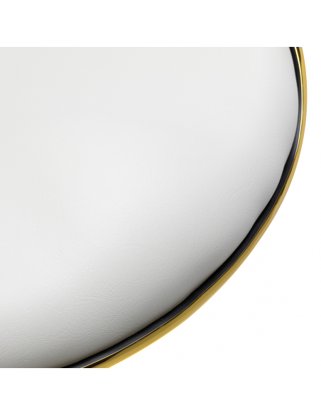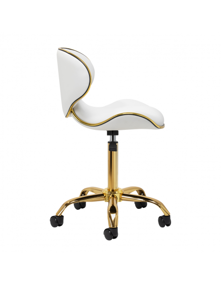 Pięcioramienna podstawa zapewnia stabilność, nawet podczas bardziej dynamicznych ruchów czy częstych zmian pozycji. Wyposażenie w wytrzymałe koła zapewnia wysoką mobilność, co pozwala na swobodne przemieszczanie się po salonie czy gabinecie. Obicie ze skóry syntetycznej w odcieniach bieli, które jest nie tylko trwałe, ale także łatwe do utrzymania w czystości. Estetyczne złote elementy dodają luksusowego charakteru i przyciągają wzrok. Wyjątkowe połączenie elegancji oraz komfortu czyni taboret niezastąpionym narzędziem w pracy każdego profesjonalisty.