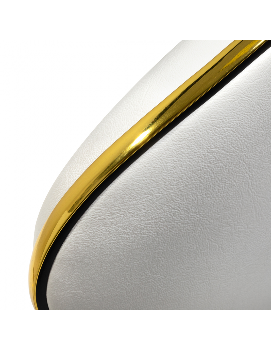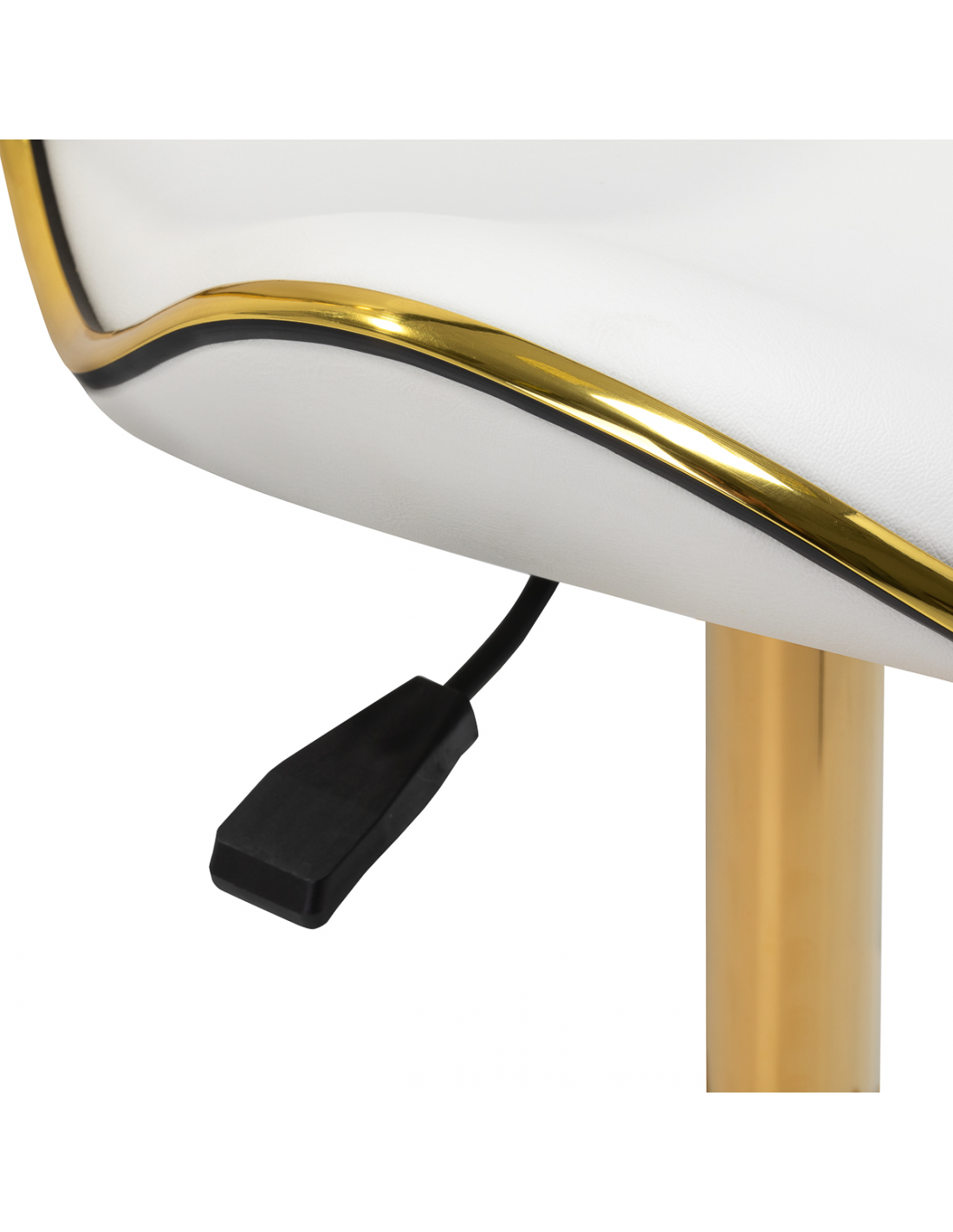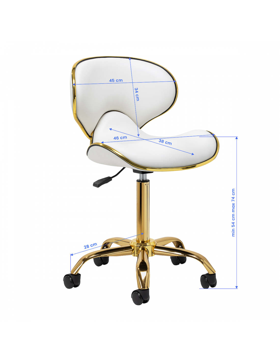 Pięcioramienna podstawa zapewnia stabilność, nawet podczas bardziej dynamicznych ruchów czy częstych zmian pozycji. Wyposażenie w wytrzymałe koła zapewnia wysoką mobilność, co pozwala na swobodne przemieszczanie się po salonie czy gabinecie. Obicie ze skóry syntetycznej w odcieniach bieli, które jest nie tylko trwałe, ale także łatwe do utrzymania w czystości. Estetyczne złote elementy dodają luksusowego charakteru i przyciągają wzrok. Wyjątkowe połączenie elegancji oraz komfortu czyni taboret niezastąpionym narzędziem w pracy każdego profesjonalisty.