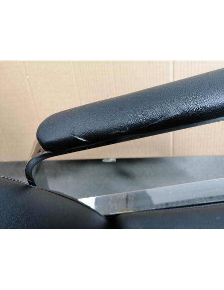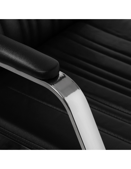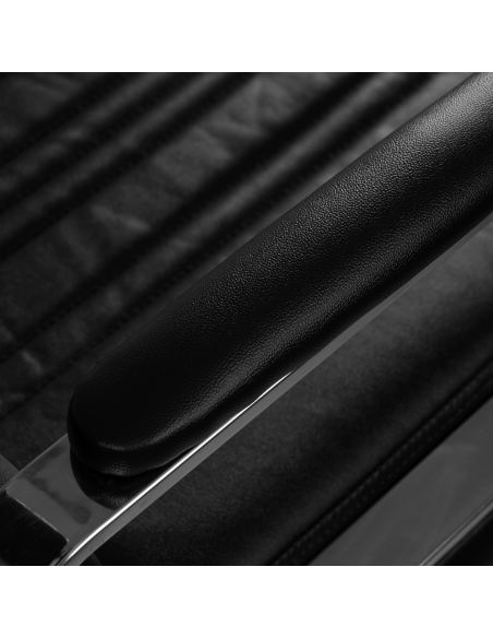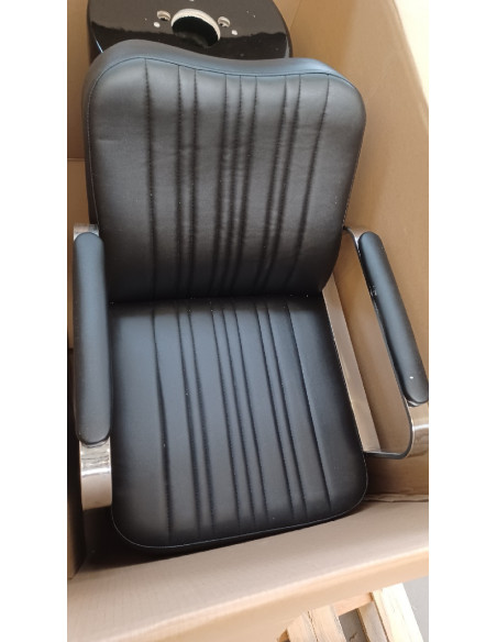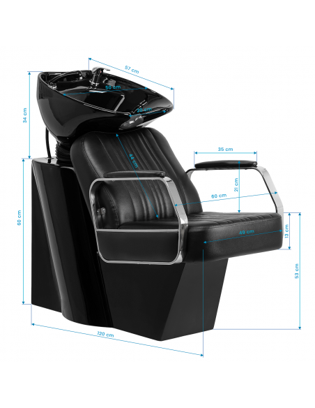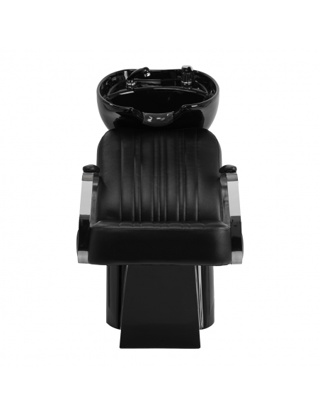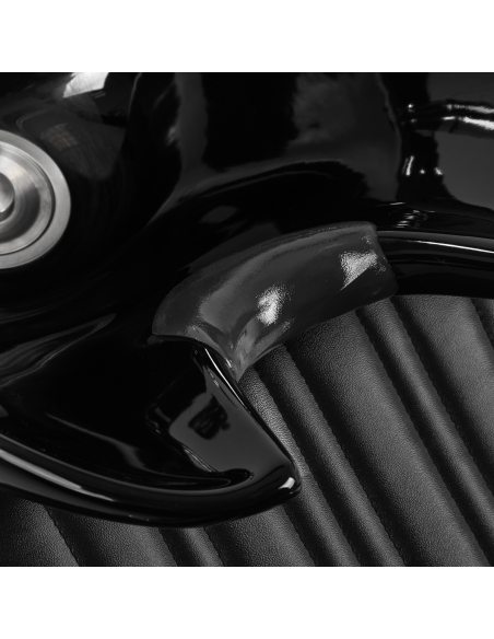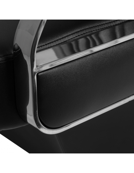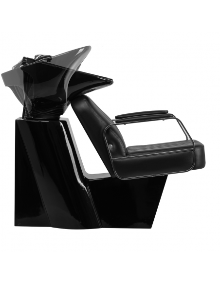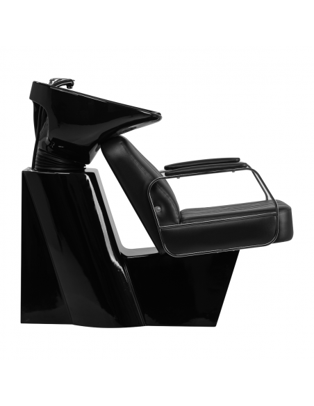 Wyprofilowany fotel wypełniony trwałą pianką zapewnia komfort użytkowania, a tapicerowane podłokietniki ułatwiają prawidłowe ułożenie barków klienta. Oparcie umieszczone pod optymalnym kątem sprzyja doskonałemu wsparciu kręgosłupa. Pokrycie ze skóry syntetycznej w odcieniach czerni gwarantuje wieloletnią wytrzymałość oraz łatwość czyszczenia. Stylowe przeszycia na tapicerce nadają myjni charakteru inspirowanego designem motoryzacyjnym, podkreślając jej efektowny wygląd. W zestawie znajduje się kompletna armatura w odcieniach chromu i czerni, w tym bateria, słuchawka prysznicowa oraz dedykowane węże, aby zapewnić całkowity zestaw narzędzi do pracy.