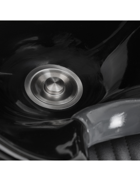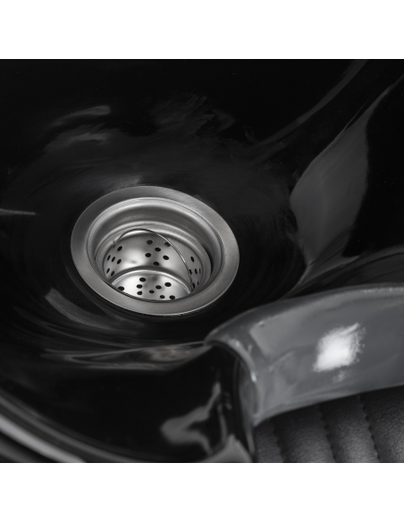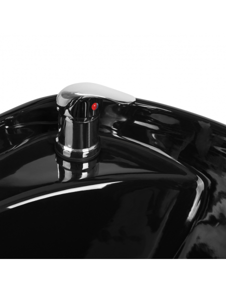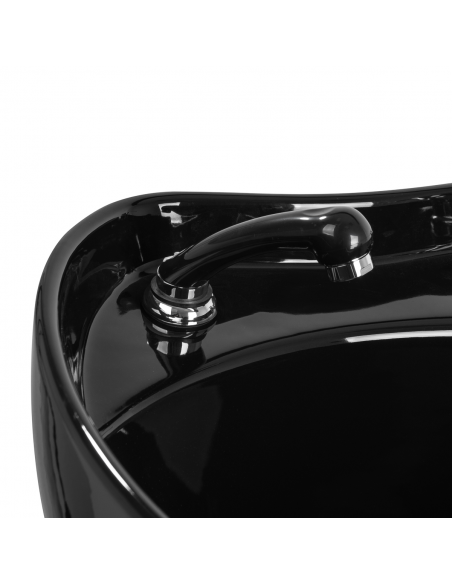 Głęboka ceramiczna misa umywalki w odcieniach czerni zapobiega nadmiernemu rozchlapywaniu wody oraz preparatów używanych podczas zabiegów. Pozwala to na komfortowe i efektywne wykonywanie szerokiej gamy usług fryzjerskich. Ruchomość misy ułatwia dopasowanie kąta jej nachylenia do indywidualnych potrzeb. Zastosowany materiał sprawia, że umywalka jest wytrzymała, odporna na przebarwienia i zadrapania oraz bardzo łatwa do utrzymania w czystości. Odpowiednio wyprofilowany kołnierz misy zapewnia optymalne wsparcie oraz wygodę w trakcie mycia włosów, a komfortowa nakładka z tworzywa sztucznego w odcieniach czerni sprawia, że klient nie odczuje nieprzyjemności związanych z chłodem ceramicznej powierzchni.