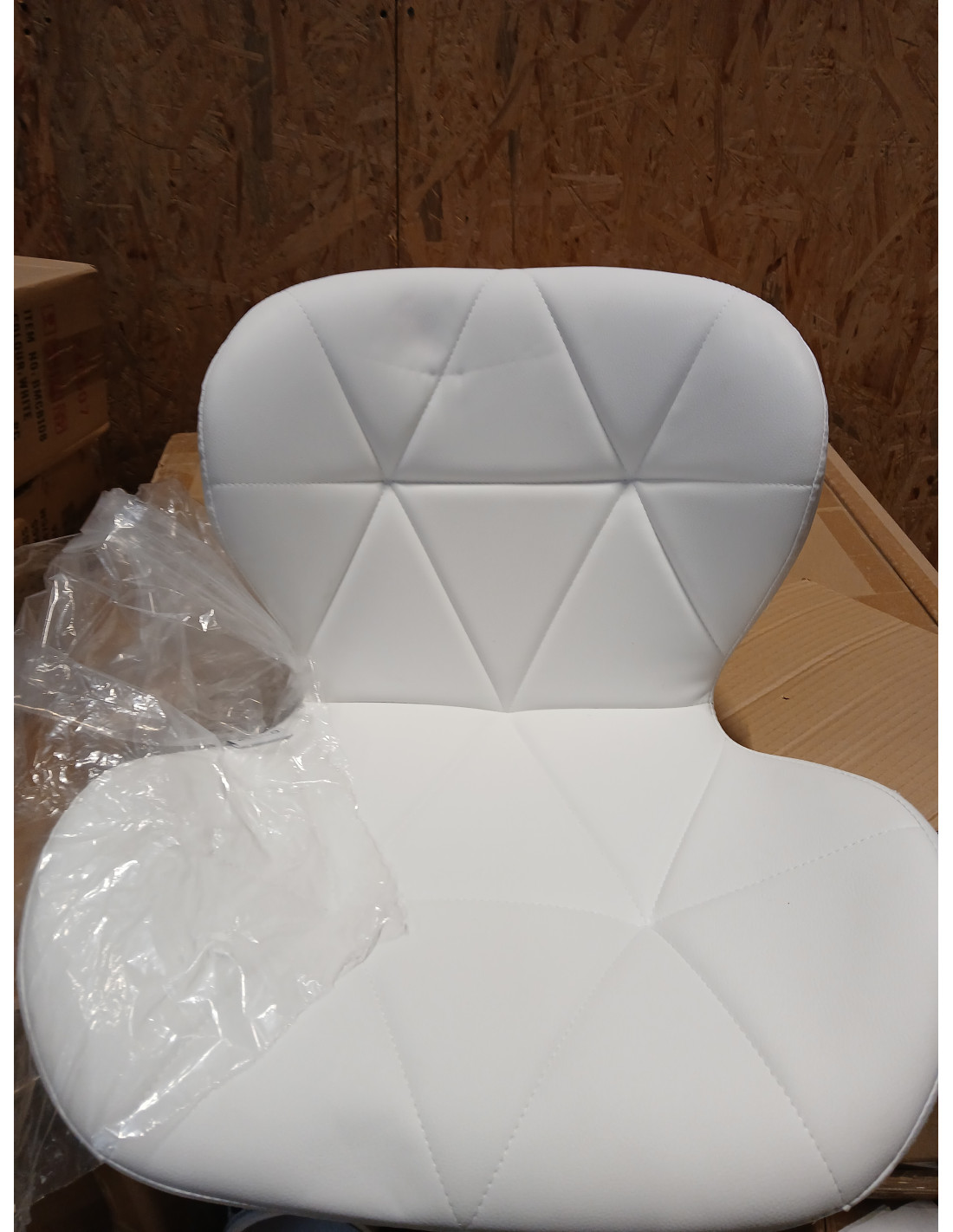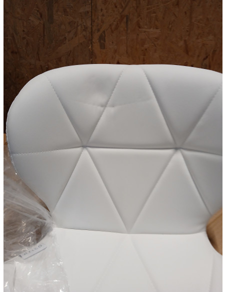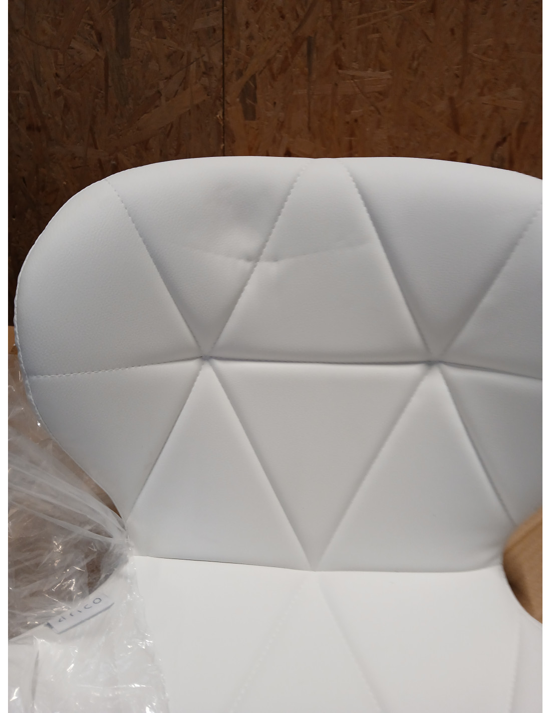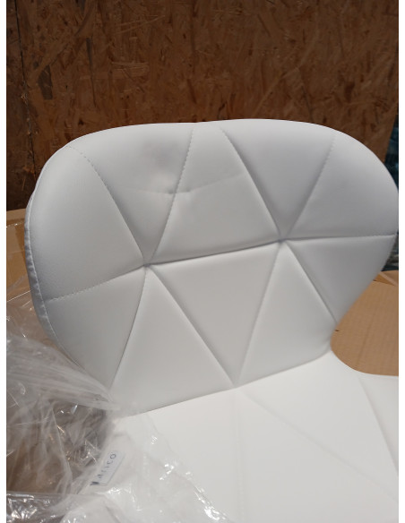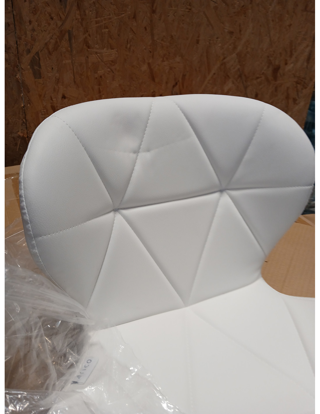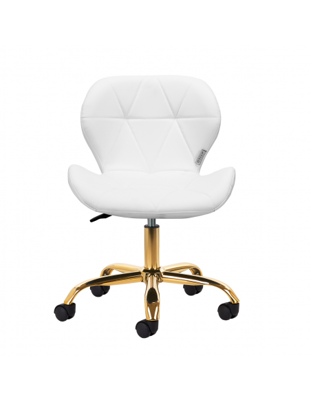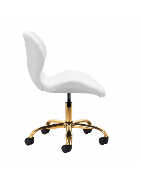 Pięcioramienna podstawa w odcieniach złota wyposażona jest w plastikowe kółka, które zapewniają znaczną mobilność, umożliwiając swobodne przemieszczanie mebla po gabinecie. Siedzisko taboretu zostało obite przyjemną w dotyku imitacją skóry w eleganckim odcieniu bieli. Zastosowany materiał gwarantuje trwałość, odporność na wilgoć oraz łatwość w utrzymaniu czystości. Całość dopełniają stylowe przeszycia, które podkreślają nowoczesny design.