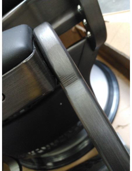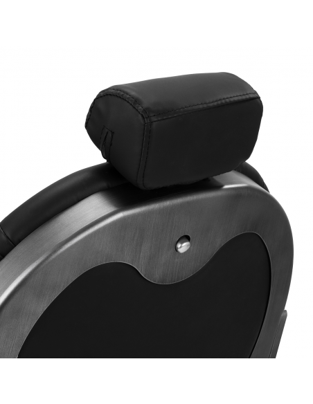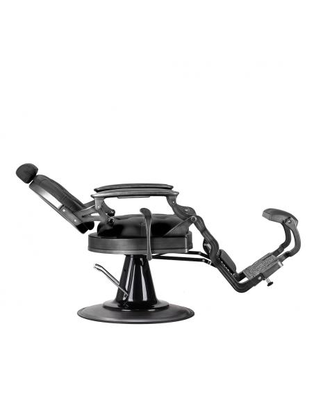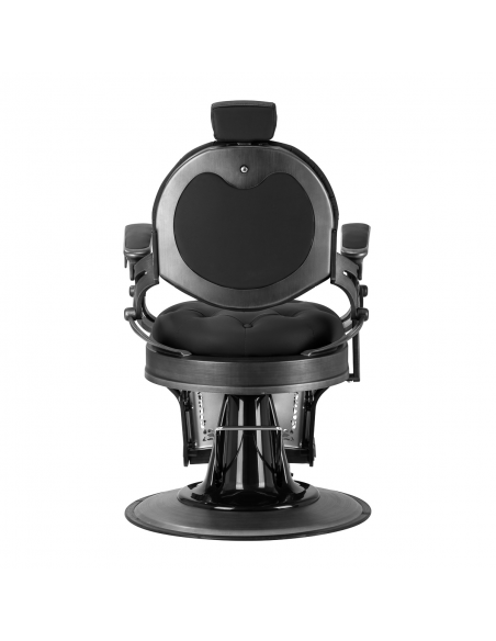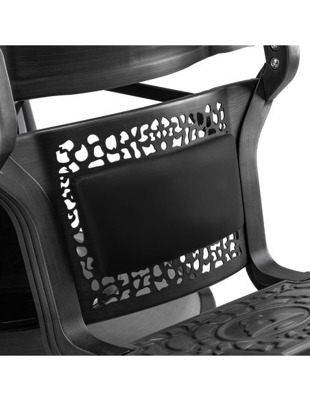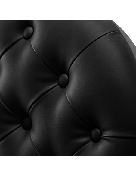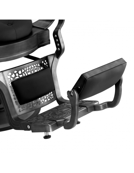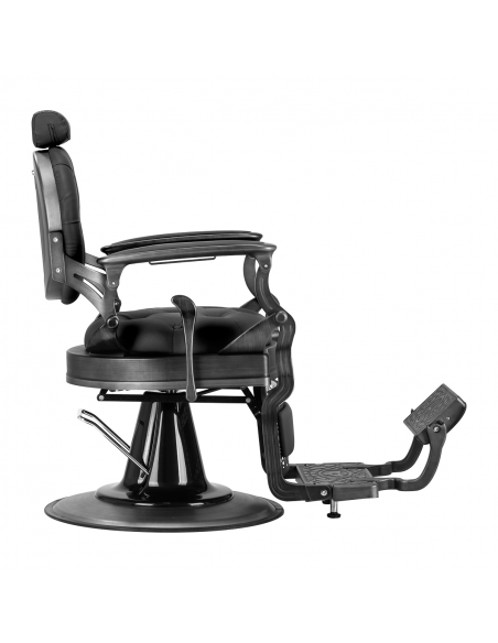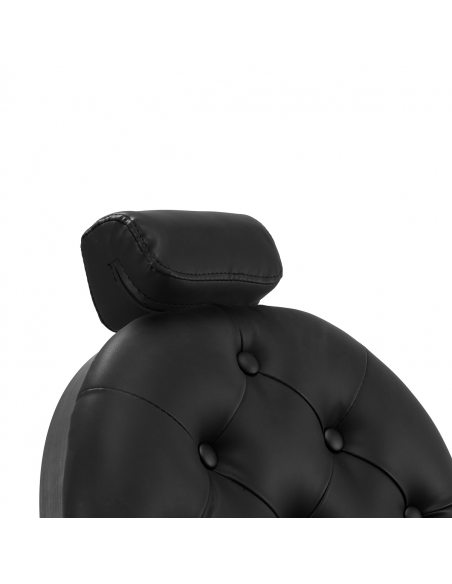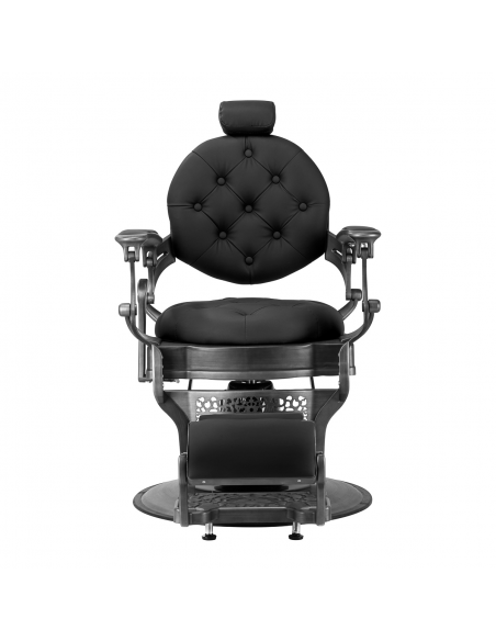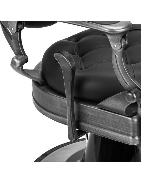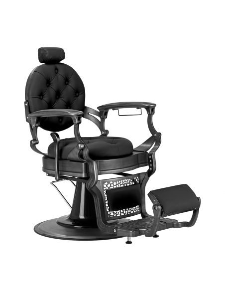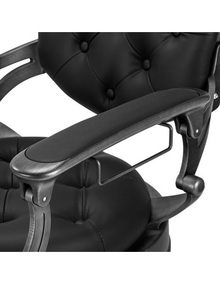 Solidna konstrukcja podstawy zapewnia stabilność oraz wysoki komfort użytkowania. Wypełnienie siedziska z trwałej, odpornej na odkształcenia pianki oraz obicie wykonane z przyjemnej w dotyku skóry syntetycznej o matowym wykończeniu zapewniają trwałość mebla oraz jego komfortowe użytkowanie przez długi czas. Zastosowane materiały sprawiają również, że sprzęt jest odporny na wilgoć, wytrzymały oraz łatwy do czyszczenia. Pokrycie w odcieniach czerni z pikowaniem i ozdobnymi guzikami oraz zdobiony podnóżek nadają mu wyjątkowego charakteru. Fotel o charakterystycznym designie, nawiązującym do stylu vintage, doskonale pasuje do klimatu salonów barberskich, podkreślając ich wyjątkową atmosferę.