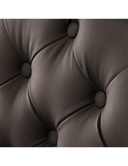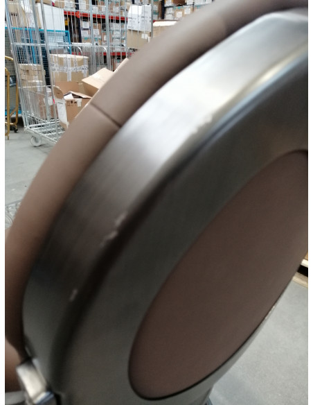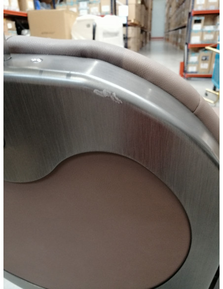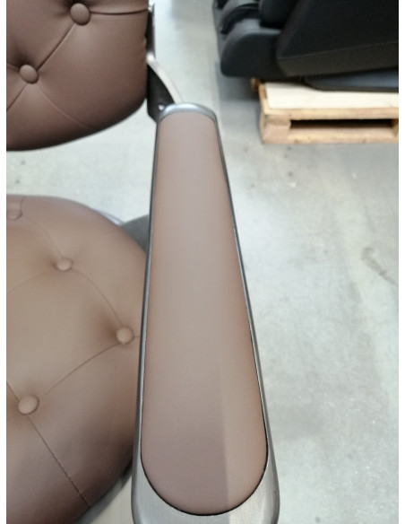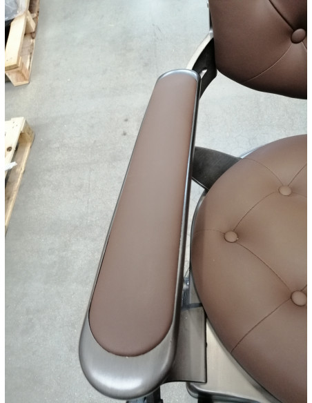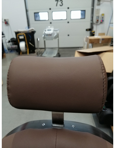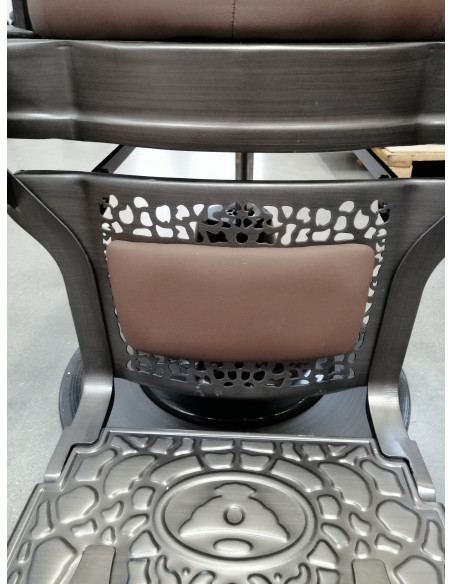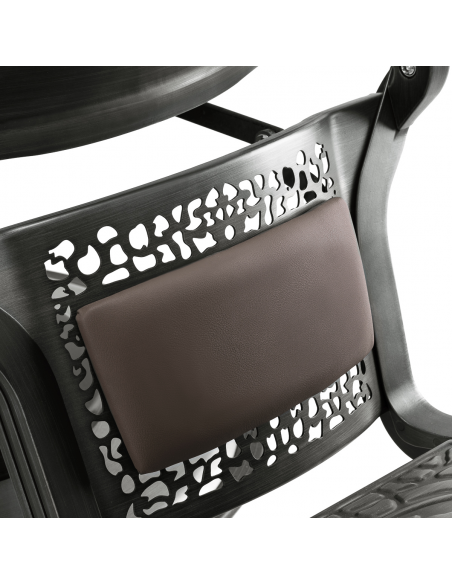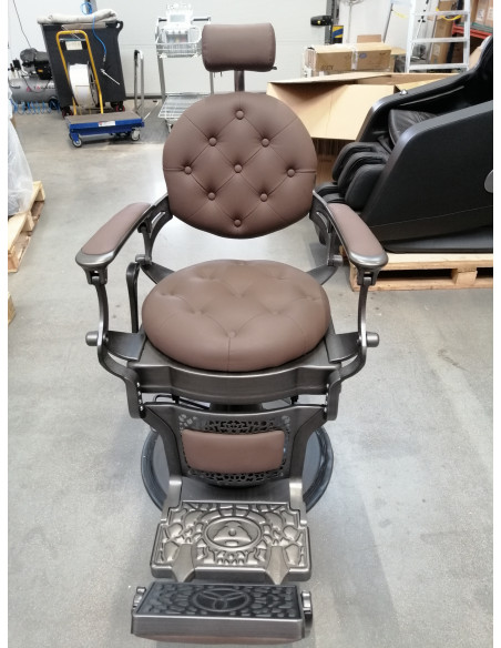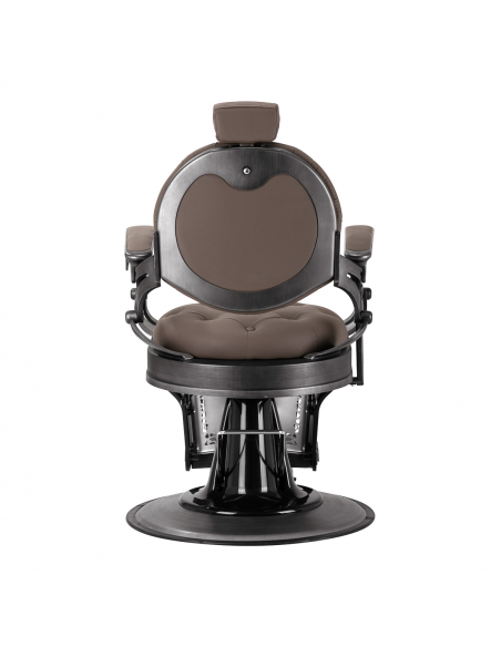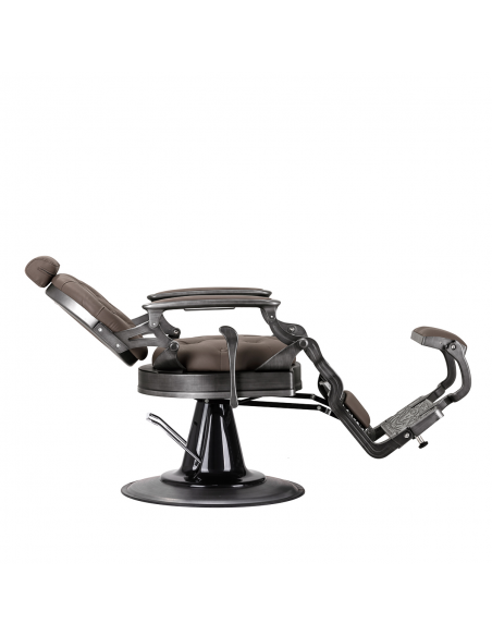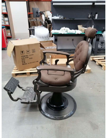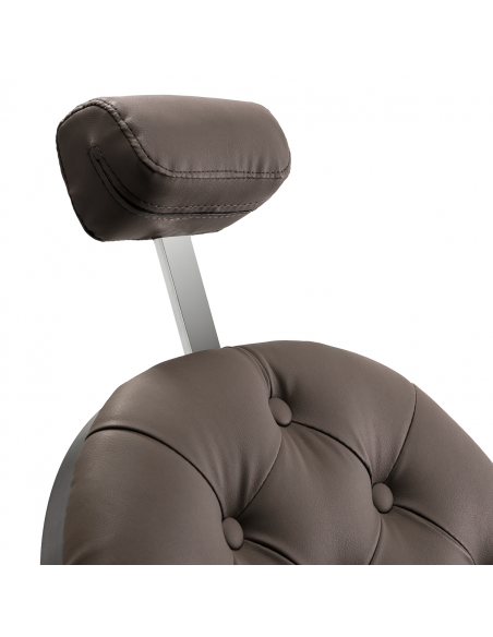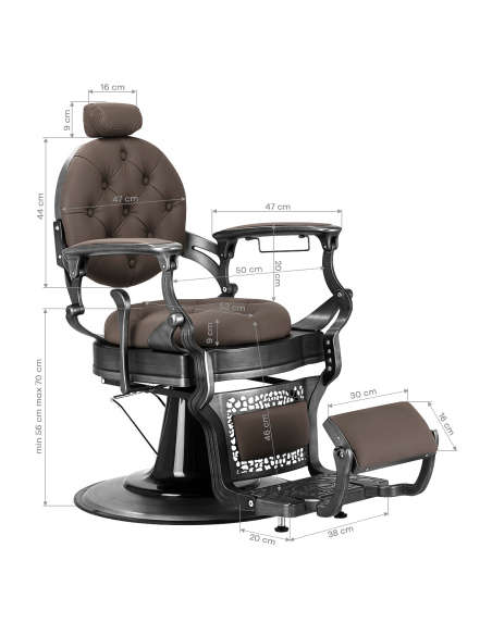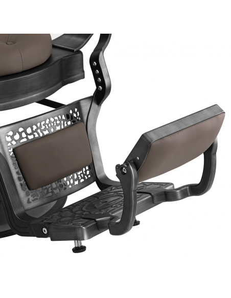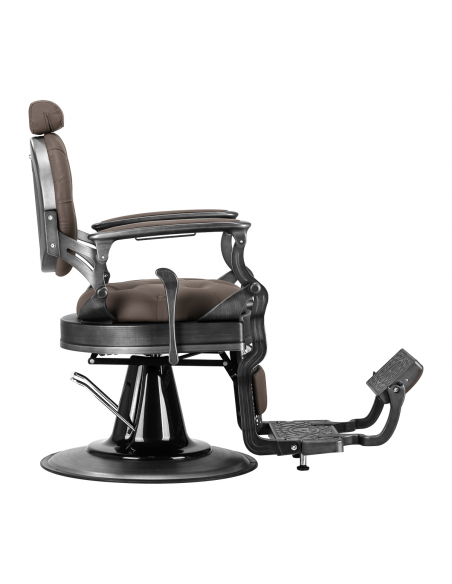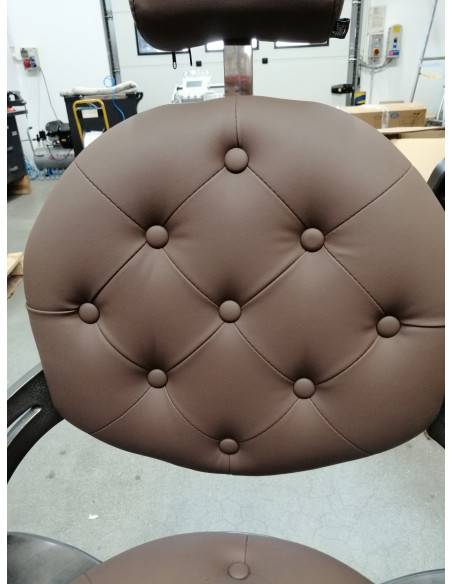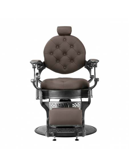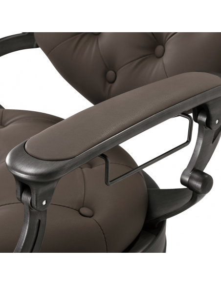 Solidna konstrukcja podstawy zapewnia stabilność oraz wysoki komfort użytkowania. Wypełnienie siedziska z trwałej, odpornej na odkształcenia pianki oraz obicie wykonane z przyjemnej w dotyku skóry syntetycznej o matowym wykończeniu zapewniają trwałość mebla oraz jego komfortowe użytkowanie przez długi czas. Zastosowane materiały sprawiają również, że sprzęt jest odporny na wilgoć, wytrzymały oraz łatwy do czyszczenia. Pokrycie w odcieniach brązu z pikowaniem i ozdobnymi guzikami oraz zdobiony podnóżek nadają mu wyjątkowego charakteru. Fotel o charakterystycznym designie, nawiązującym do stylu vintage, doskonale pasuje do klimatu salonów barberskich, podkreślając ich wyjątkową atmosferę.