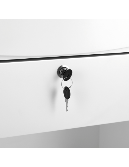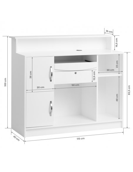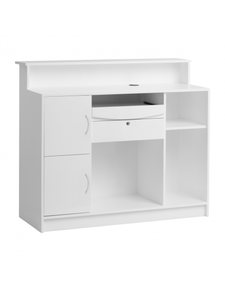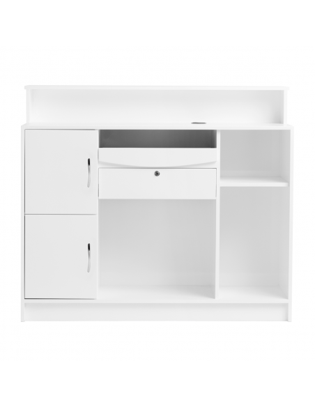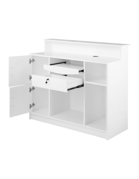Recepcja jest zaprojektowana w taki sposób, by stanowić jak najbardziej pojemny i praktyczny element umeblowania. Dla wygody korzystania została wyposażona w: trzy różnego rozmiaru otwarte półki, jedną półkę wysuwaną, szufladę zamykaną na klucz oraz dwie zamykane szafki z estetycznymi uchwytami w odcieniach srebra. Przestrzenie zostały rozplanowane w taki sposób, by jak najbardziej ułatwić organizację oraz zachowanie porządku w miejscu, w którym zgromadzone są wszystkie ważne dokumenty.