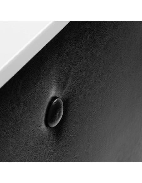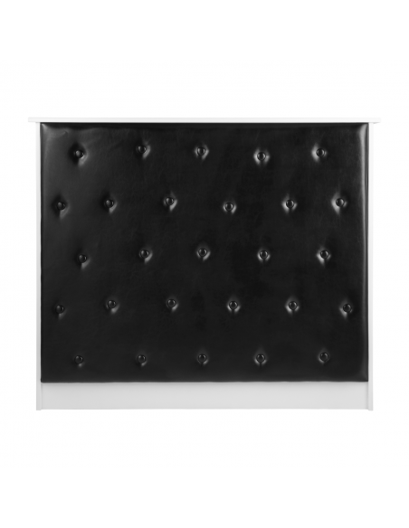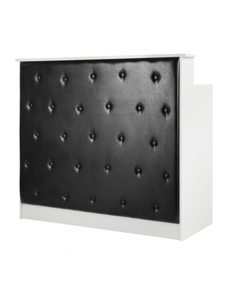 Mebel ten wykonano z wysokiej jakości, trwałej płyty laminowanej w odcieniach bieli, a gładkie powierzchnie nie sprawiają problemów w utrzymaniu czystości – w razie zabrudzenia wystarczy przetrzeć je wilgotną ściereczką. Ozdobna część frontalna została obita skórą syntetyczną w odcieniach czerni, co nadaje jej stylowego sznytu, zapewnia trwałość mebla oraz łatwość czyszczenia. Ozdobne guziki dodają elegancji i wyjątkowości, podkreślając charakter wnętrza. Recepcja została starannie wykonana, jest stabilna, a zastosowane materiały pozwalają na wieloletnie efektywne użytkowanie.