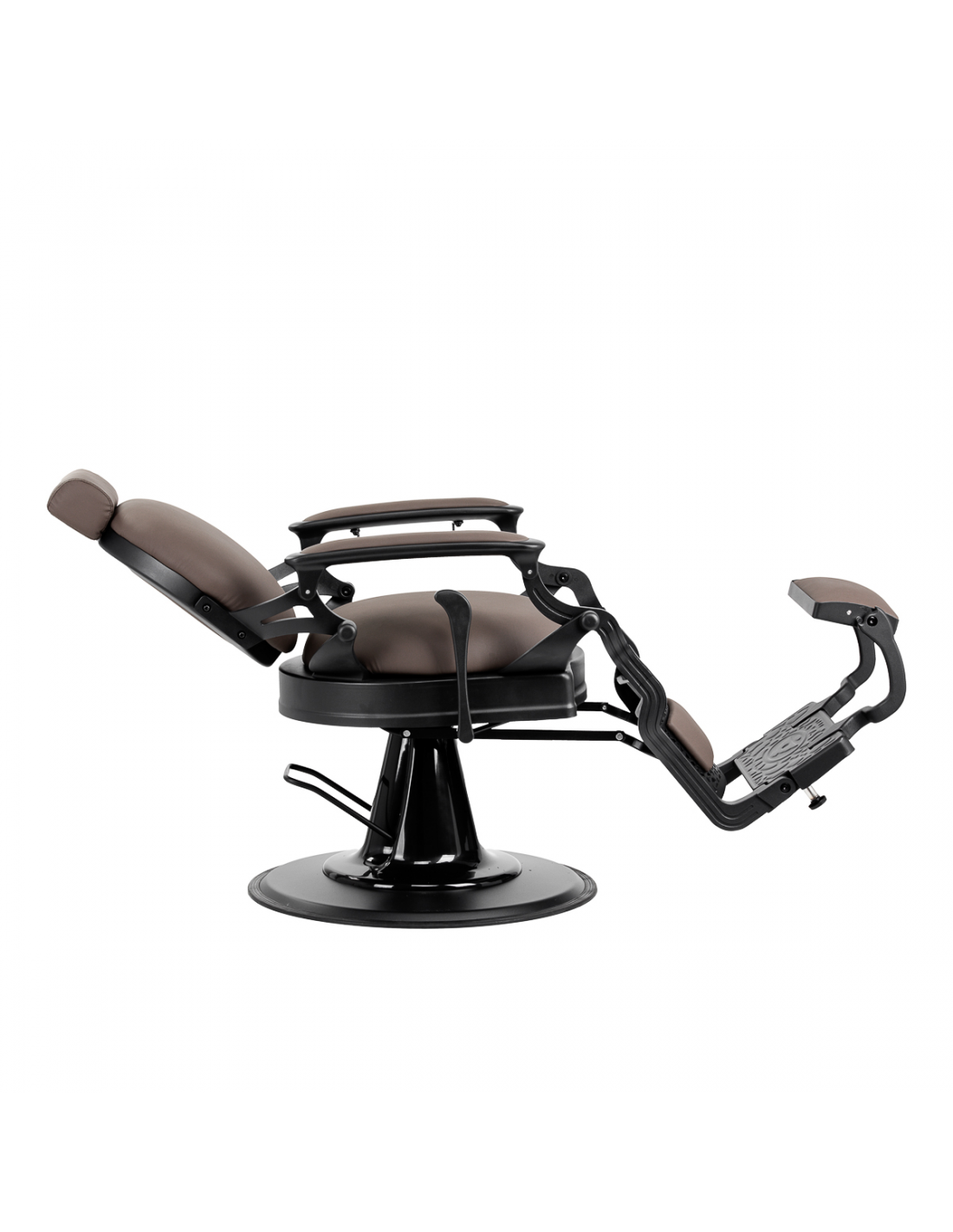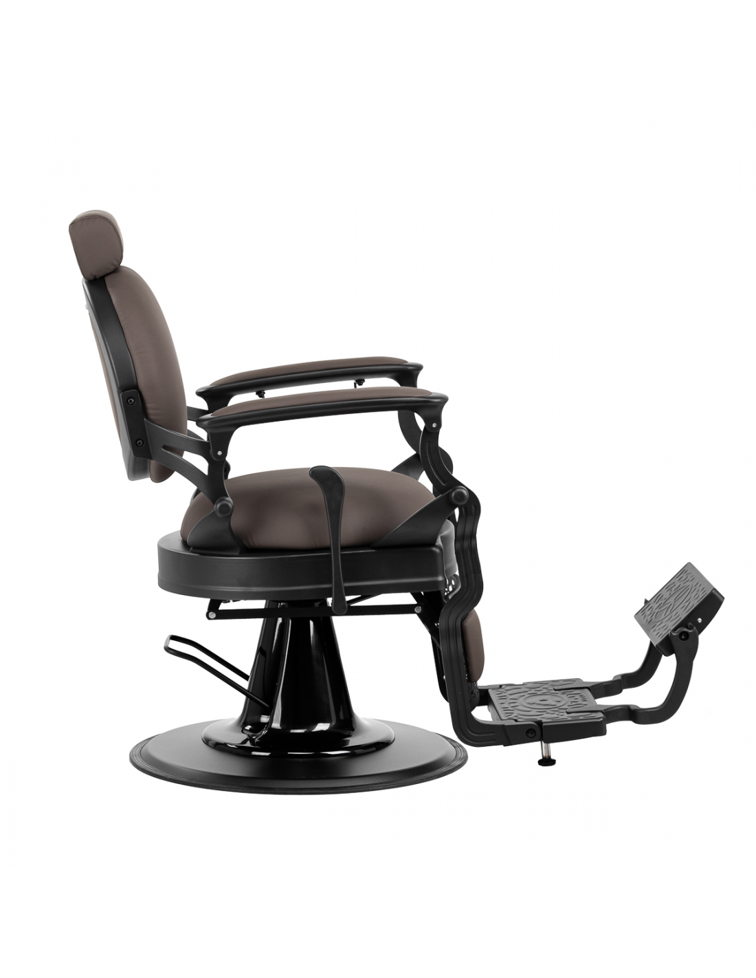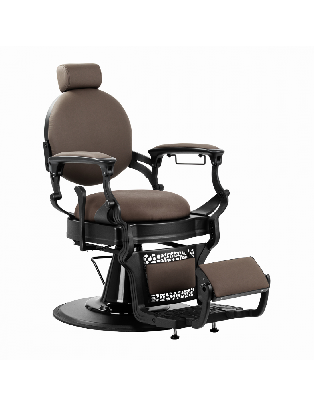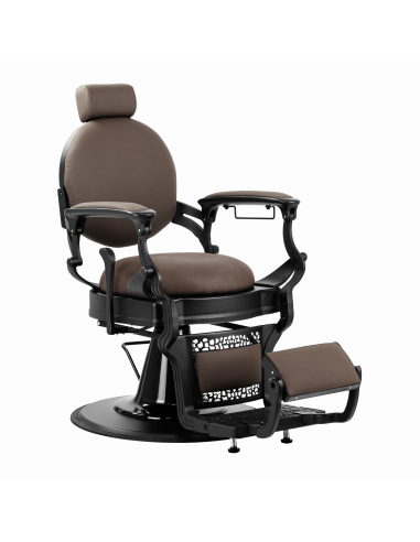 Solidna konstrukcja podstawy zapewnia stabilność oraz wysoki komfort użytkowania. Wypełnienie siedziska z trwałej, odpornej na odkształcenia pianki oraz obicie wykonane z przyjemnej w dotyku skóry syntetycznej o matowym wykończeniu zapewniają trwałość mebla oraz jego komfortowe użytkowanie przez długi czas. Zastosowane materiały sprawiają również, że sprzęt jest odporny na wilgoć, wytrzymały oraz łatwy do czyszczenia. Pokrycie w odcieniach brązu oraz zdobiony podnóżek nadają mu wyjątkowego charakteru. Fotel o charakterystycznym designie, nawiązującym do stylu vintage, doskonale pasuje do klimatu salonów barberskich, podkreślając ich wyjątkową atmosferę.