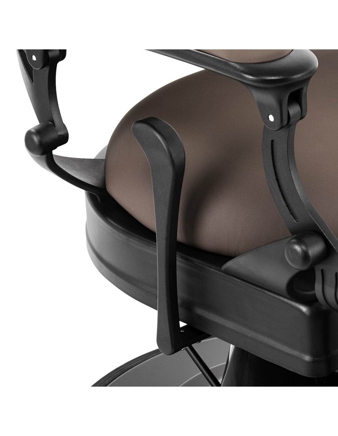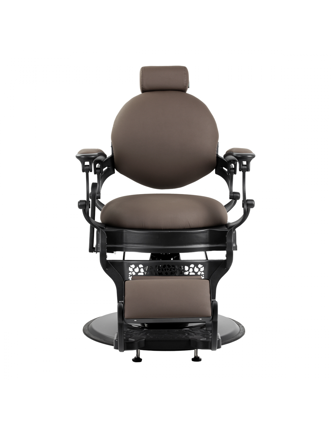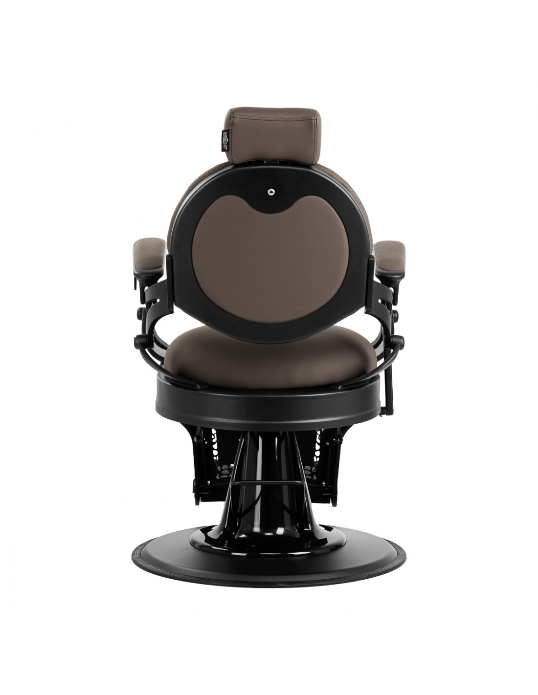 Solidna konstrukcja podstawy zapewnia stabilność oraz wysoki komfort użytkowania. Wypełnienie siedziska z trwałej, odpornej na odkształcenia pianki oraz obicie wykonane z przyjemnej w dotyku skóry syntetycznej o matowym wykończeniu zapewniają trwałość mebla oraz jego komfortowe użytkowanie przez długi czas. Zastosowane materiały sprawiają również, że sprzęt jest odporny na wilgoć, wytrzymały oraz łatwy do czyszczenia. Pokrycie w odcieniach brązu oraz zdobiony podnóżek nadają mu wyjątkowego charakteru. Fotel o charakterystycznym designie, nawiązującym do stylu vintage, doskonale pasuje do klimatu salonów barberskich, podkreślając ich wyjątkową atmosferę.